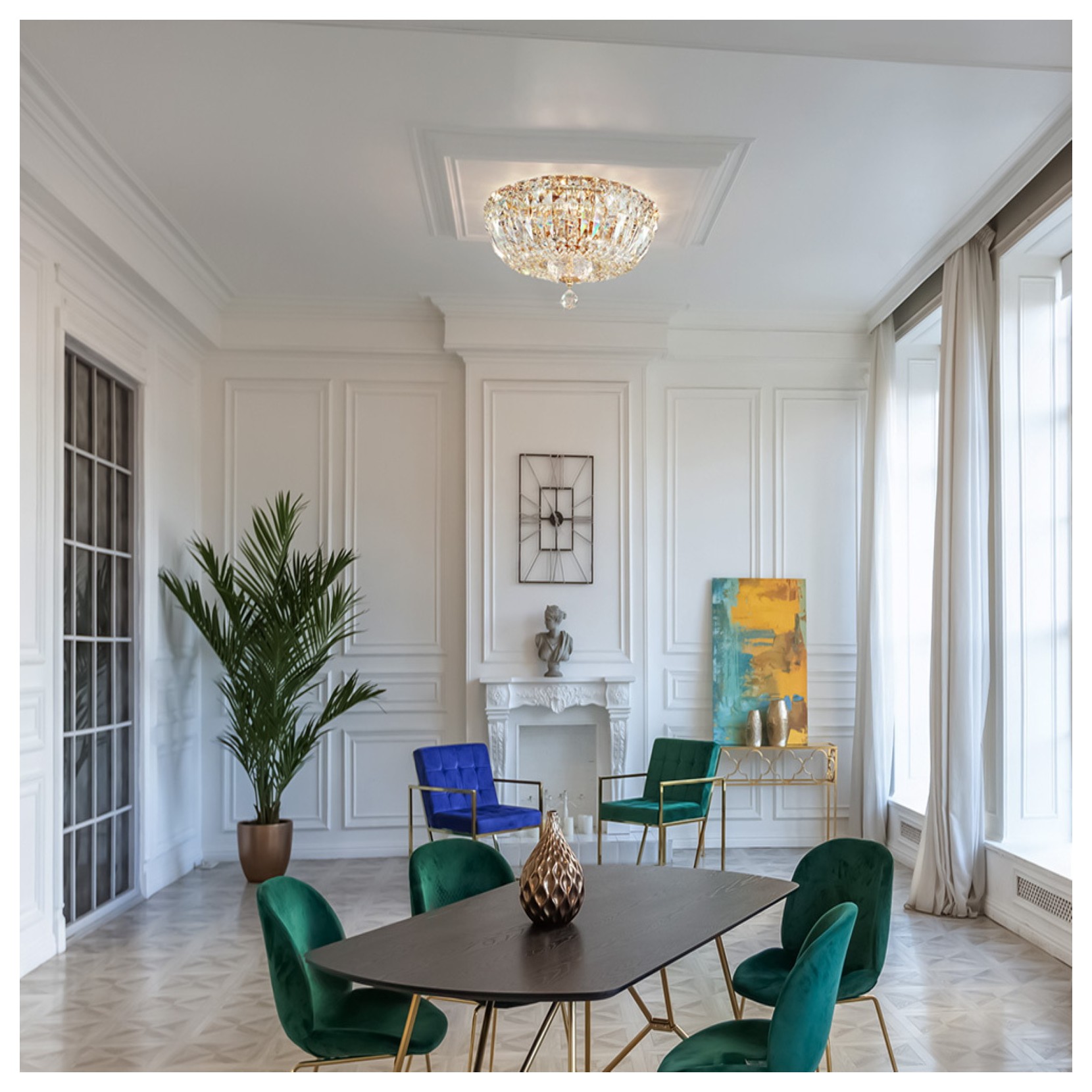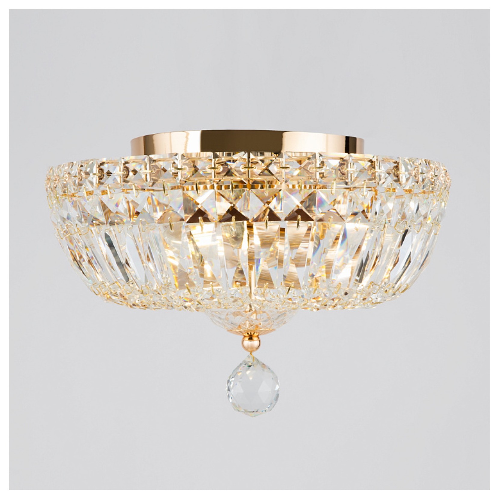 La lampada da parete BASFOR vede la combinazione di due materiali: metallo e vetro. La struttura in metallo riprende lo stile neoclassico nella finitura oro è arricchita dai vari motivi geometrici pendenti in cristallo.