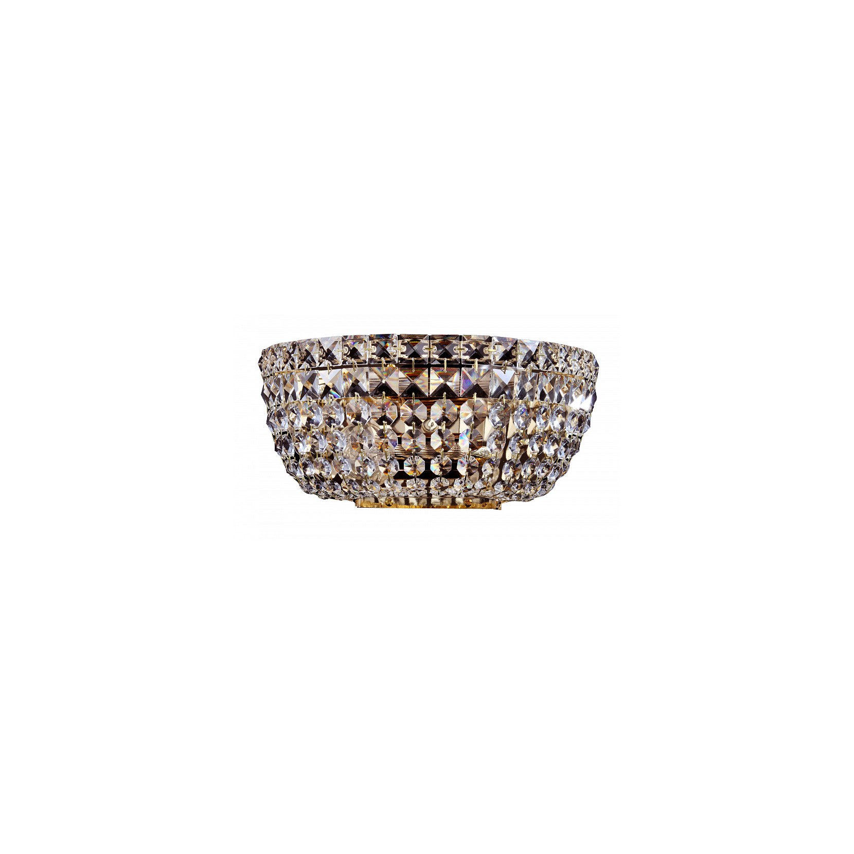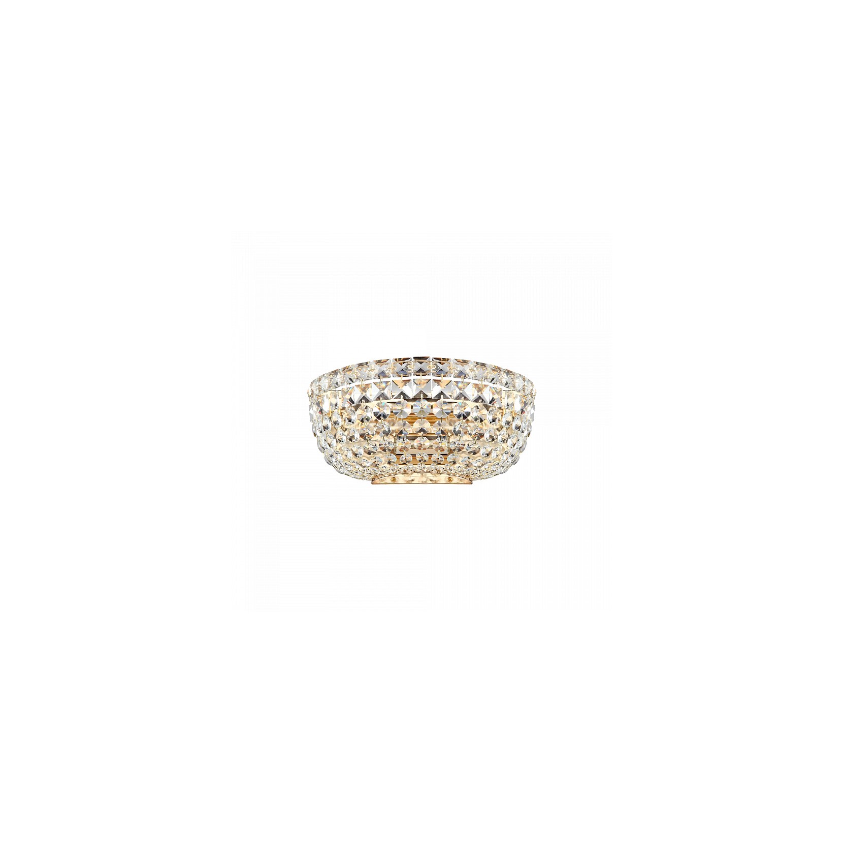 La lampada da parete BASFOR vede la combinazione di due materiali: metallo e vetro. La struttura in metallo riprende lo stile neoclassico nella finitura oro è arricchita dai vari motivi geometrici pendenti in cristallo.