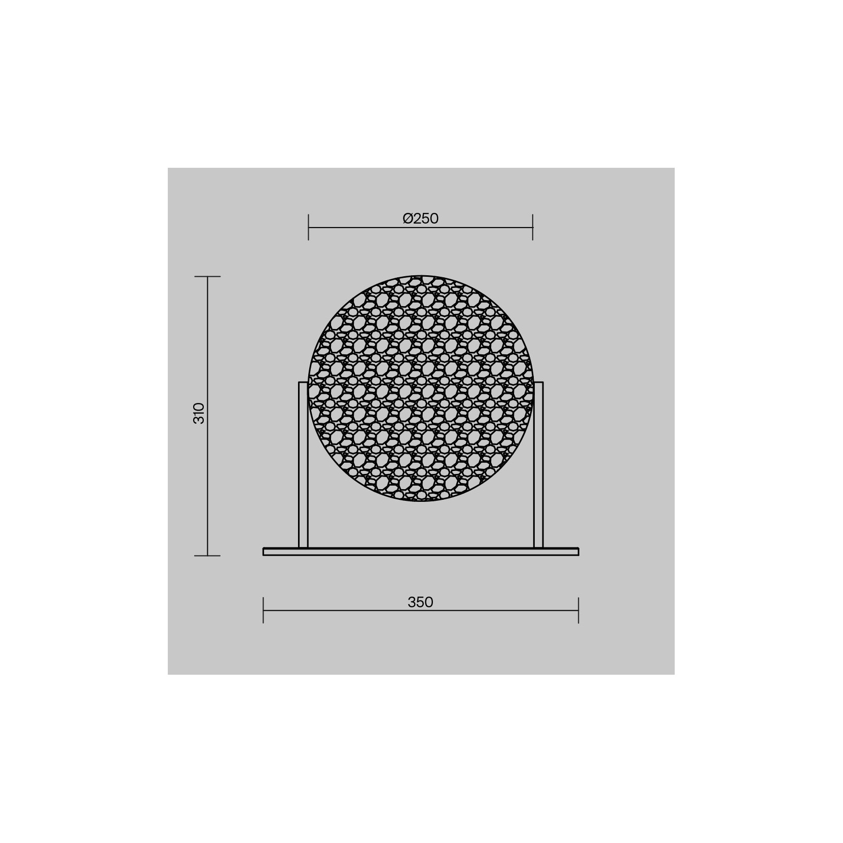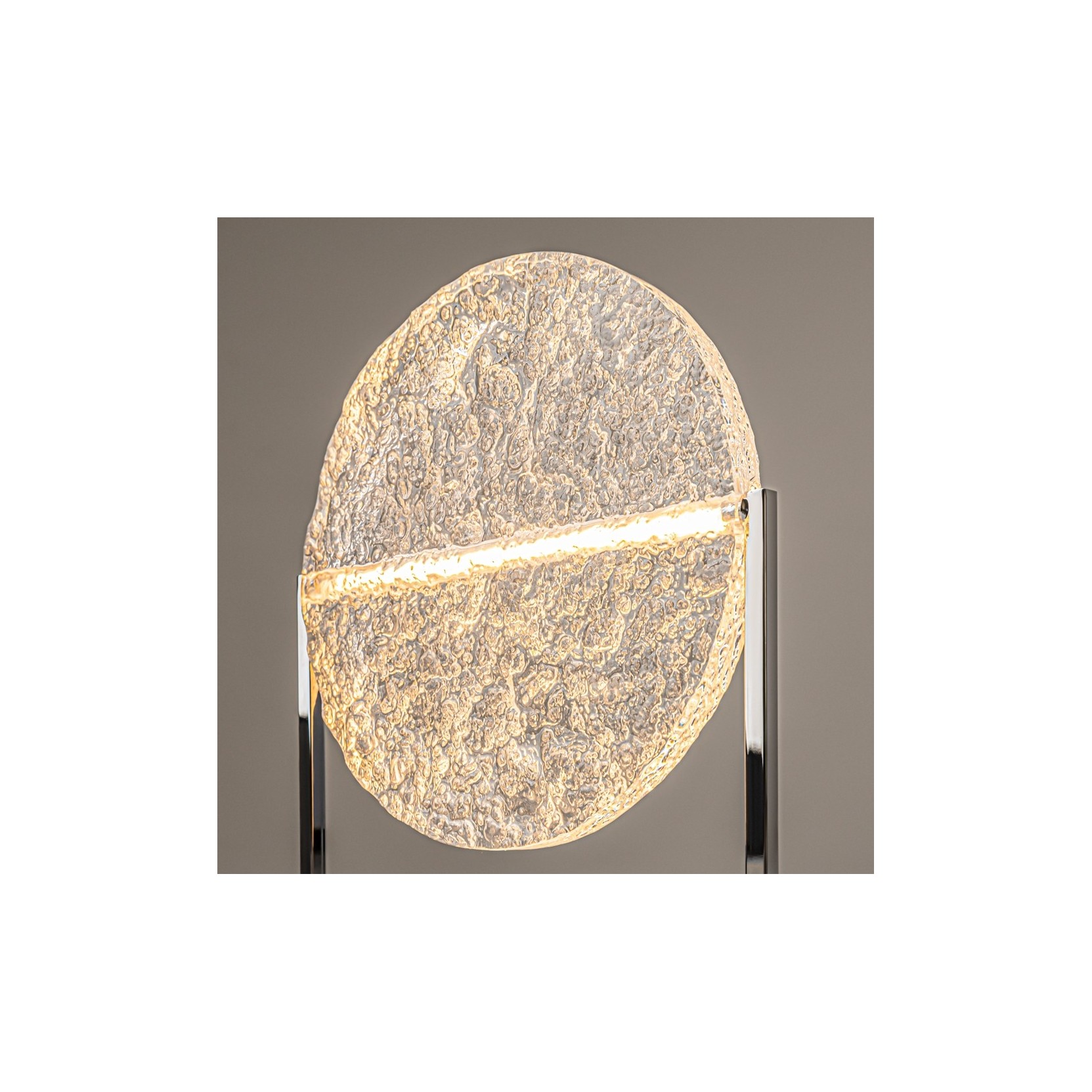 La lampada Mamgata si distingue per il suo ampio diffusore circolare in vetro artistico texturizzato, che ricorda la superficie irregolare del ghiaccio o dell'acqua increspata. Questa "lente" materica è attraversata orizzontalmente da una sottile barra luminosa a LED che, illuminandosi, enfatizza ogni dettaglio e increspatura del vetro, creando un effetto scenografico di luce vibrante. La struttura portante, dal profilo ultra-sottile in metallo cromato, incornicia il disco di vetro sollevandolo con estrema leggerezza da una base solida e minimalista coordinata.