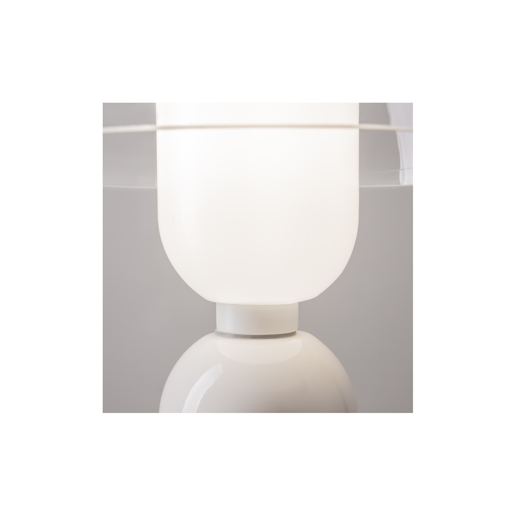 La lampada Memory si distingue per una silhouette iconica basata sul gioco di simmetrie e volumi contrapposti. La struttura è composta da una solida base cilindrica in metallo nero opaco (o ceramica tecnica), dalla quale si innalza uno stelo sottile che sostiene due diffusori a semisfera in vetro opalino bianco. Disposte in modo speculare, le due calotte creano una forma a clessidra stilizzata che diffonde la luce in modo armonioso sia verso l'alto che verso il basso.