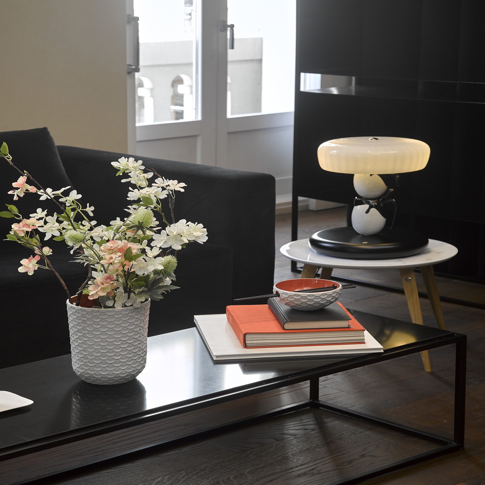 La collezione di lampade Hairstyle è stata ideata dal team di Lladró Atelier, il laboratorio di idee del marchio, in collaborazione con il designer giapponese Hisakazu Shimizu. Sono ispirati a personaggi storici giapponesi che dettano le tendenze per le loro favolose acconciature. Decorato in bianco e nero con tocchi di lucentezza dorata, gli schermi hanno soffiato in vetro di Murano in diversi strati che si ispirano i cappelli sandogasa"", utilizzati in Giappone medievale per la protezione solare durante i lunghi viaggi. La base è in legno laccato nero satinato.