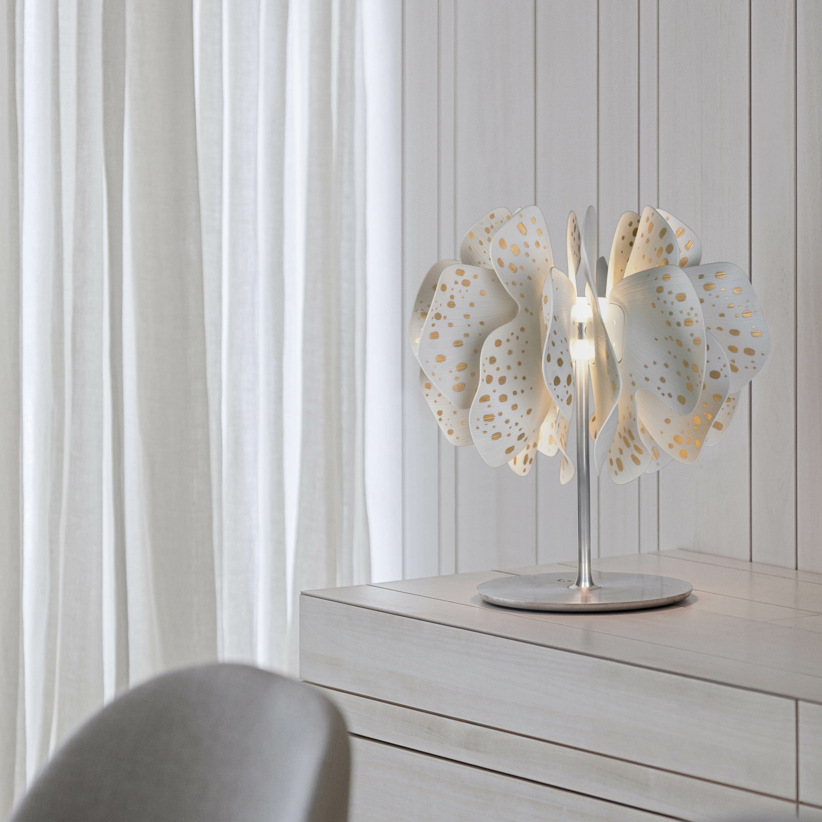 Quest'opera appartiene alla collezione di complementi per l'illuminazione creati da Marcel Wanders in collaborazione con Lladró. Un modello nuovo e contemporaneo che spicca per le sue forme organiche e sempre dinamiche ispirate alla natura, ma anche per l'effetto affascinante prodotto sui petali dalla luce che nasce al suo interno. Un'opera dal grande potenziale decorativo, realizzata a mano in Spagna.