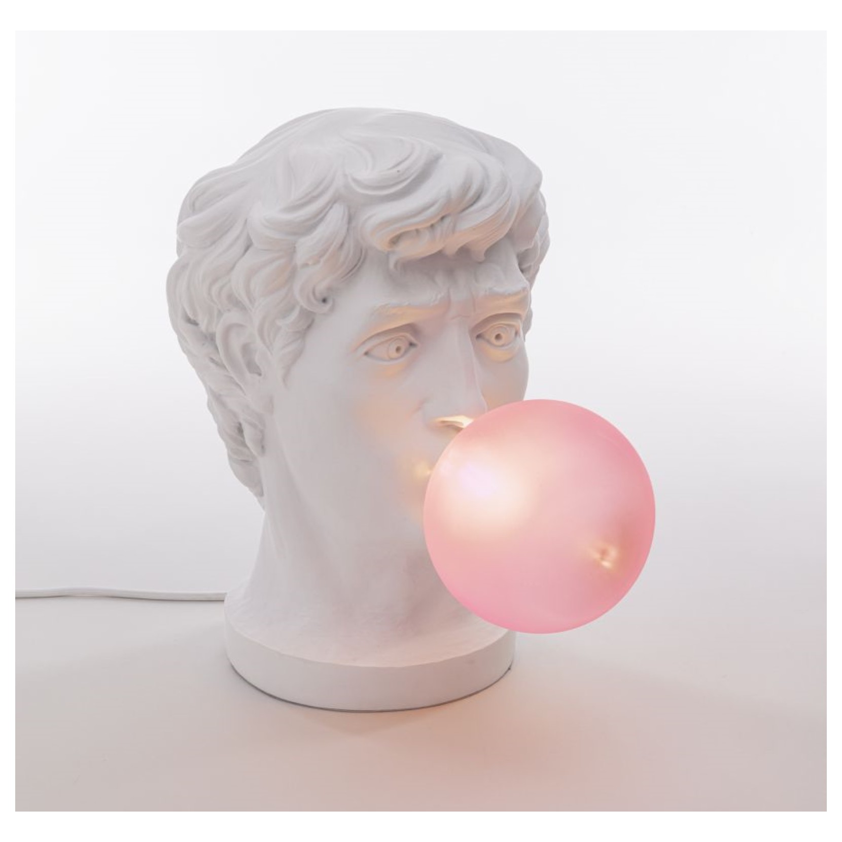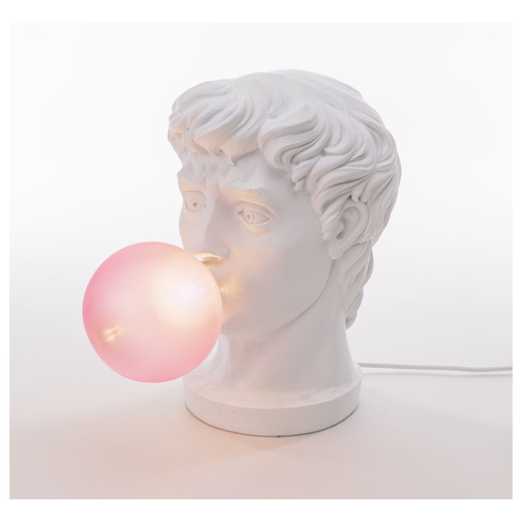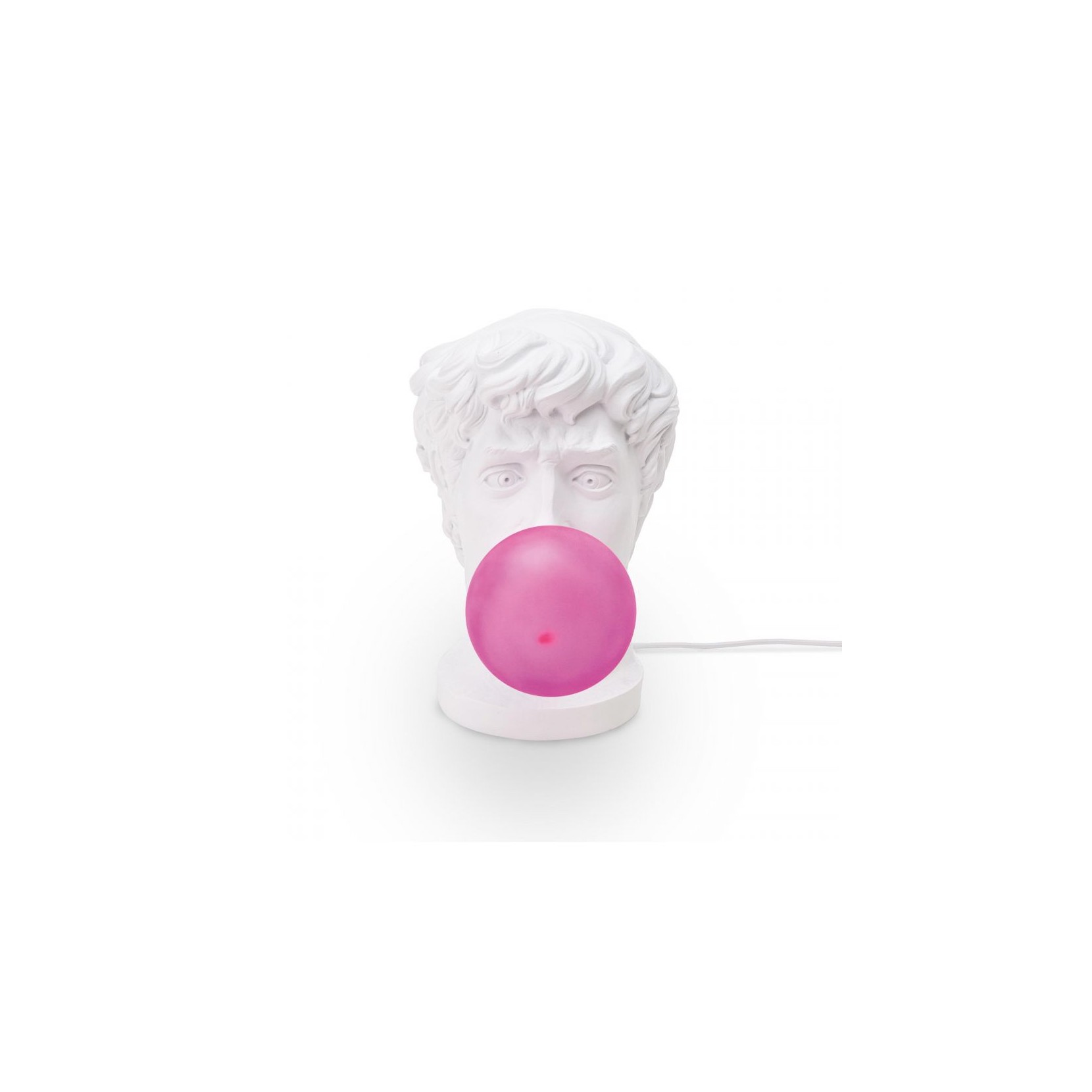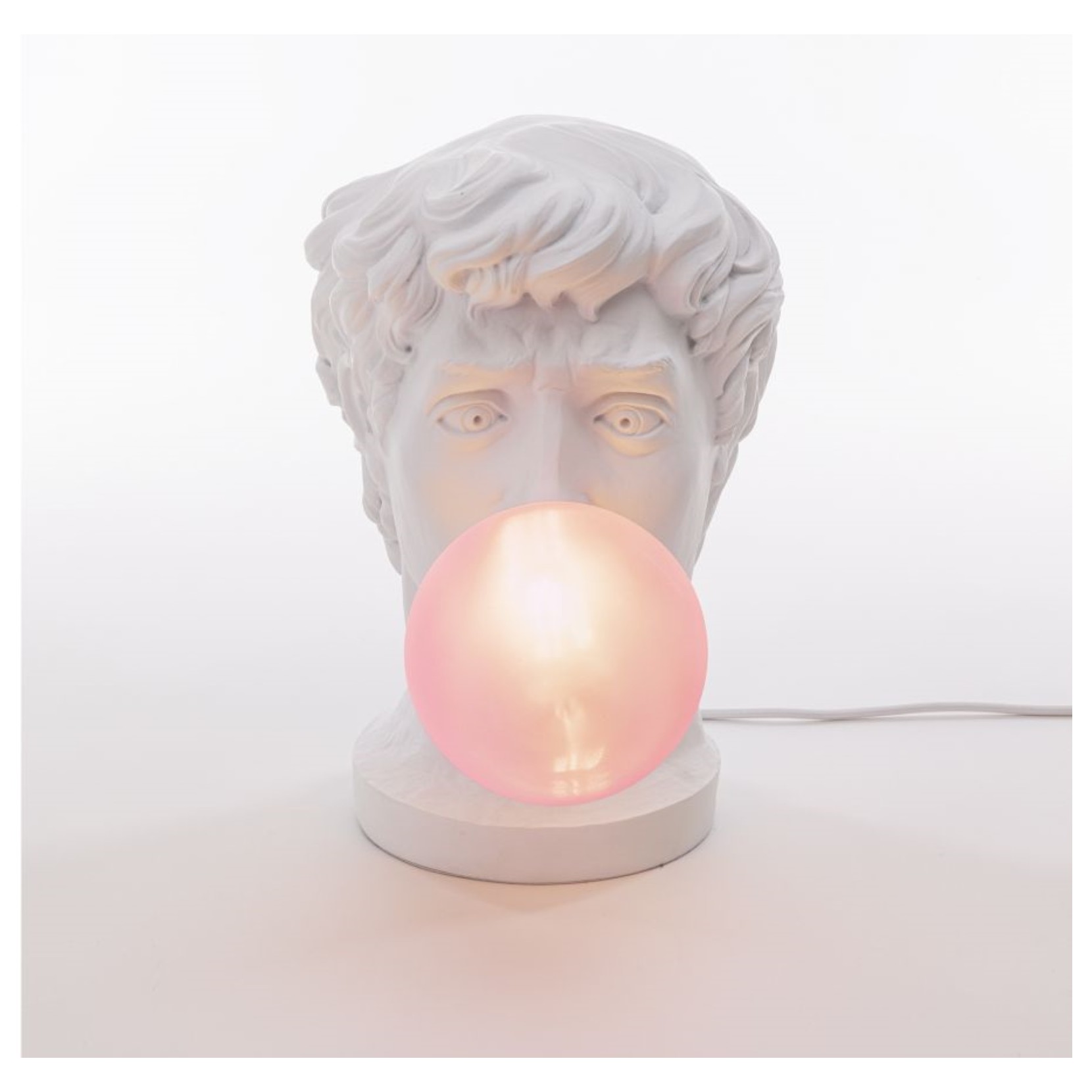 Come sarebbe se ad un tratto un guerriero classico facesse un pallone di chewing gum e La lampada da tavolo SELETTI disegnata in collaborazione con il designer Uto Balmoral, raffigura il volto di un guerriero classico che mastica un chewing gum, stupito da qeullo che riesce a creare con la bocca.