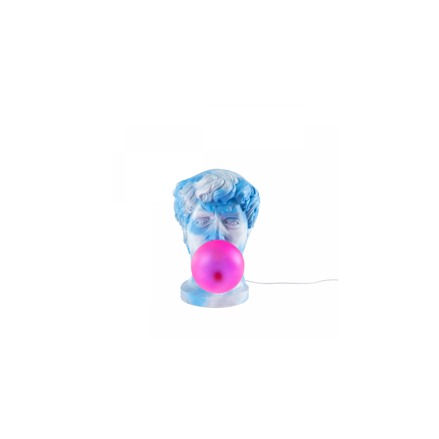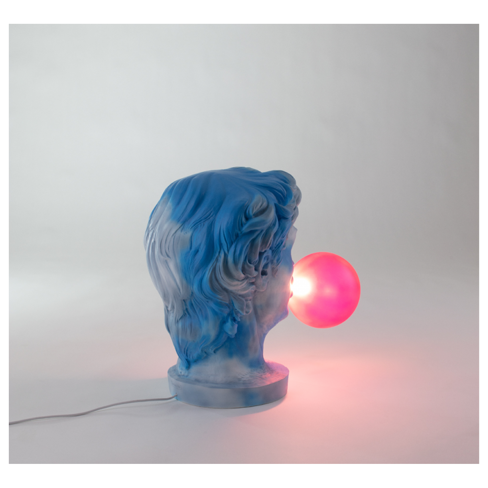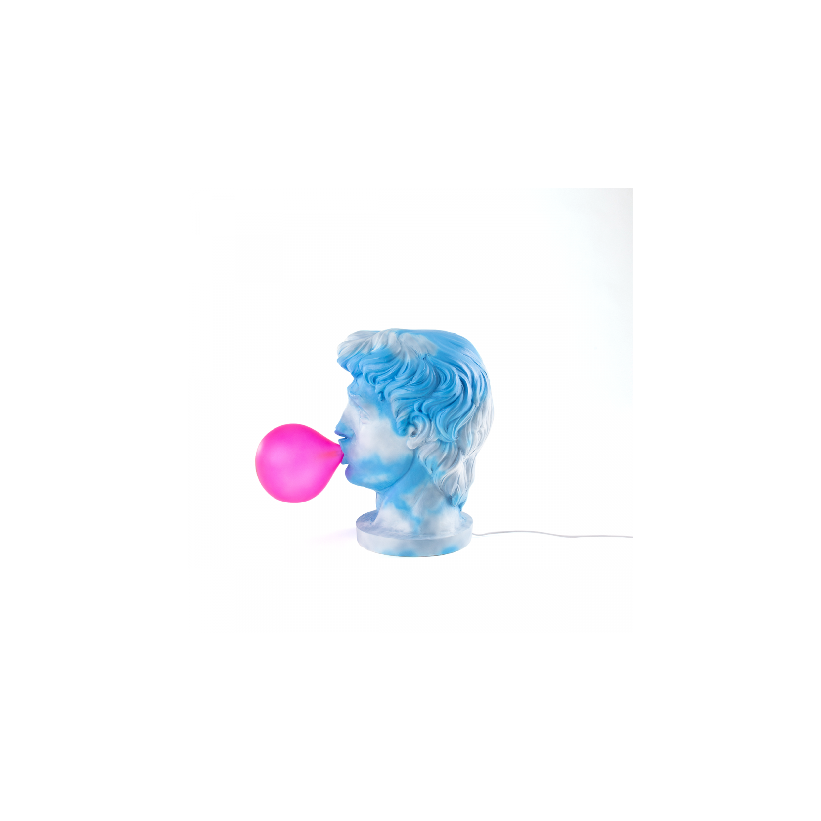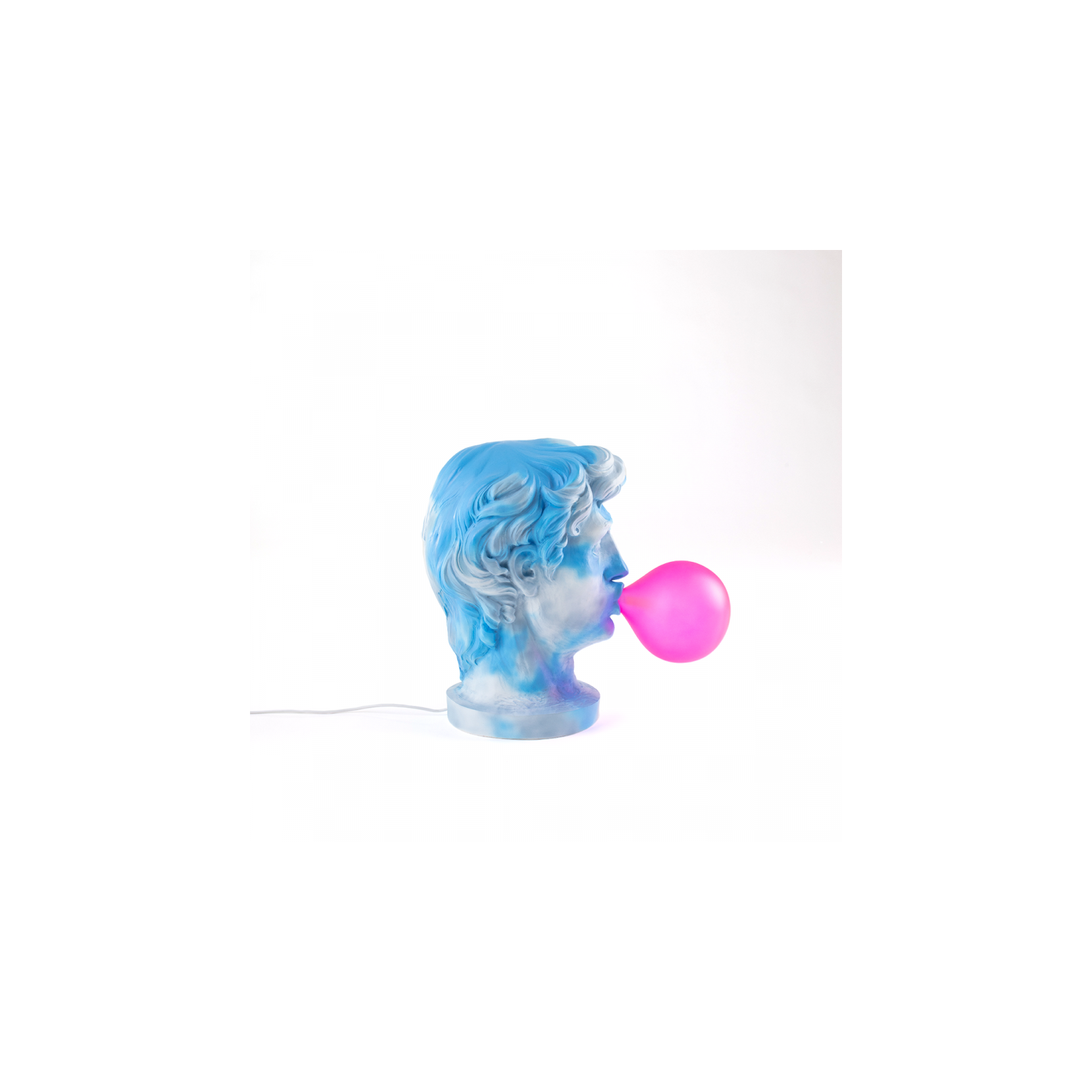 Come sarebbe se ad un tratto un guerriero classico facesse un pallone di chewing gum e La lampada da tavolo SELETTI disegnata in collaborazione con il designer Uto Balmoral, raffigura il volto di un guerriero classico che mastica un chewing gum, stupito da qeullo che riesce a creare con la bocca.