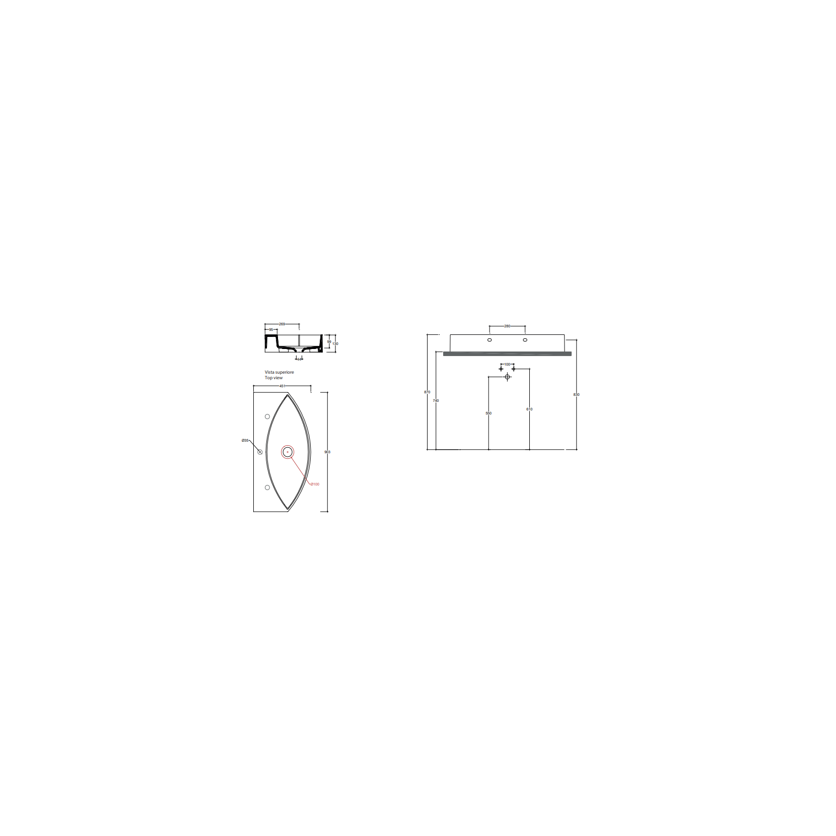 VALDAMA Occhio - Lavabo in ceramica da appoggio e sospeso 90x45 h13. Con monoforo