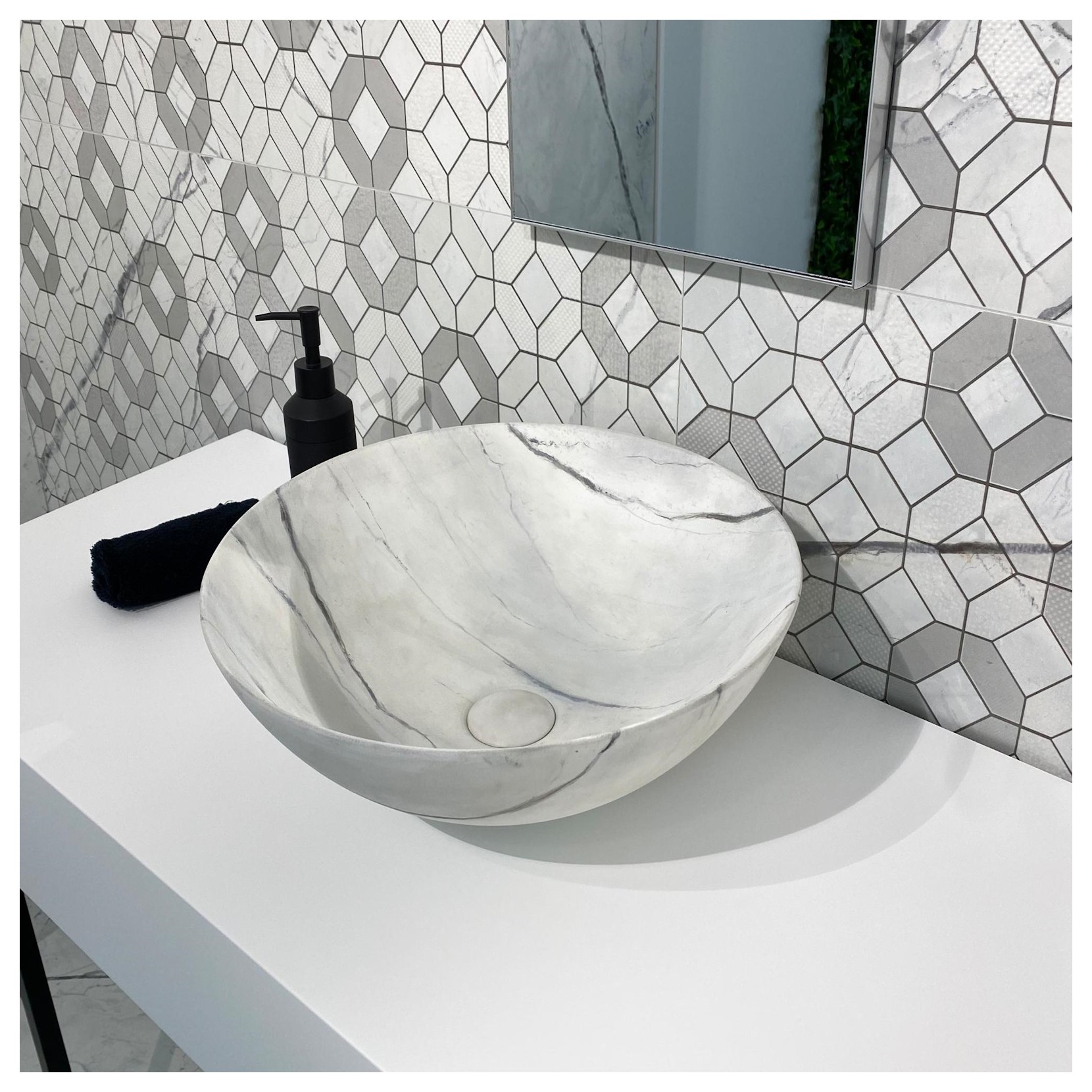 Lavabo prodotto artigianalmente, ispirato alle caratteristiche venature scure su fondo bianco. La lavorazione manuale conferisce unicità a ciascun pezzo.