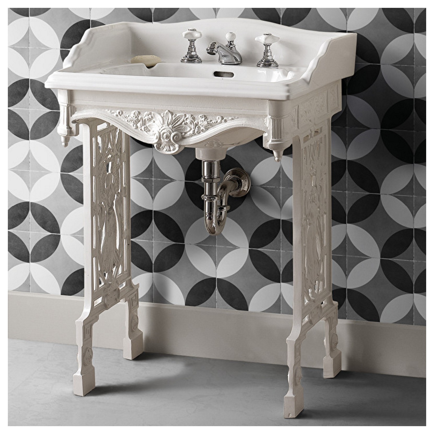 Delicata struttura in metallo con motivi floreali completata dal lavabo in ceramica a tre fori Cambridge dallo stile unicamente romantico.