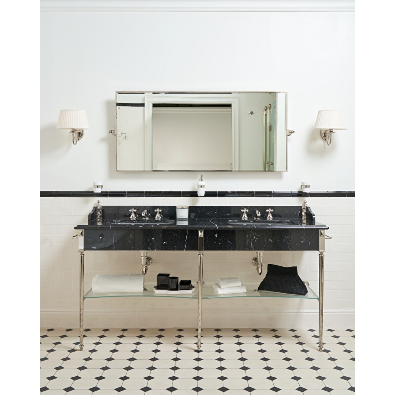 Devon&Devon propone un capolavoro di equilibrio formale che vuole rendere omaggio al design inglese di fine Ottocento. La Consolle Double Madison  si presenta con un portalavabo con piano in marmo, la struttura portante, in ottone tornito per le gambe cilindriche e il porta-oggetti in vetro. La Struttura è disponibile nella versione: Cromo, Oro Chiaro, Nickel lucido.