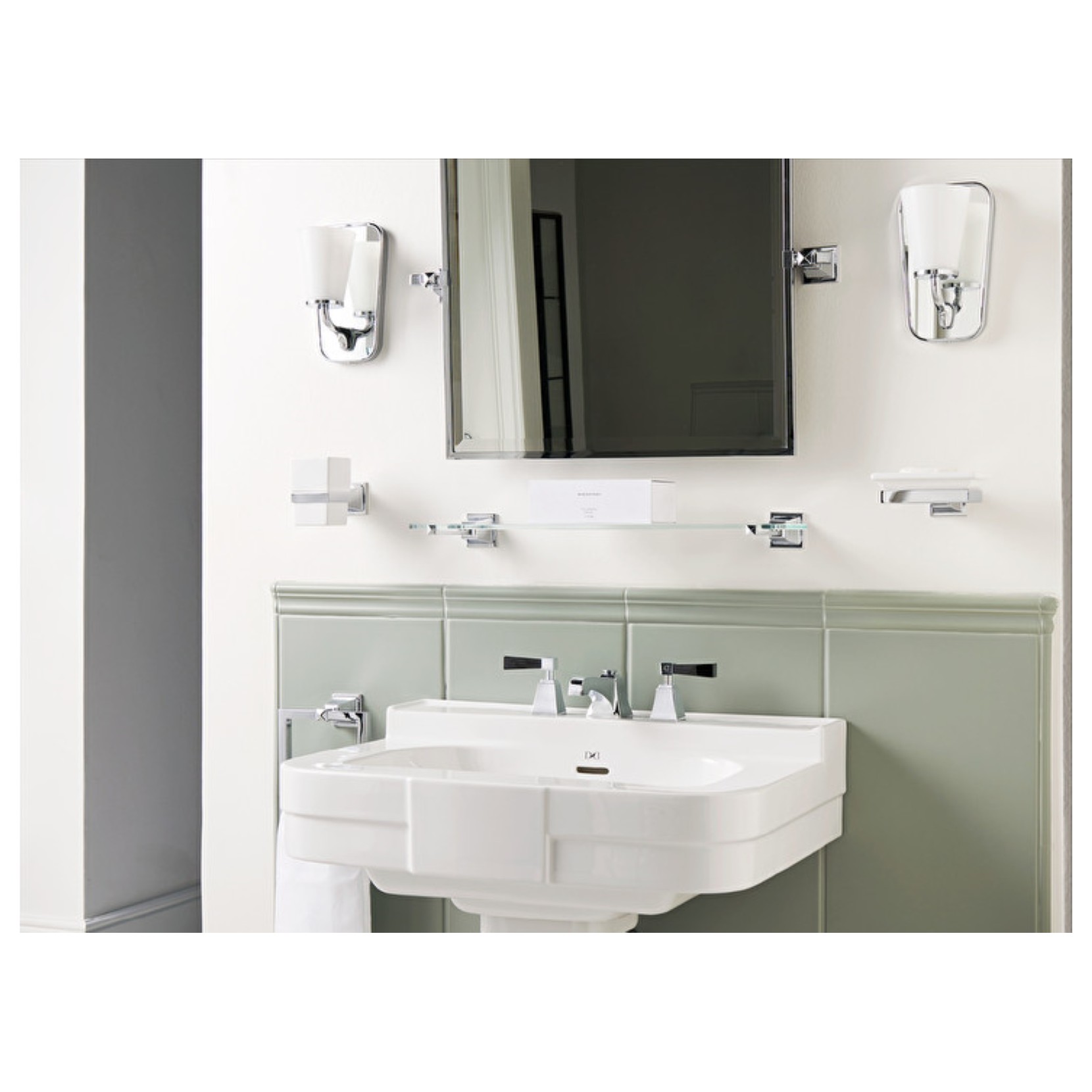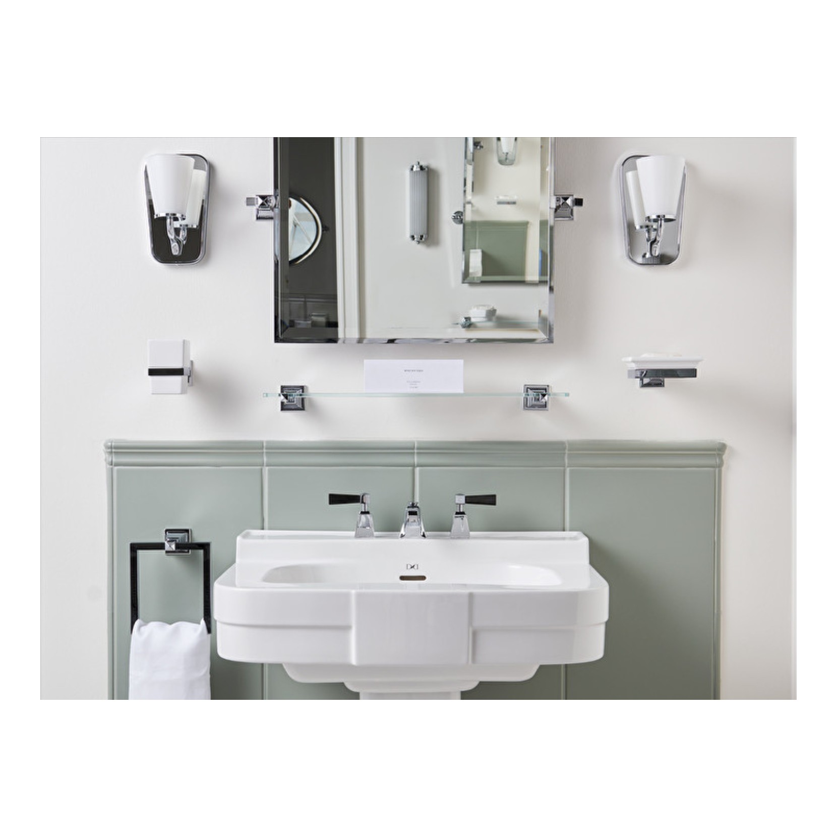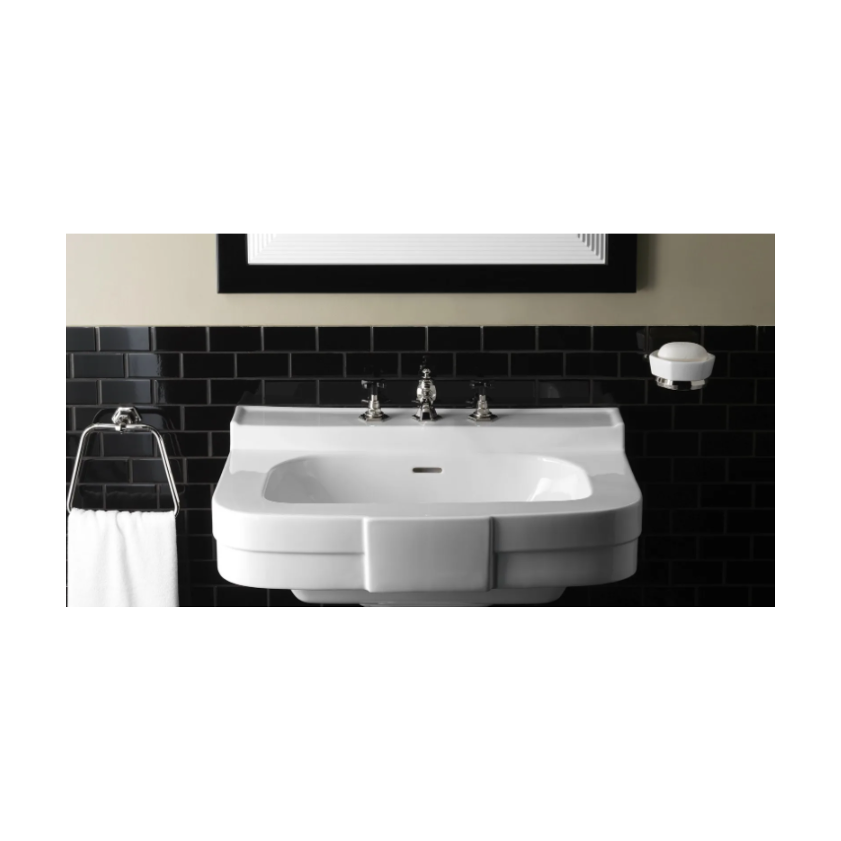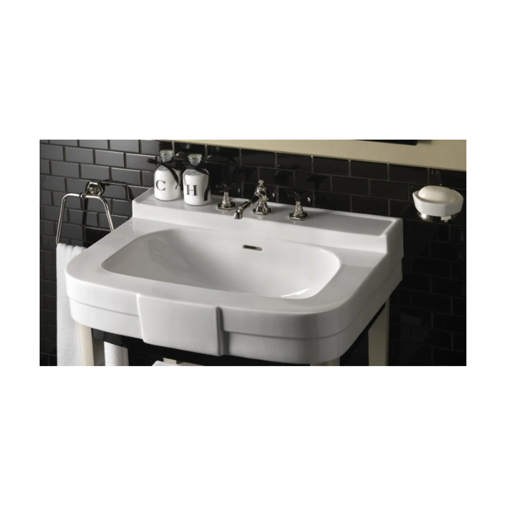 Il lavabo Bogart rimanda a sofisticate atmosfere anni Quaranta con ispirazione agli anni d'oro del grande cinema americano. Disponibile nella versione a 1 a 3 fori in fine porcellana bianca, specificare al momento dell'ordine il foro.