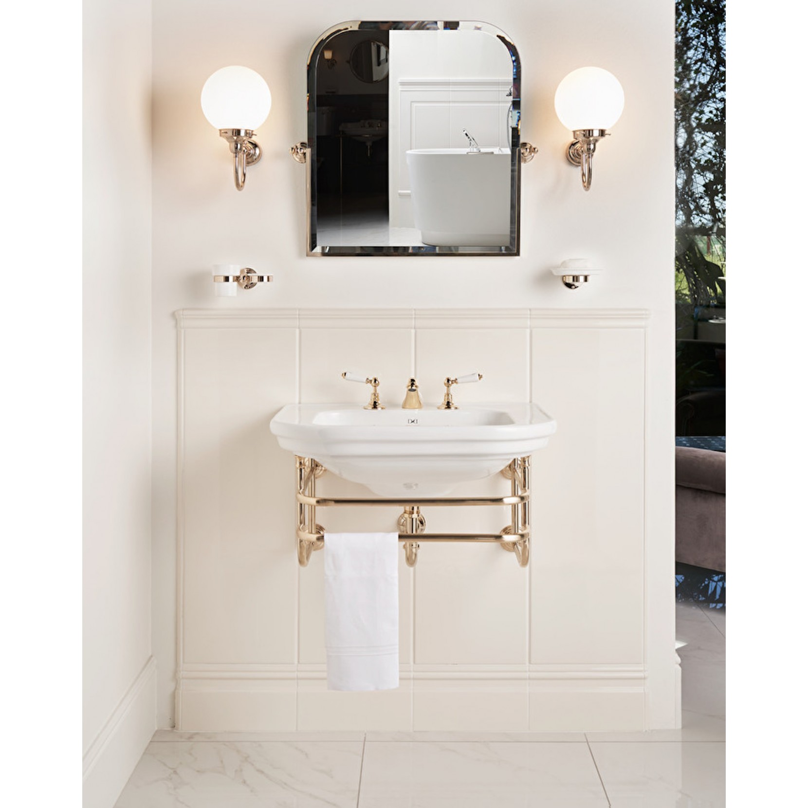 La Consolle sospesa CLASSICA rivaluta lestetica vintage su scala contemporanea. La struttura realizzata in ottone con dettagli di collegamento alla parate delicatamente montati, si trova a sorreggere il lavabo bianco in fine porcellana che integra due comode barre frontali porta-asciugamano.