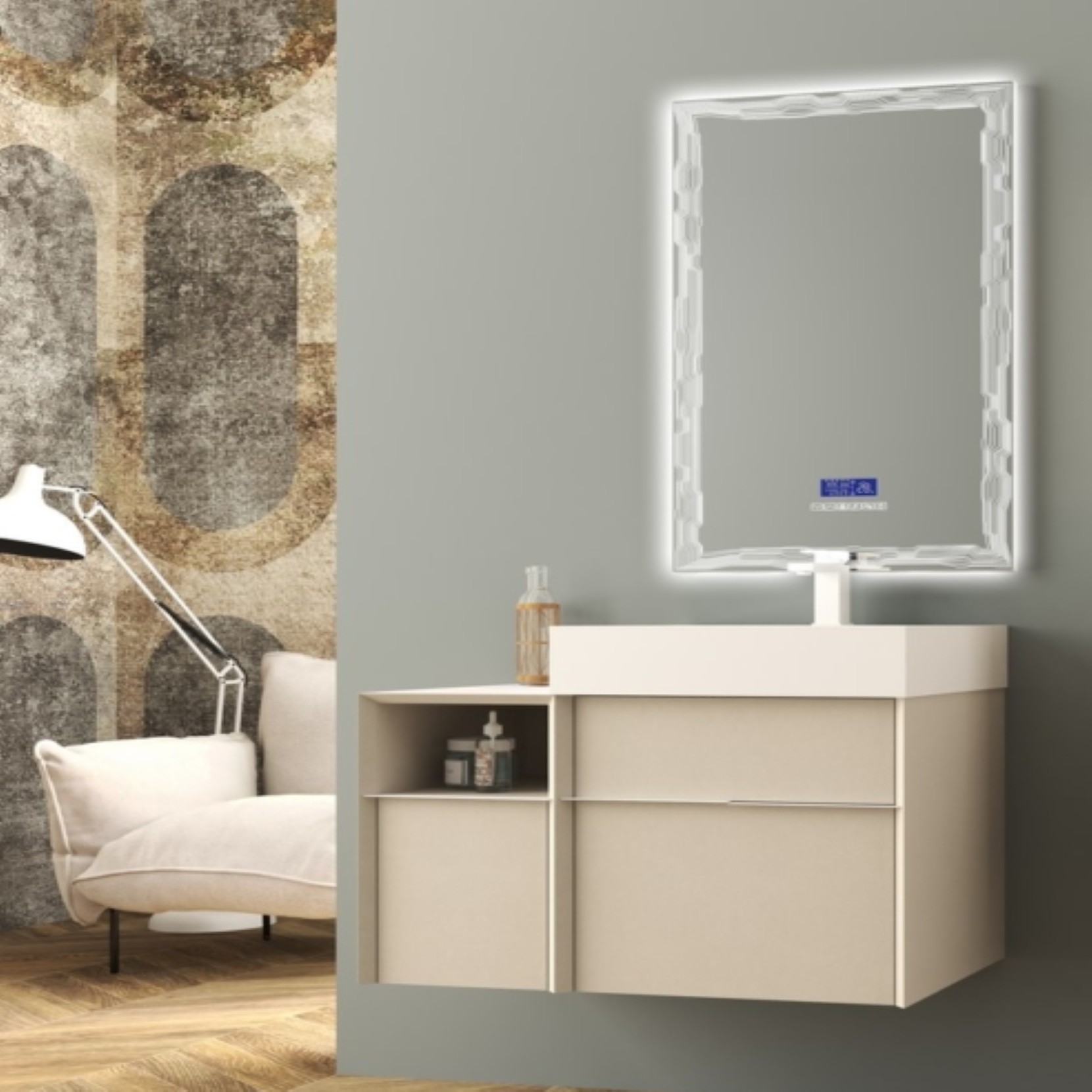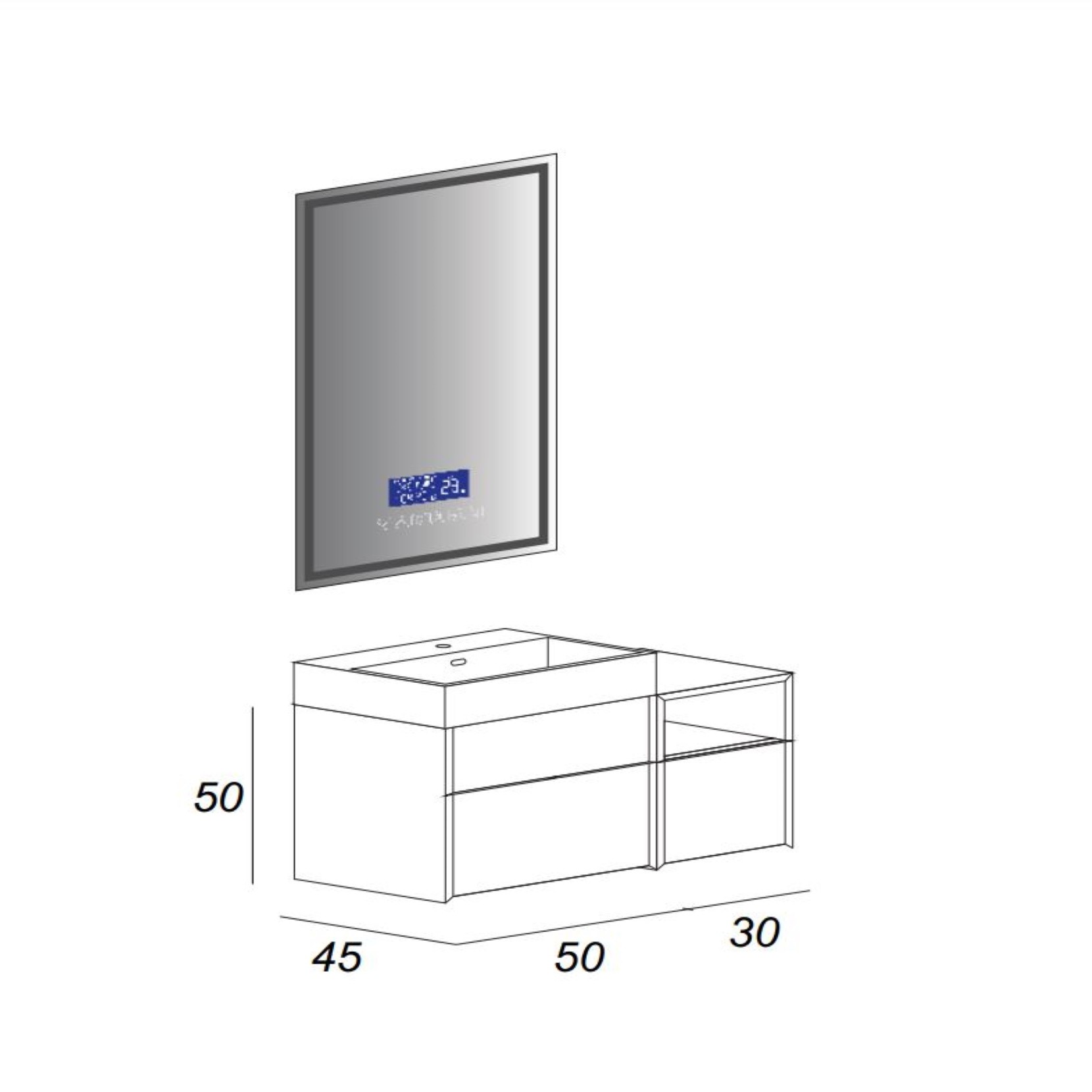 La linea Space è caratterizzata da linee essenziali e dal design flessibile. Con un layout geometrico, la collezione Space consente di scegliere tra unampia gamma di elementi a terra, sospesi o rifiniti da pratici piedi in metallo bianco. I moduli, consentono di organizzare lo spazio assicurando massima capienza e libertà di movimento.Le composizioni disponibili nelle finiture Spatolato Bianco, Rovere Bruges, Bianco Rock e Frassino Scuro, finemente lavorate con angoli a 45 gradi, includono un capiente lavabo in solid surface e un elegante specchio.