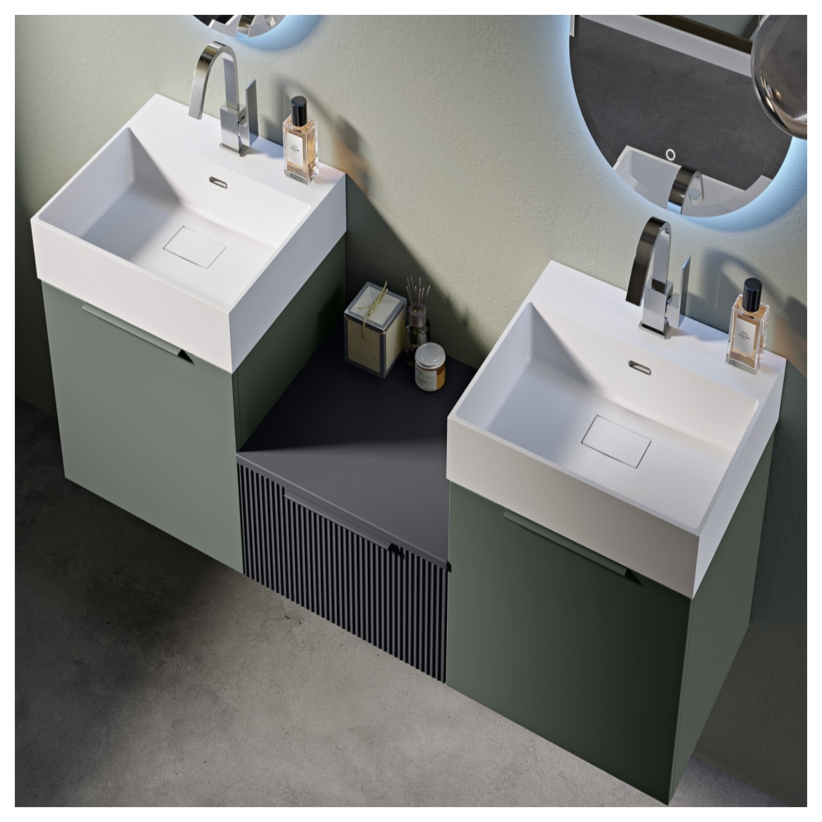 Design, ricerca tecnologica e materiali innovativi si fondono nella Collezione Premium dal design inedito e raffinato che punta alla personalizzazione e alla modularità dei suoi complementi.La Collezione Premium prevede la realizzazione di elementi da 50cm fino a 120cm da modulare in infinite combinazioni, anche in sovrapposizione, coordinati da lavabi in resina bianco opaco, anche su misura, in abbinamento a tutte le cassettiere, per soddisfare ogni esigenza abitativa e funzionale. I cassetti altamente contenitivi, a doppia altezza e con kit ruote opzionale, si vestono di frontali lisci o plissé corredati da eleganti maniglie a colore, interni scuri e guida slim nera con chiusura rallentata.
