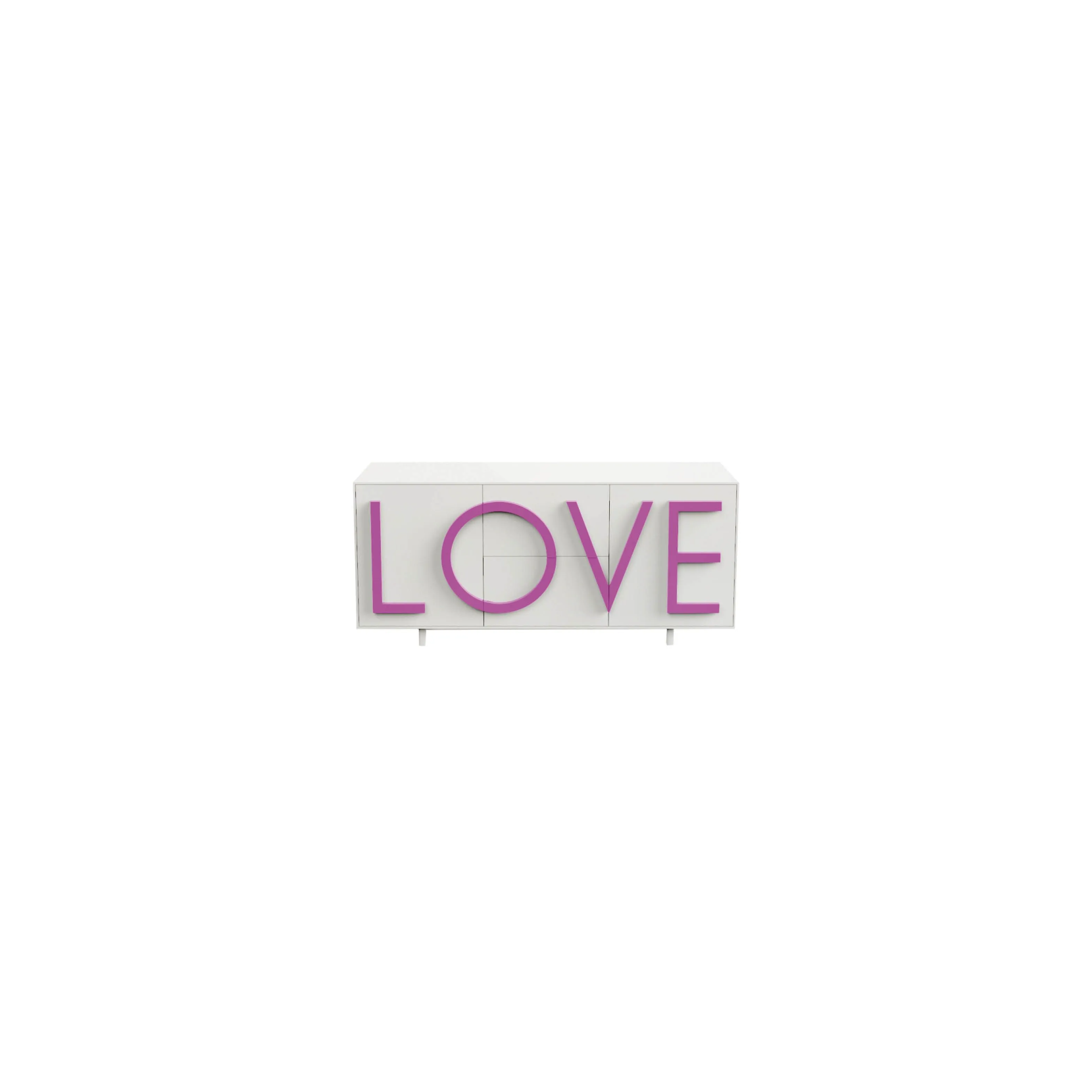 Una madia che parla d'amore; le lettere tridimensionali posizionate frontalmente diventano delle maniglie, disponibili in diversi colori.