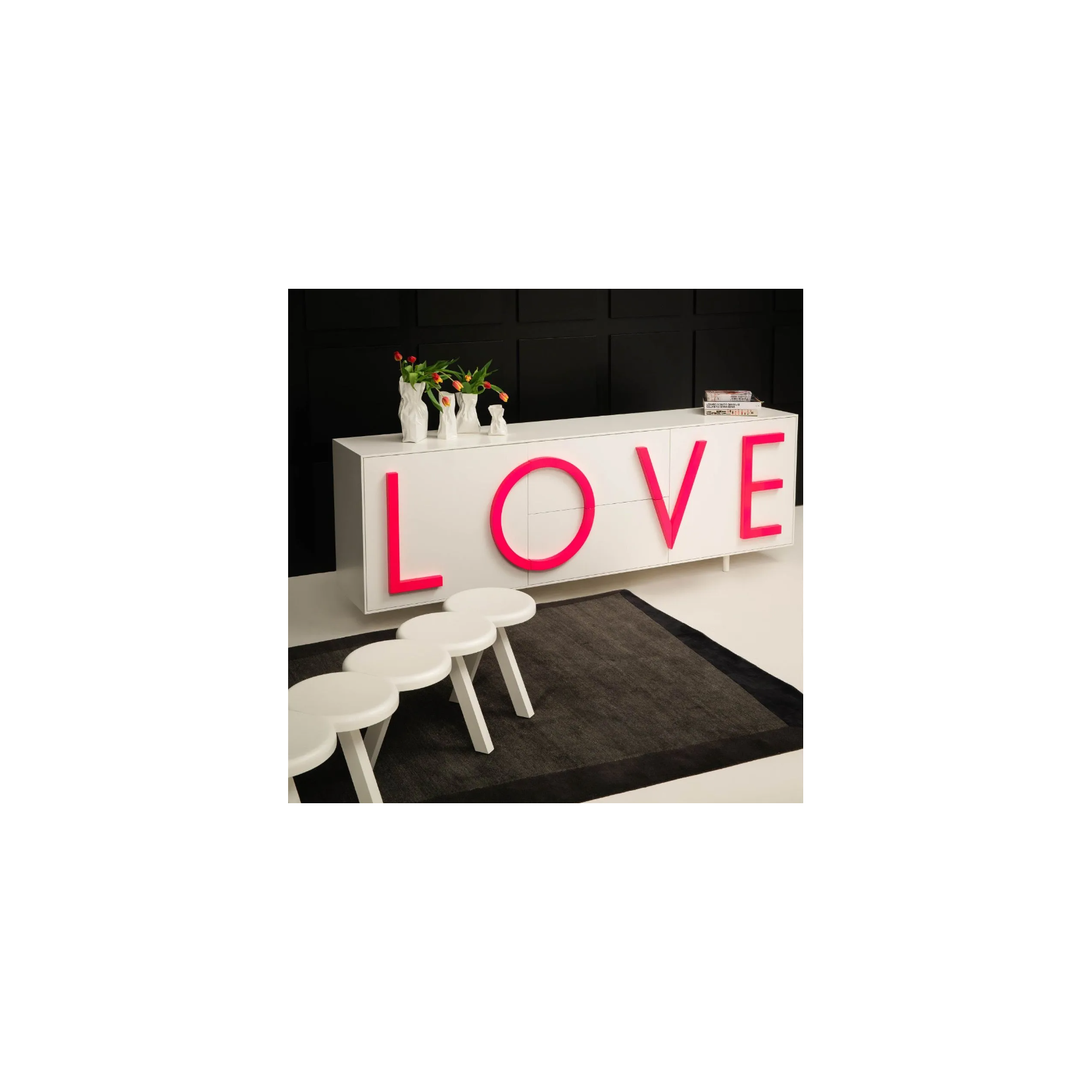 LOVE è un contenitore in MDF laccato bianco traffico con due ante laterali a battente e ripiano interno spostabile, con due cassettoni centrali ad estrazione totale. Struttura in MDF laccato esternamente ed internamente. Scritta LOVE in rilievo con funzione di maniglia in MDF laccato. Piedini cilindrici regolabili diametro 3,5 cm. ed altezza 10 cm. dello stesso colore della struttura. Uso solo interno.