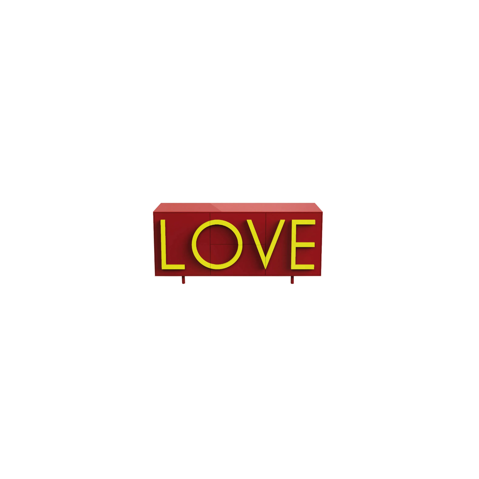 Una madia che parla d'amore; le lettere tridimensionali posizionate frontalmente diventano delle maniglie, disponibili in diversi colori.