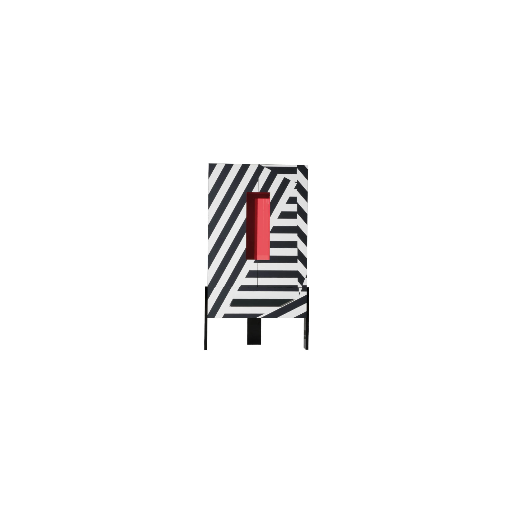 Versione geomatrica bianco nero con vano a giorno rosso e solo per la versione con cassettone maniglia colore nero sagomata secondo decoro. Uso solo interno.