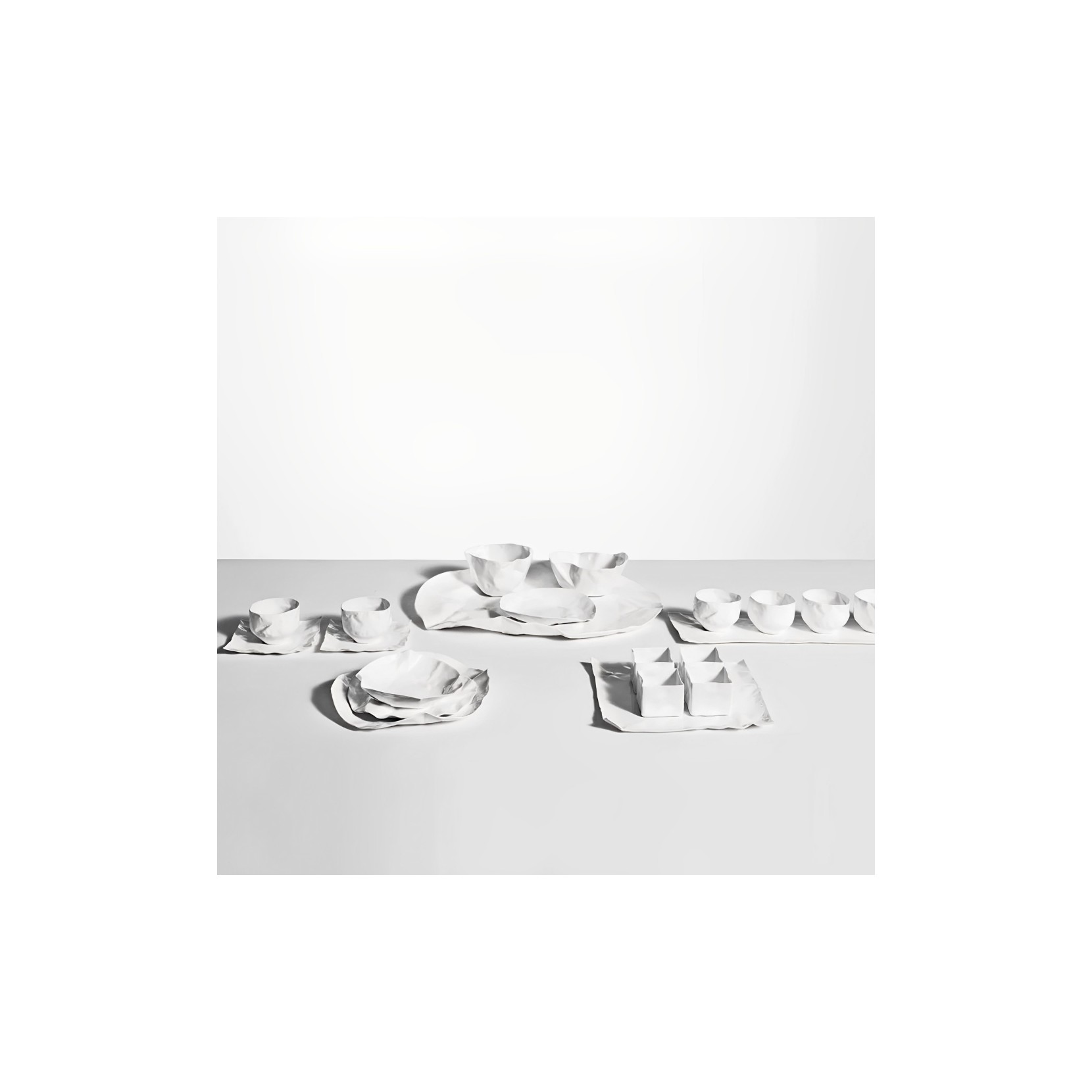 Xie Dong, designer della serie Adelaide, si è innamorata della porcellana Bone China: un materiale delicato e sensibile ideale per le sue creazioni. Lo smalto mette in risalto le linee pure e riproduce perfettamente le caratteristiche della carta. Il set da tavola dalla forma accartocciata si ispira ai sacchetti usati per avvolgere che da una parvenza di leggerezza e serenità.