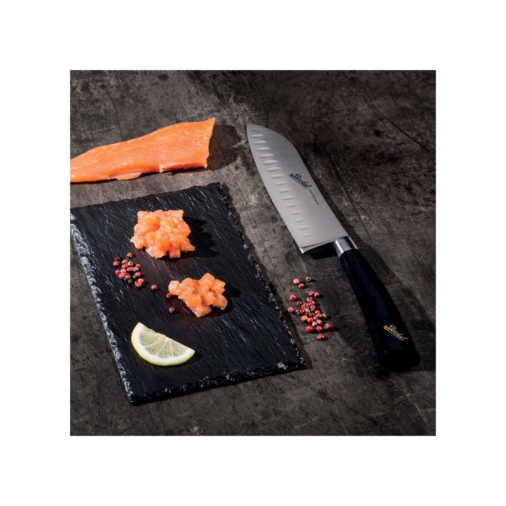 Coltello robusto e maneggevole con un rapporto equilibrato tra peso e rigidità. La lama fa un chiaro riferimento al disegno giapponese , uno strumento da cucina che si presta a qualsiasi tipo di alimento, dalla carne, pesce, frutta e verdura anche di grosso calibro. I caratteristici alveoli facilitano il dustacco delle fette.