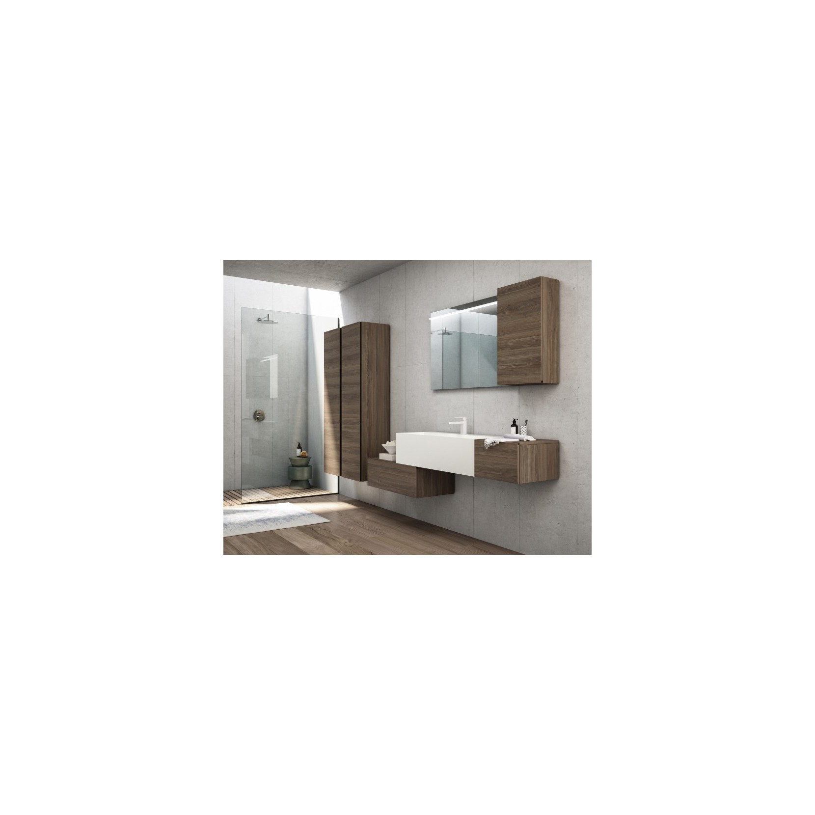 Lavabo in Tecnolite bianco; basi, pensili e colonne in Tecnolam 256 Noce Savoia con prese maniglie in metallo laccato opaco 033 Nero.