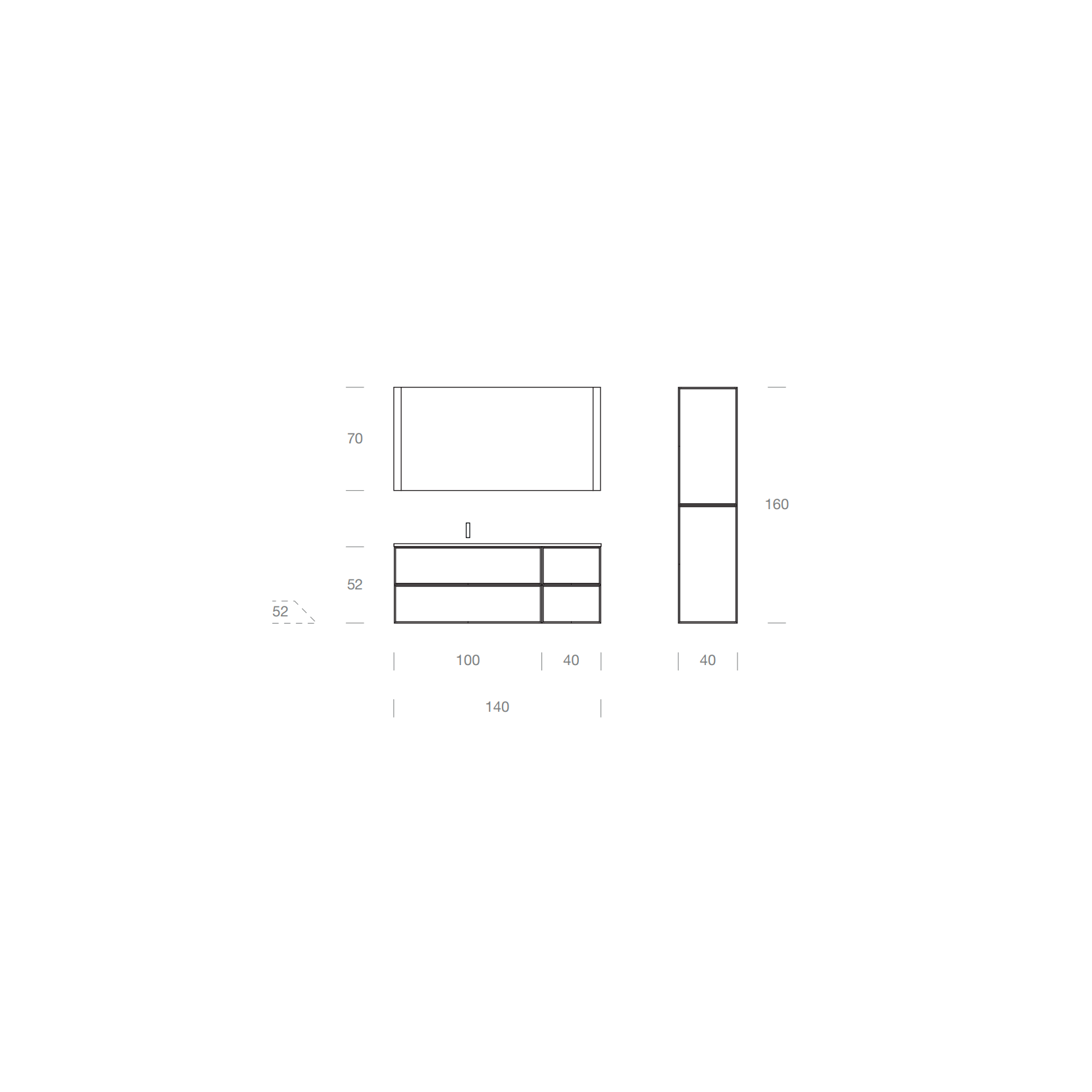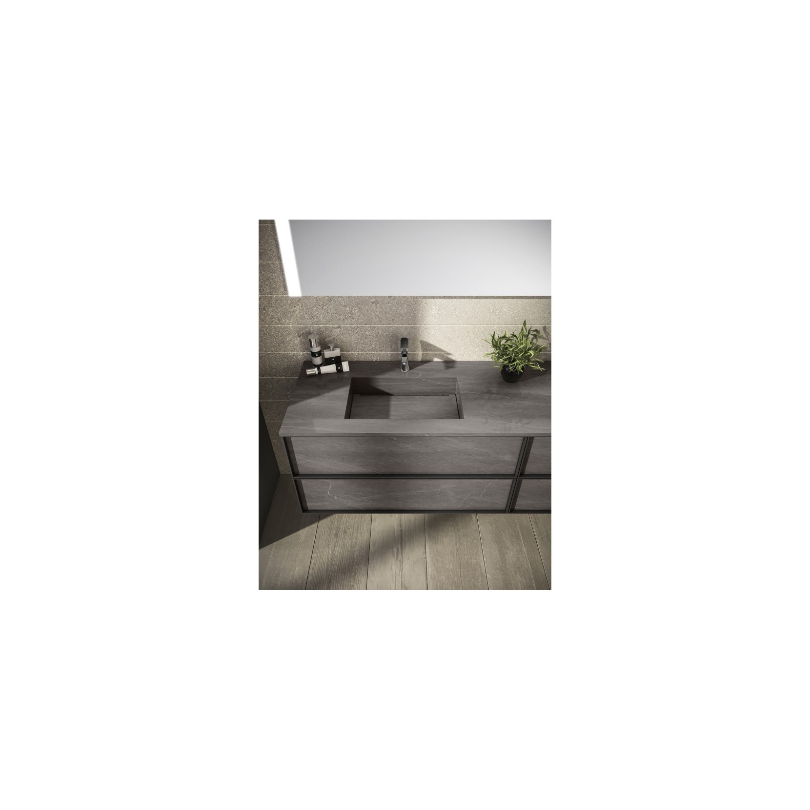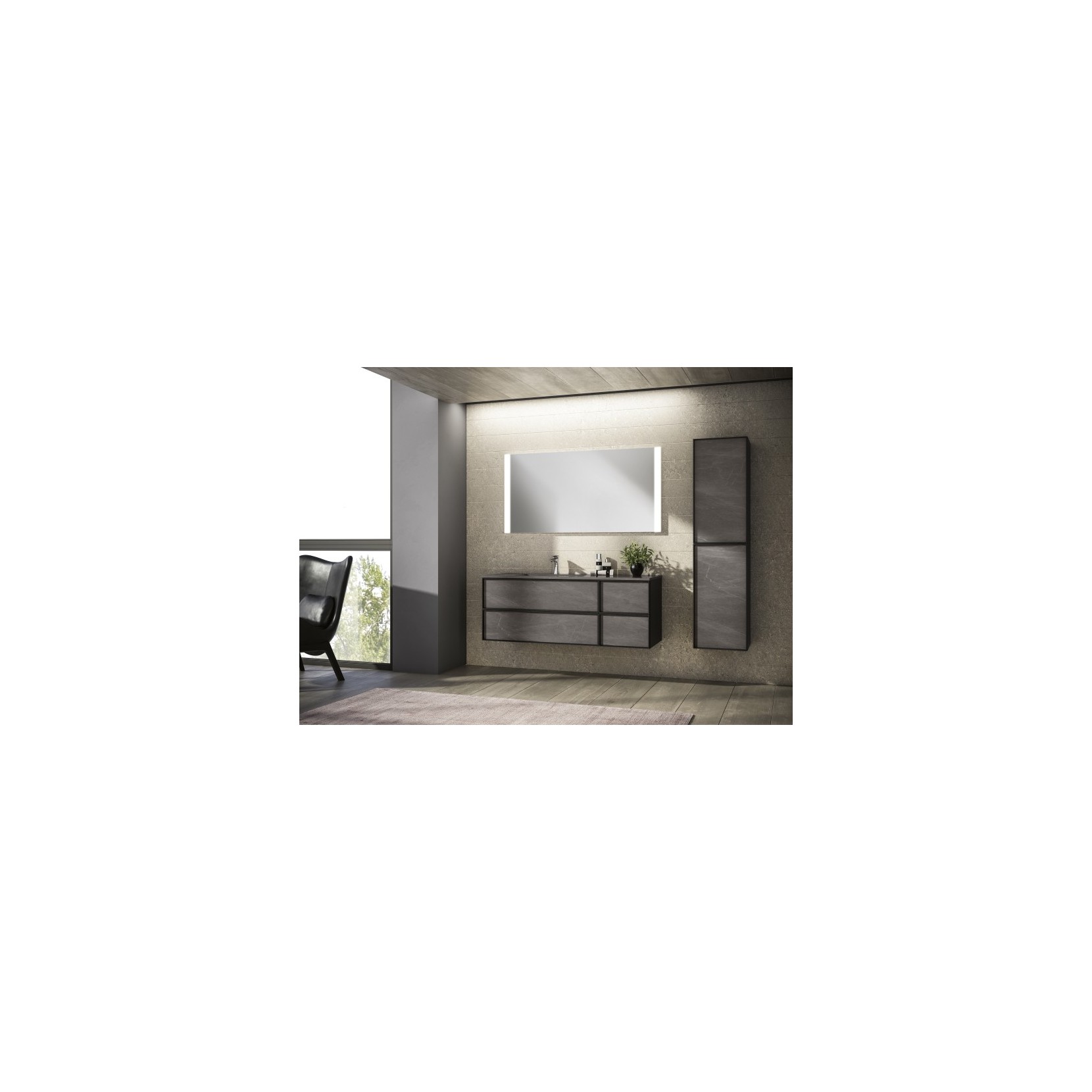Portalavabo, base e colonna laccate opaco 033 Nero, ante con cornice in metallo finitura nero e inserto Tecnogres nitura 311 Stone Grey. Top in Tecnogres finitura 311 Stone Grey. Specchio Vanity con illuminazione LED laterale