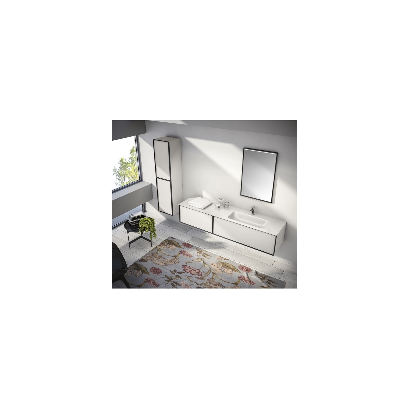 Portalavabo, base e colonna laccate opaco 088 Bianco Venere, ante con cornice in metallo e inserto in vetro satinato in finitura 088 Bianco Venere. Top in vetro Solid Glass. Specchio Brick con cornice in metallo e luce LED