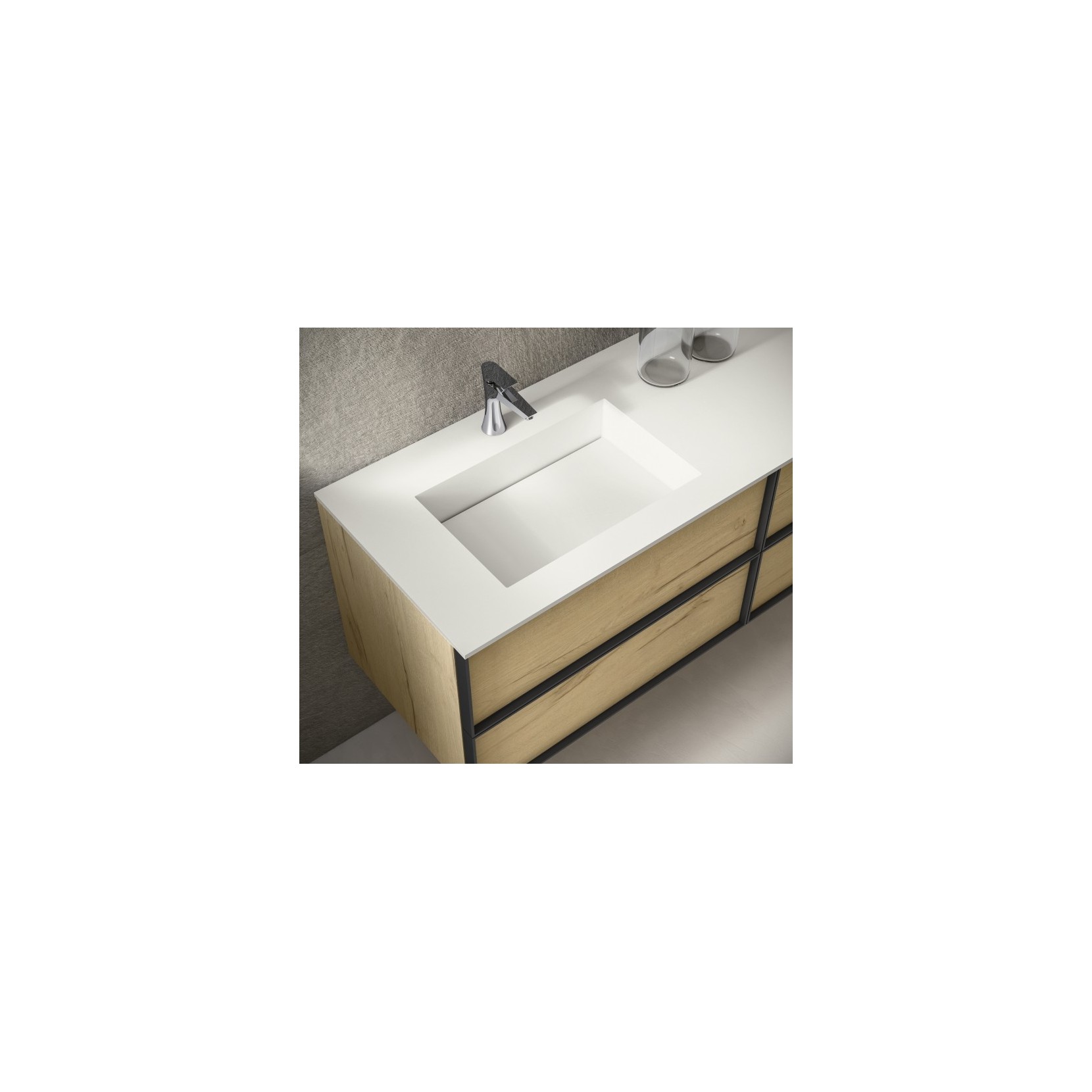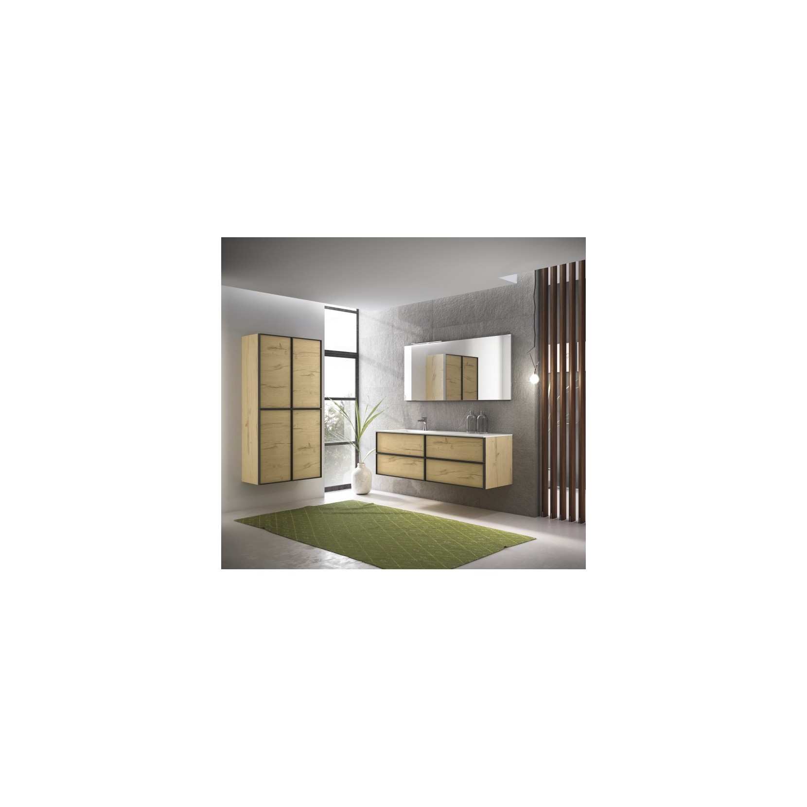 Portalavabo, base e colonna in essenza 960 Nativo Naturale, ante con cornice in metallo e inserto in essenza 960 Nativo Naturale. Top in Tecnolite bianco; specchio filo lucido con lampada Sura 500.