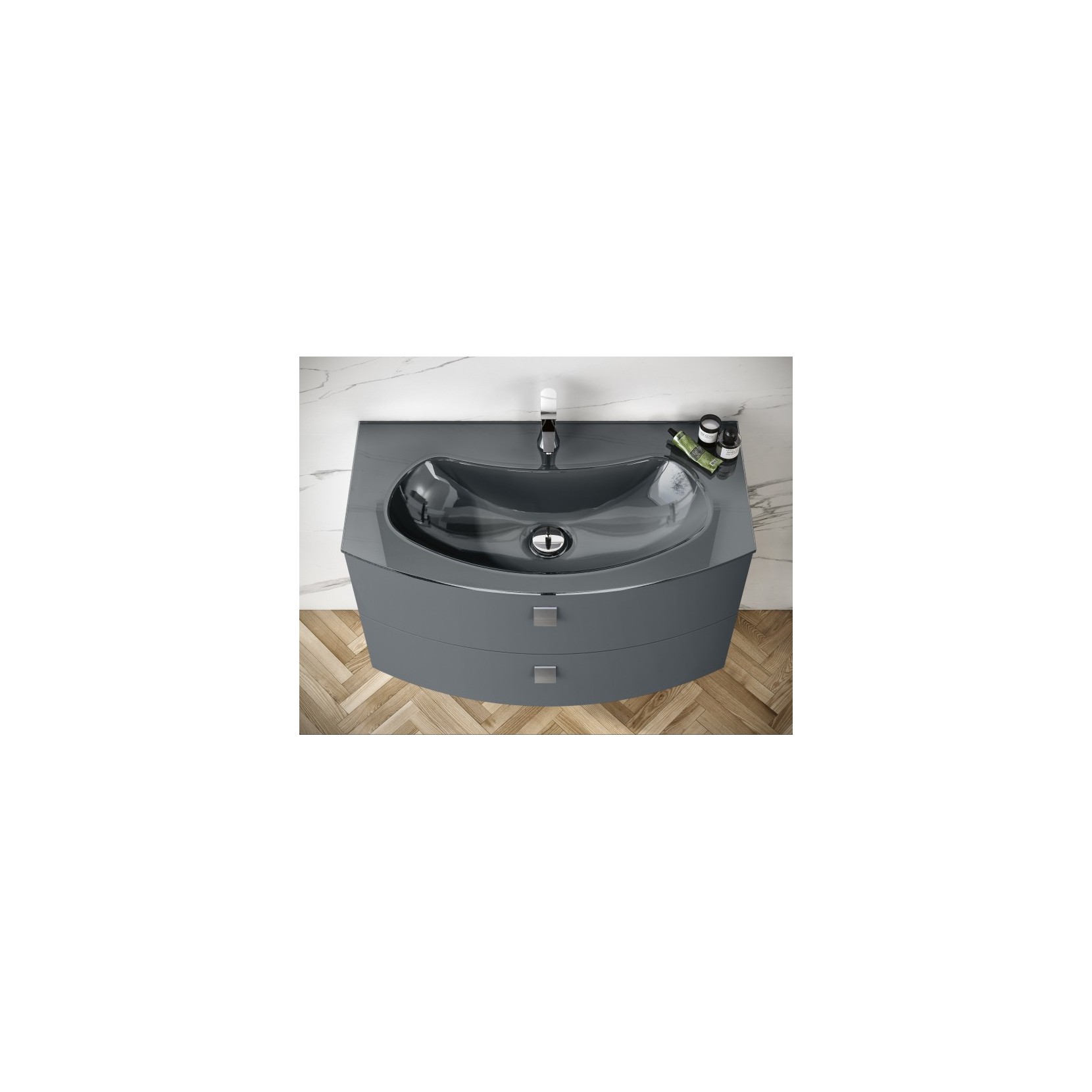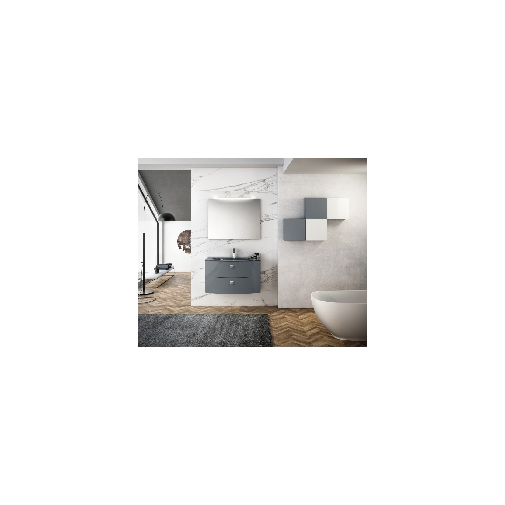 Portalavabo laccato lucido 067 Manhattan con maniglia G16; top in vetro lucido 067 Manhattan. Specchio lo lucido con lampada Slim L60 cm. Pensili laccati lucido 017 Latte e 067 Manhattan.