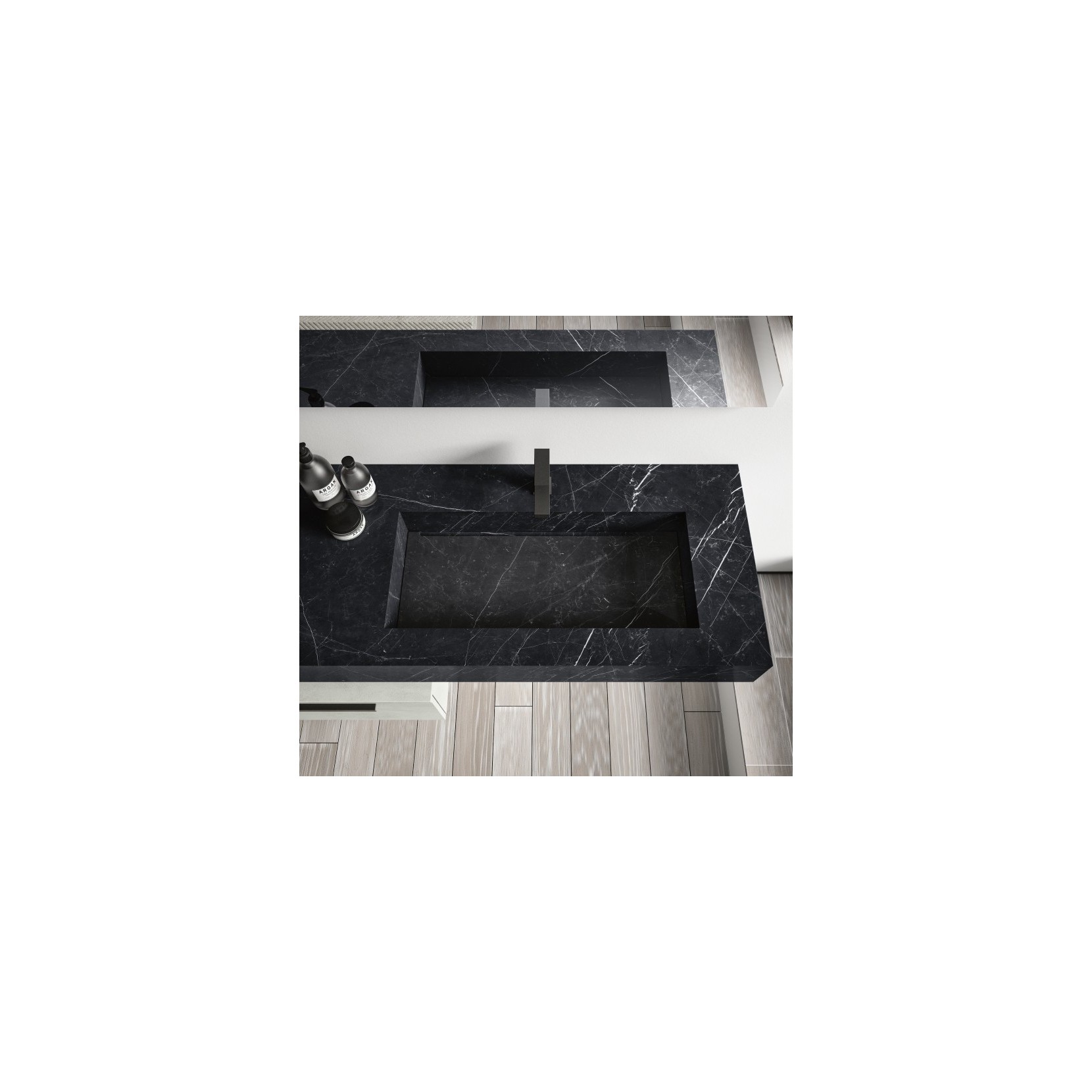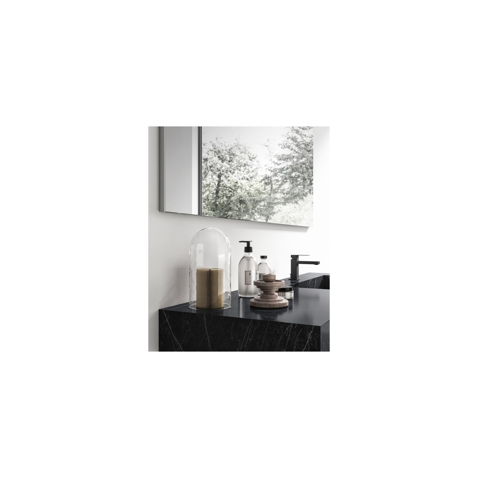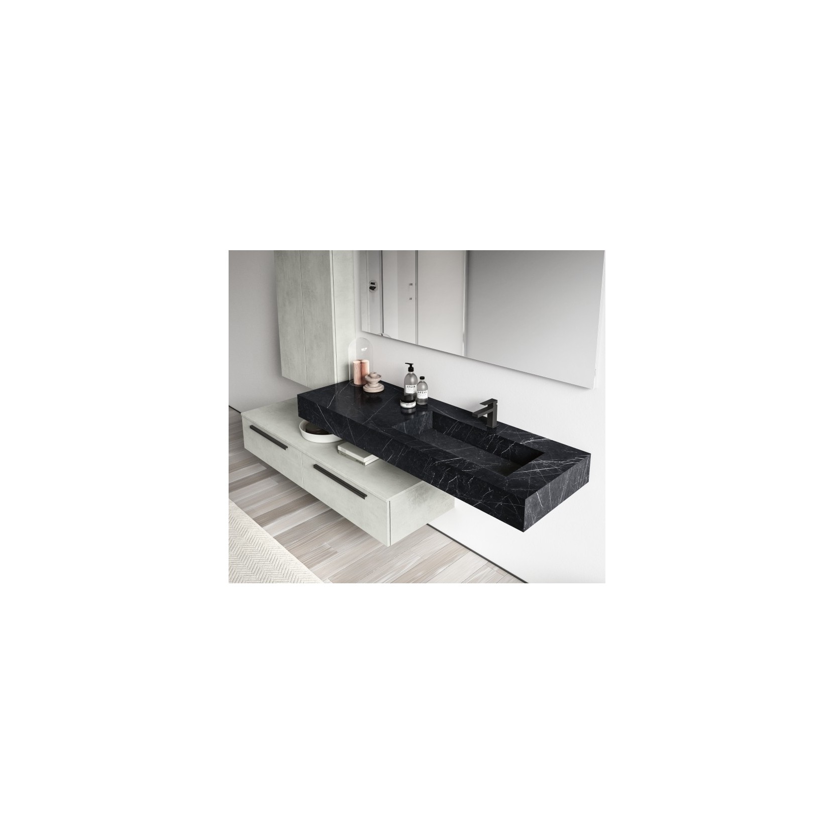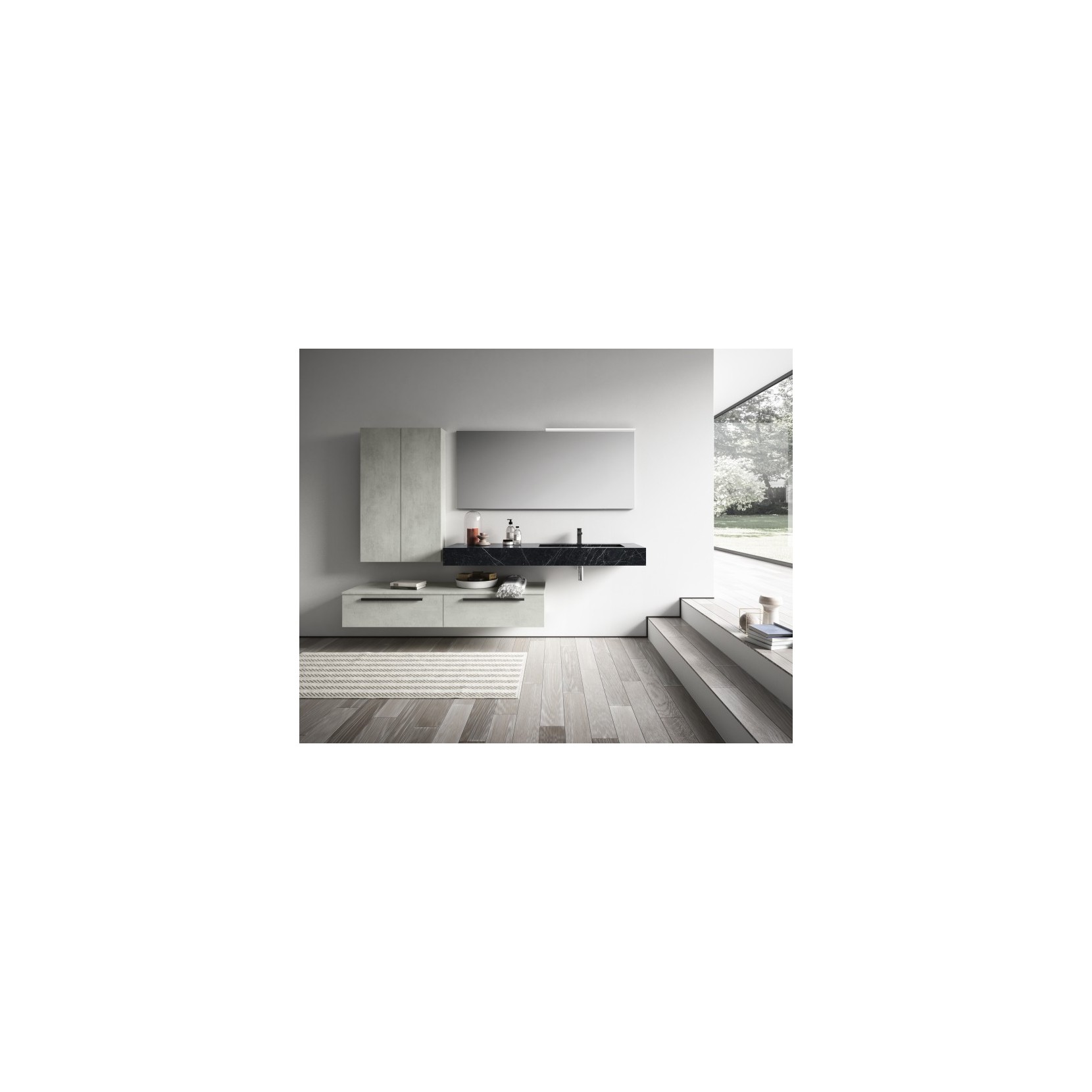 Top scatolato in Tecnogres 312 Nero Marquinia; basi in finitura 959 Beton con maniglie G59.481 laccate opaco 033 Nero. Specchio filo lucido con lampada Slim L80 cm; pensili in finitura 959 Beton.