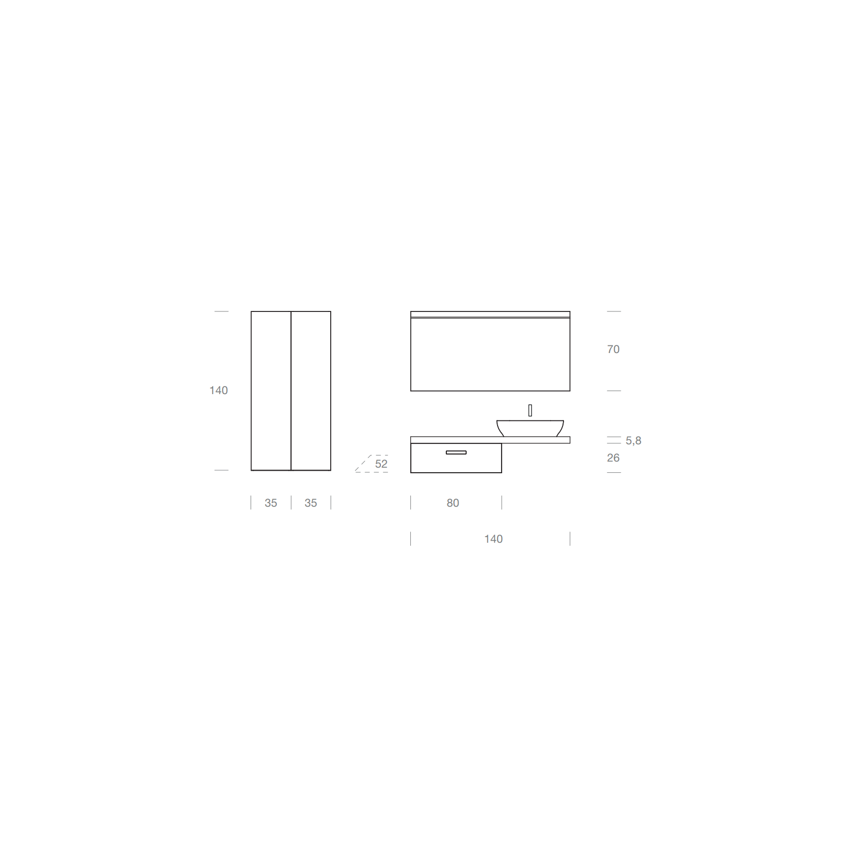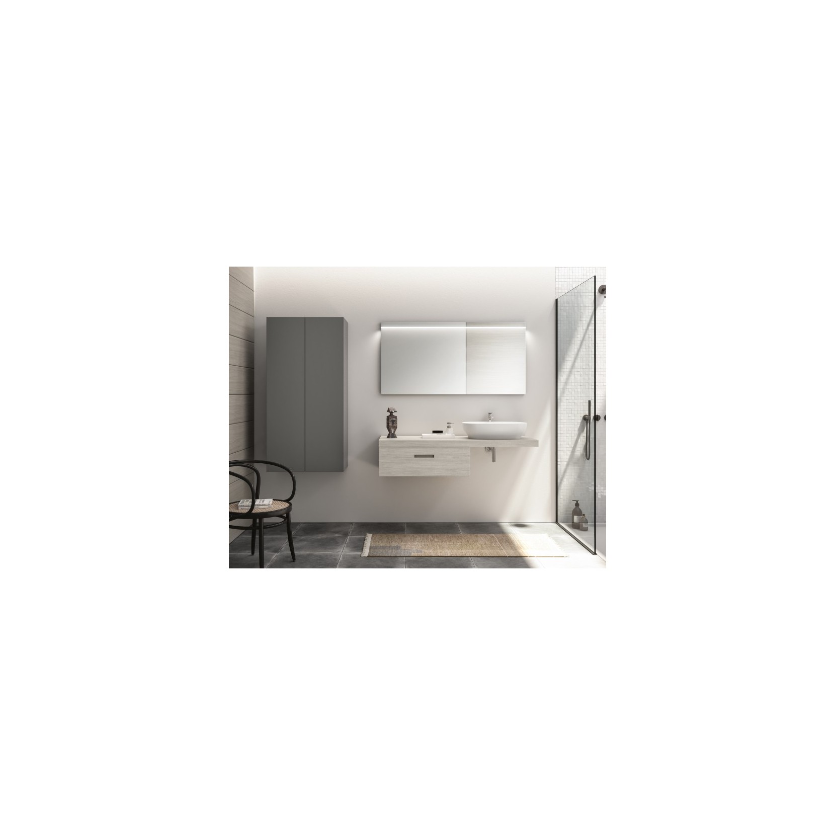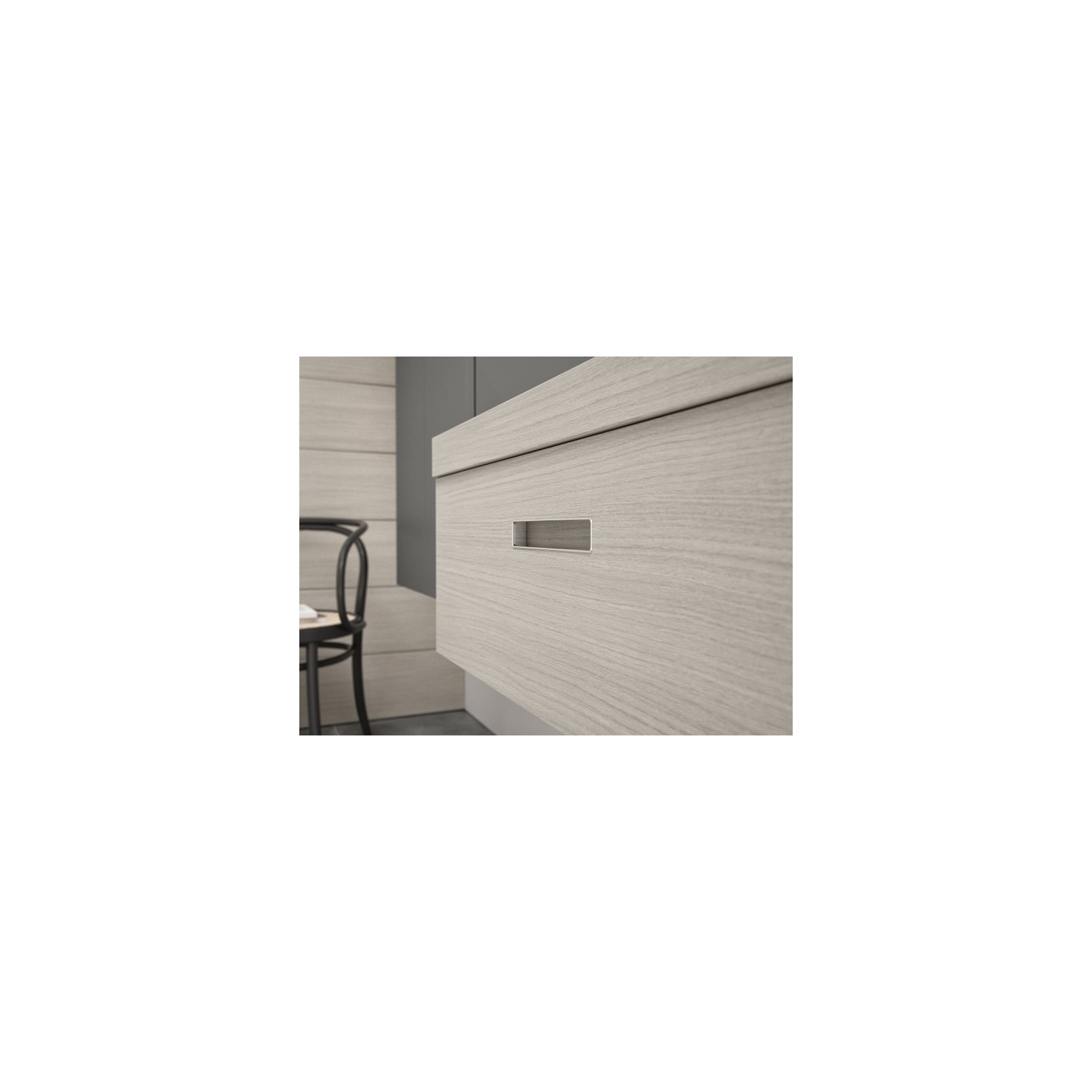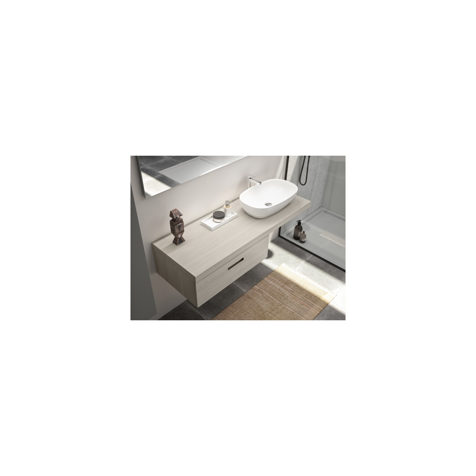 Top in essenza 969 Rovere Silver, e lavabo soprapiano in resina; base in essenza 969 Rovere Silver, con maniglia G54 incassata.