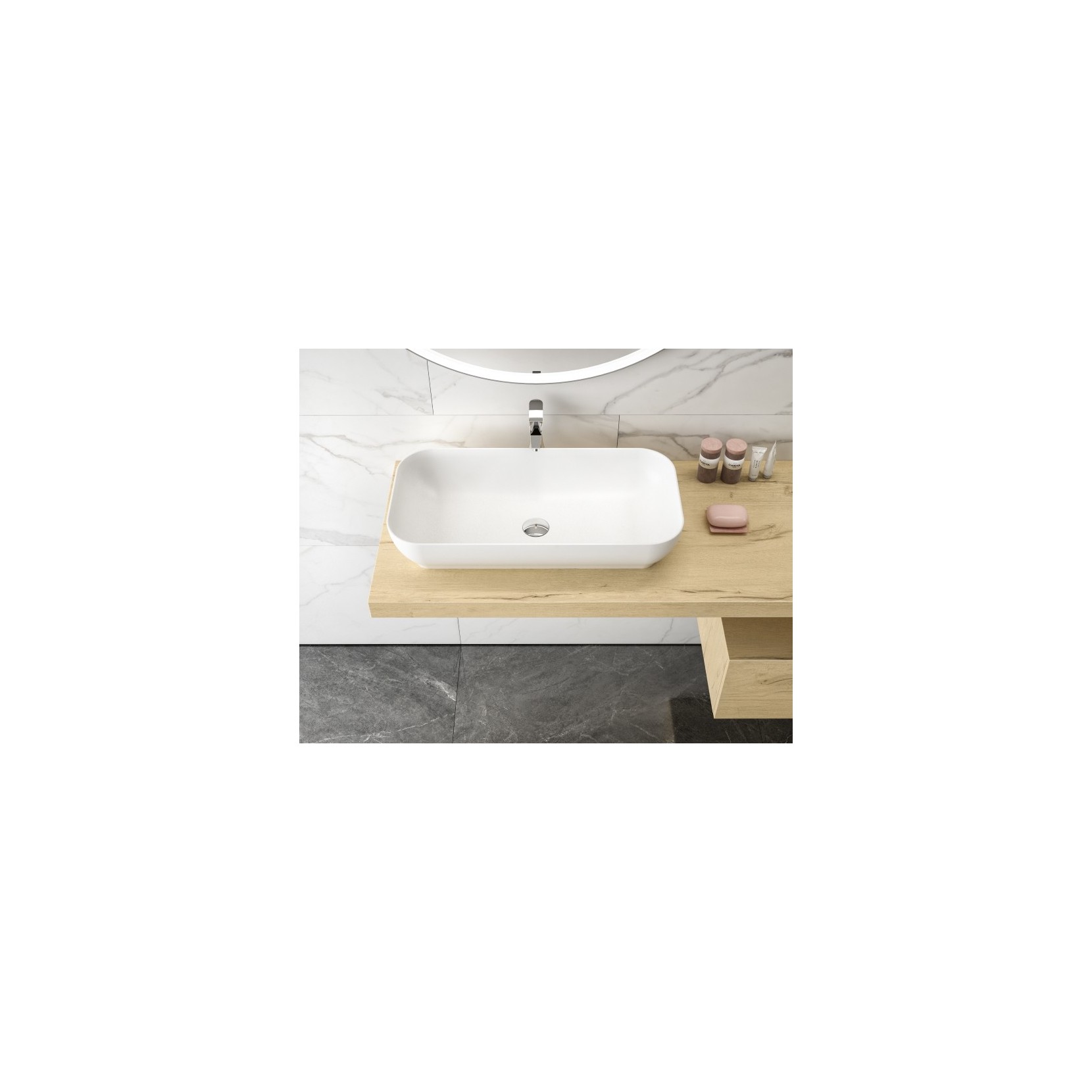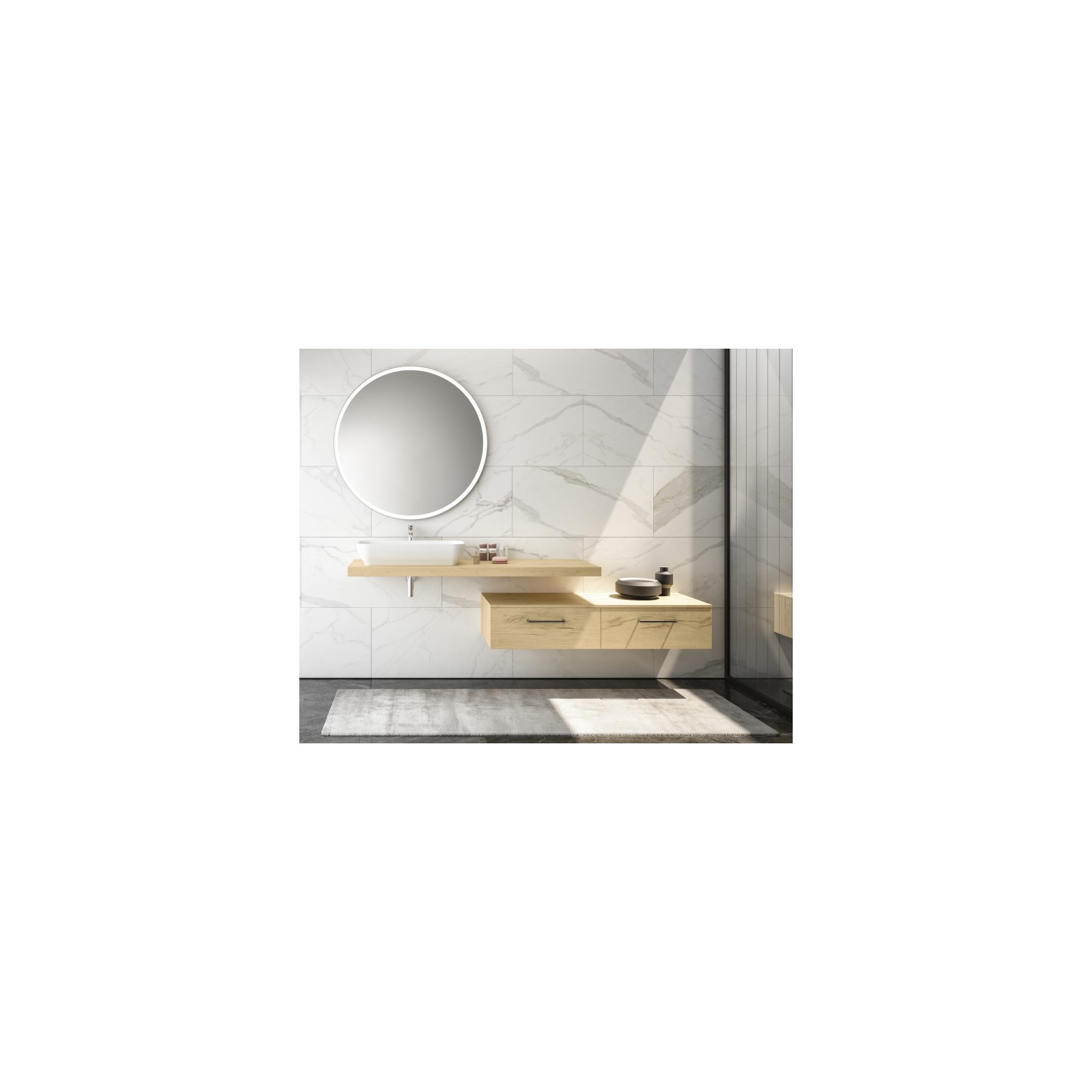 Top in essenza 960 Nativo Naturale con lavabo soprapiano in resina; basi in essenza 960 Nativo Naturale con maniglia G61-224 in metallo.