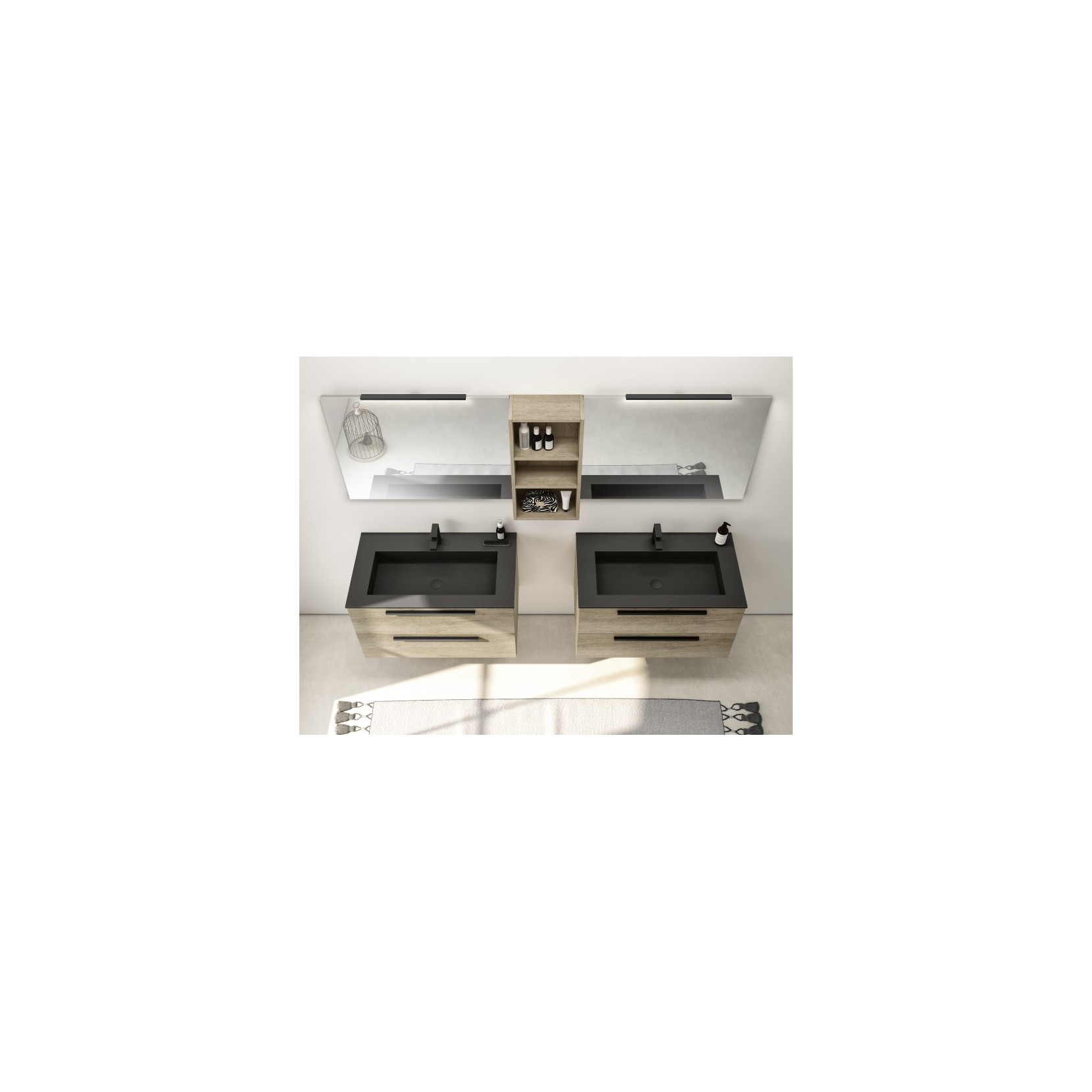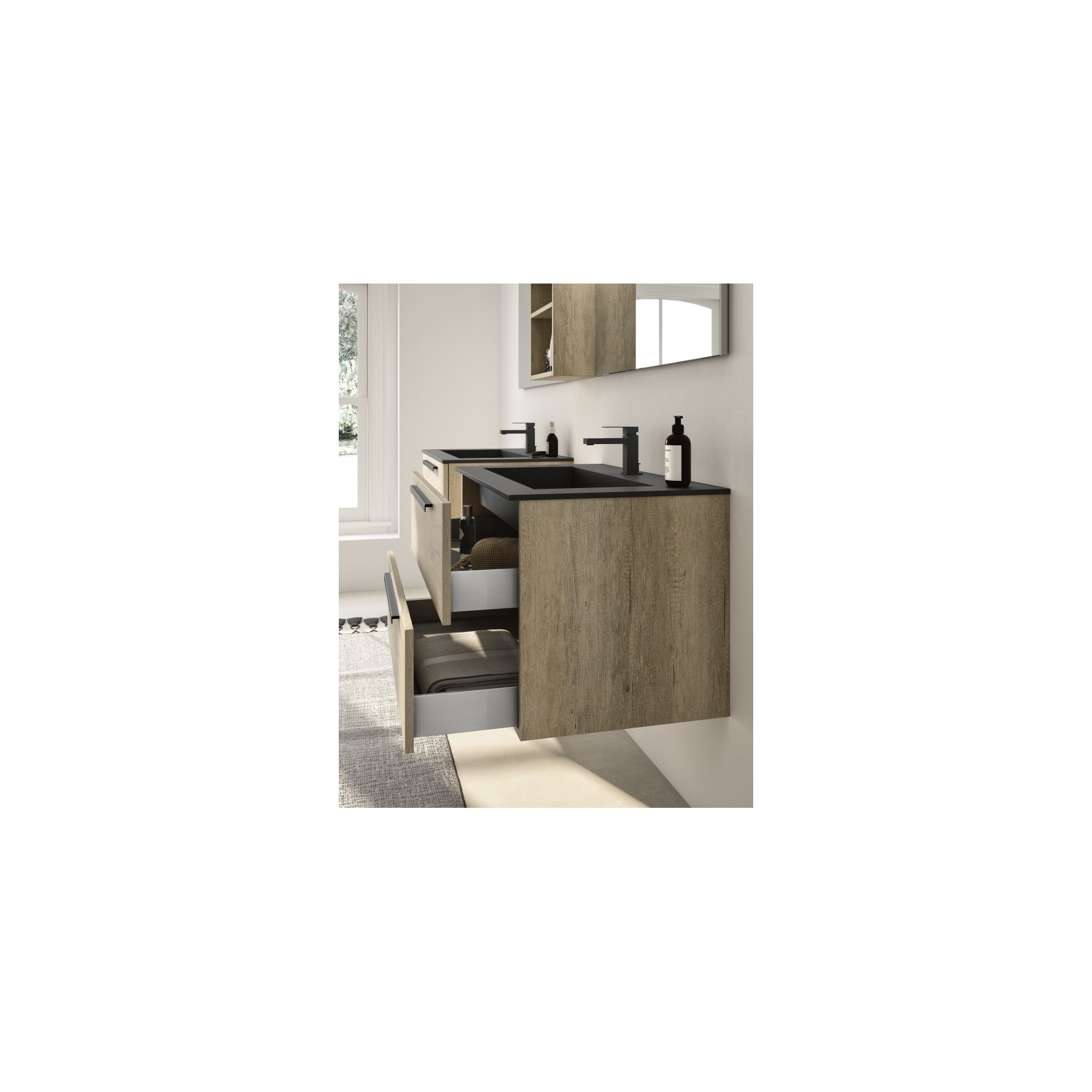 Portalavabi in essenza 948 Vintage Avana con maniglie G59.481 in metallo laccato opaco 033 Nero; top in finitura Tecnolam 251 Nero Ingo.