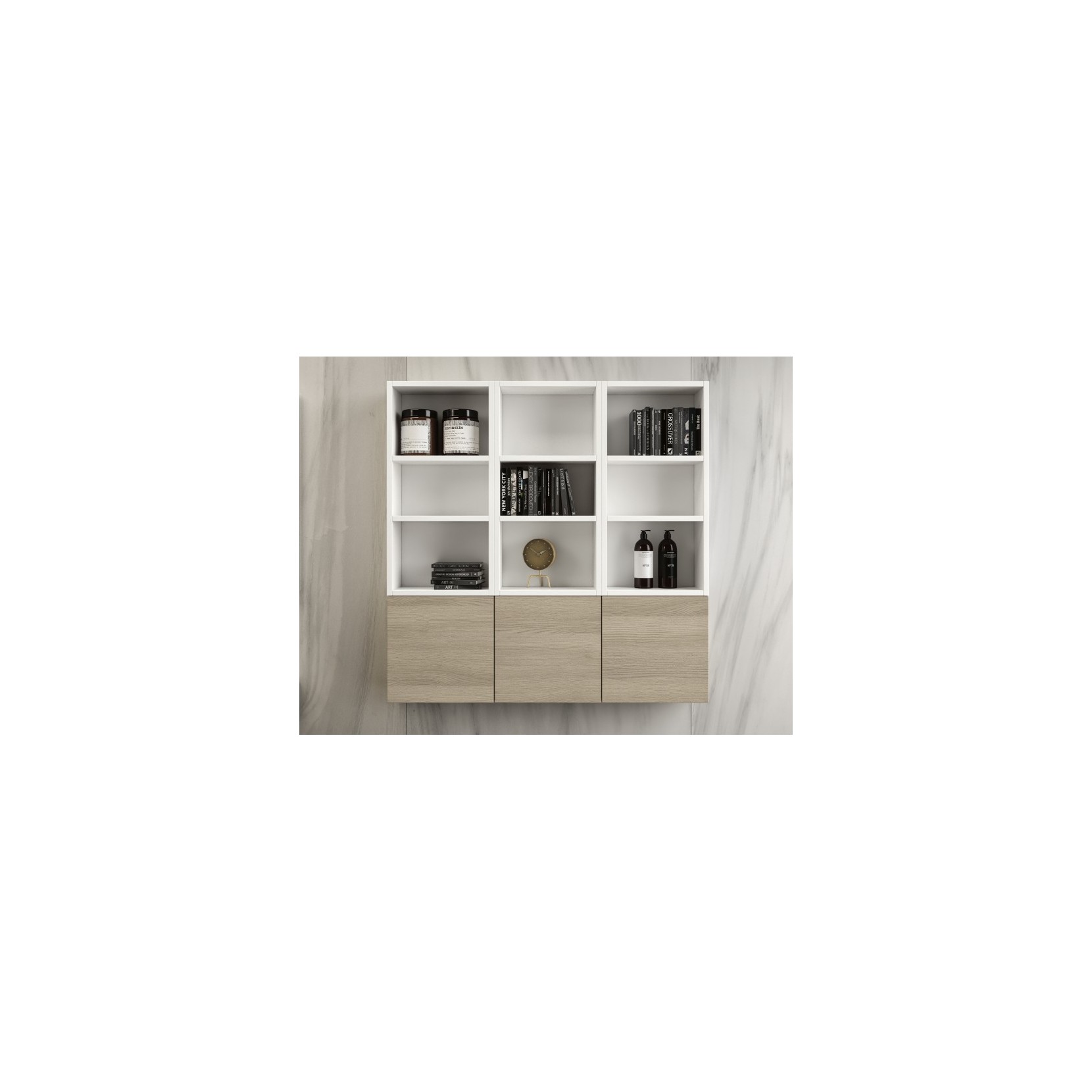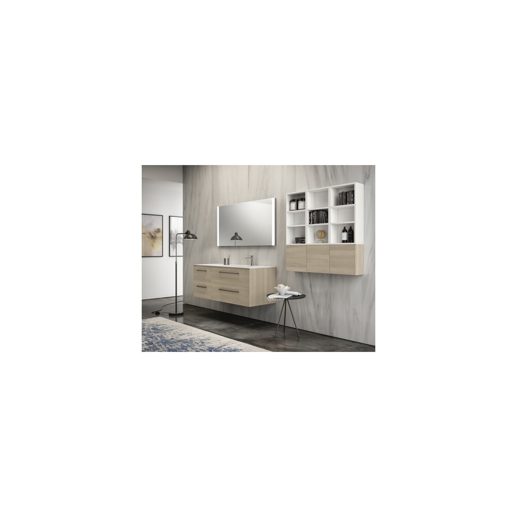 Specchio Vanity; pensili a giorno laccati opaco 088 Bianco Venere, pensili in essenza 947 Olmo Biondo.