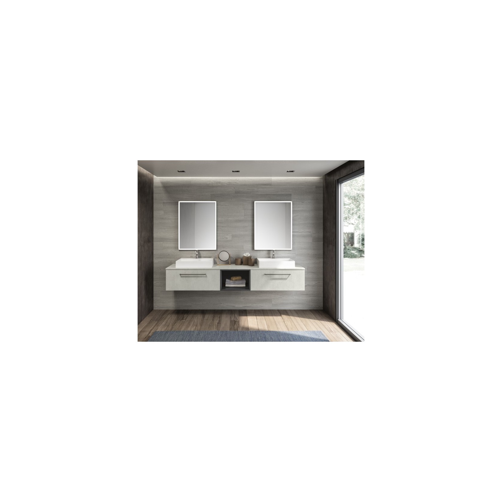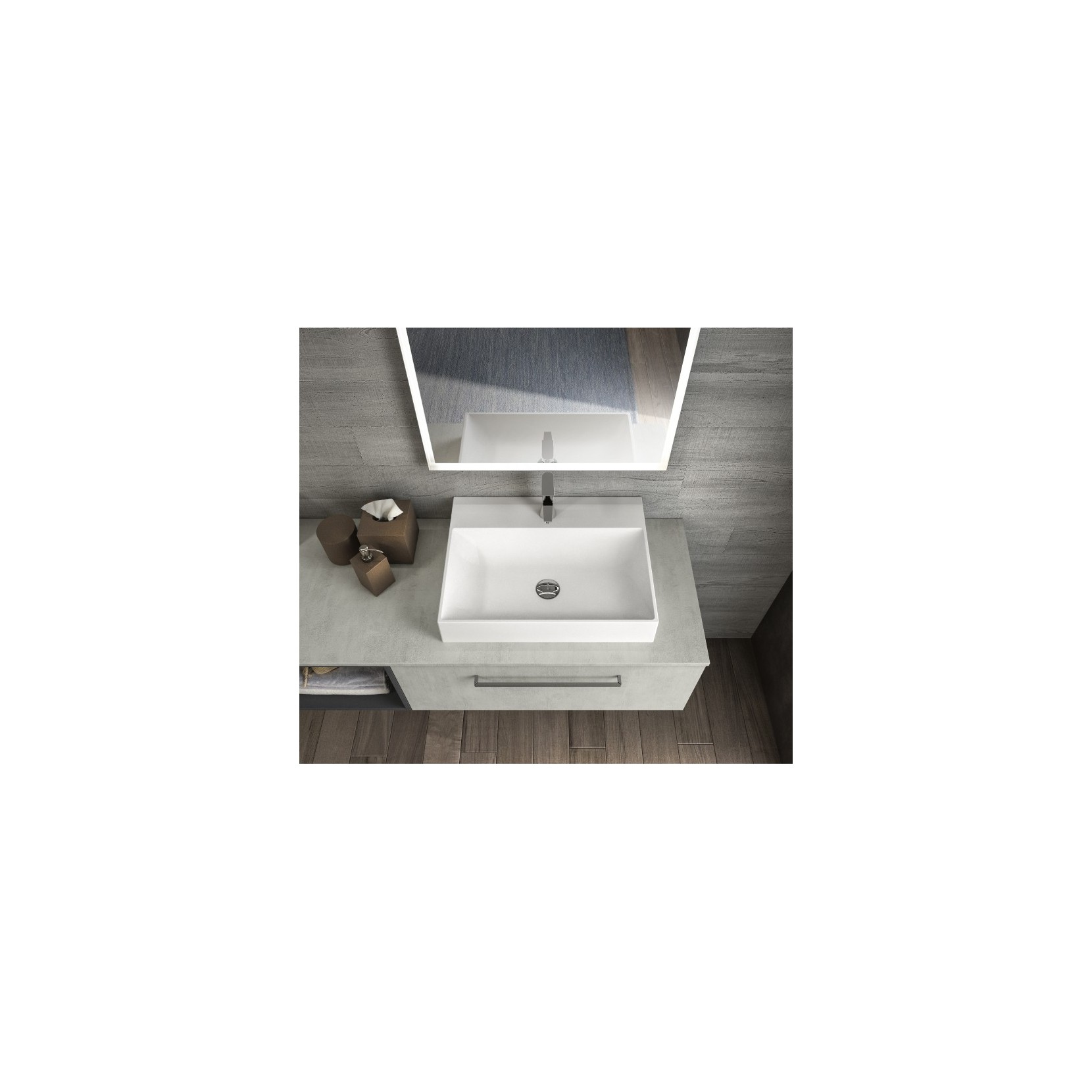 Portalavabo in nitura 959 Beton con maniglia G61, top in 70 70 finitura 959 Beton con lavabo soprapiano in resina; base a giorno laccato opaco 047 Grafite.