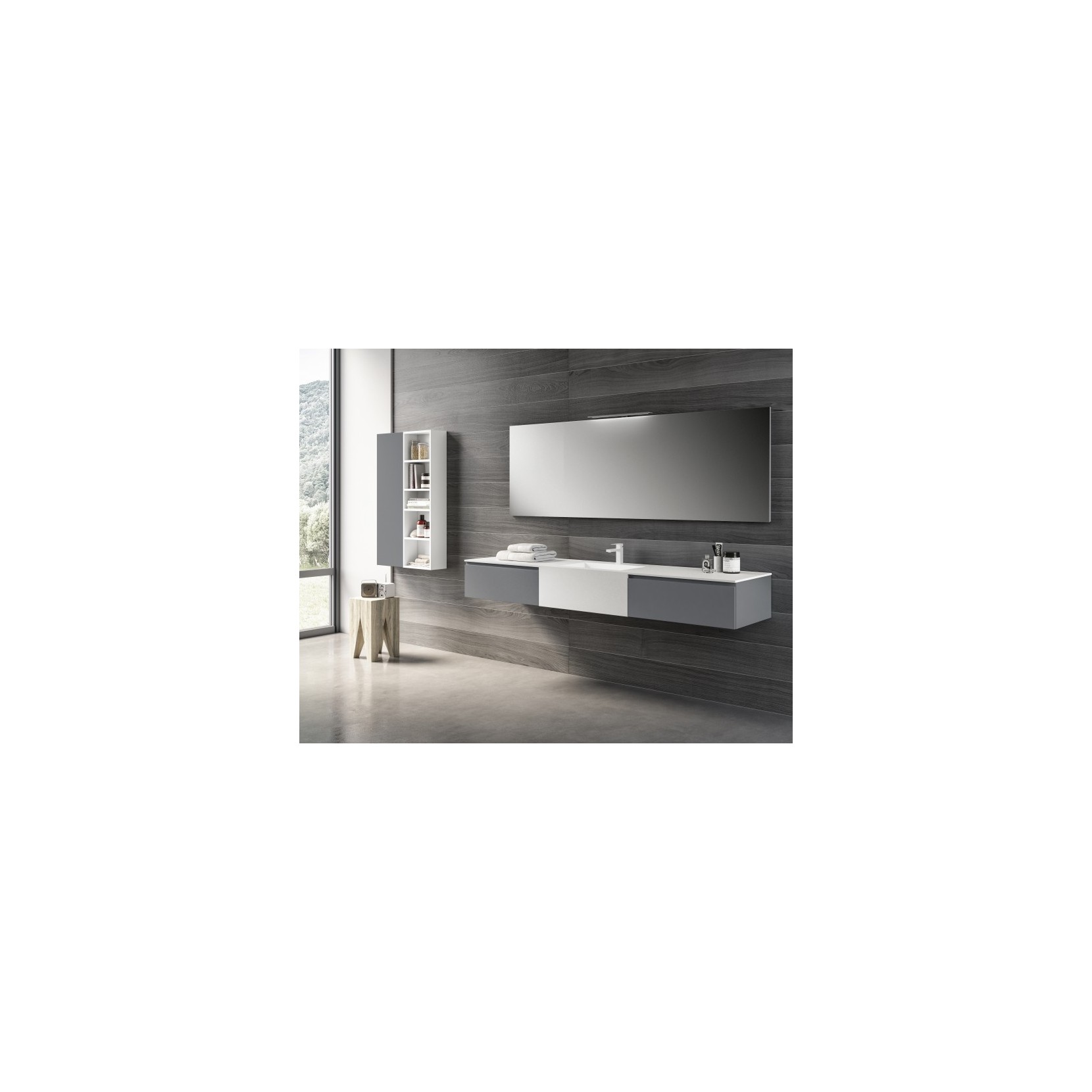 Specchio filo lucido con lampada Flat 500. Pensile a giorno laccato opaco 017 Latte, pensile laccato opaco 067 Manathan.