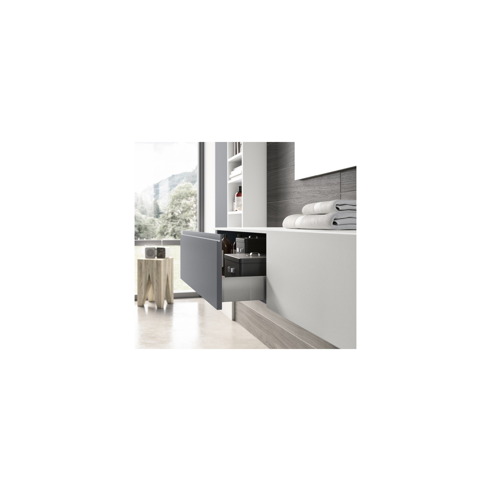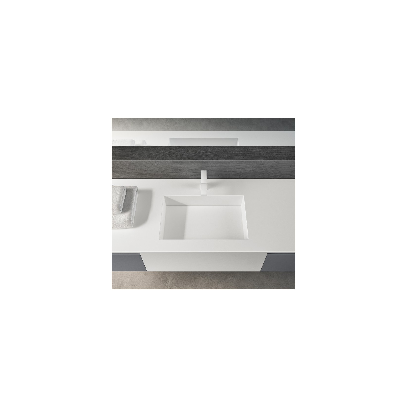 Top in Tecnolite bianco con vasca fusa, basi laccate opaco 067 Manhattan con presa maniglia.