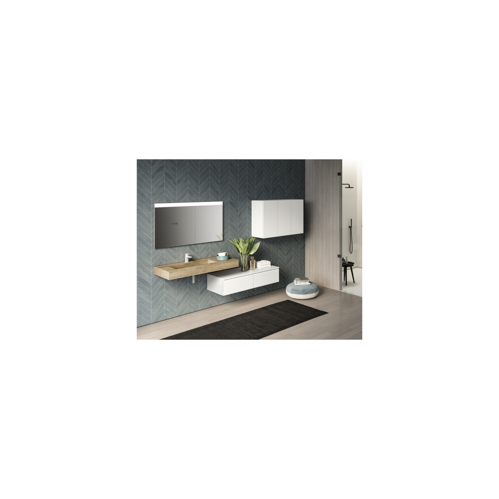 Top scatolato in Tecnolam 254 Rovere Slavonia, basi laccate opaco 017 Latte con presa maniglia. Specchio Flash con illuminazine a LED, pensili laccati opaco 017 Latte.