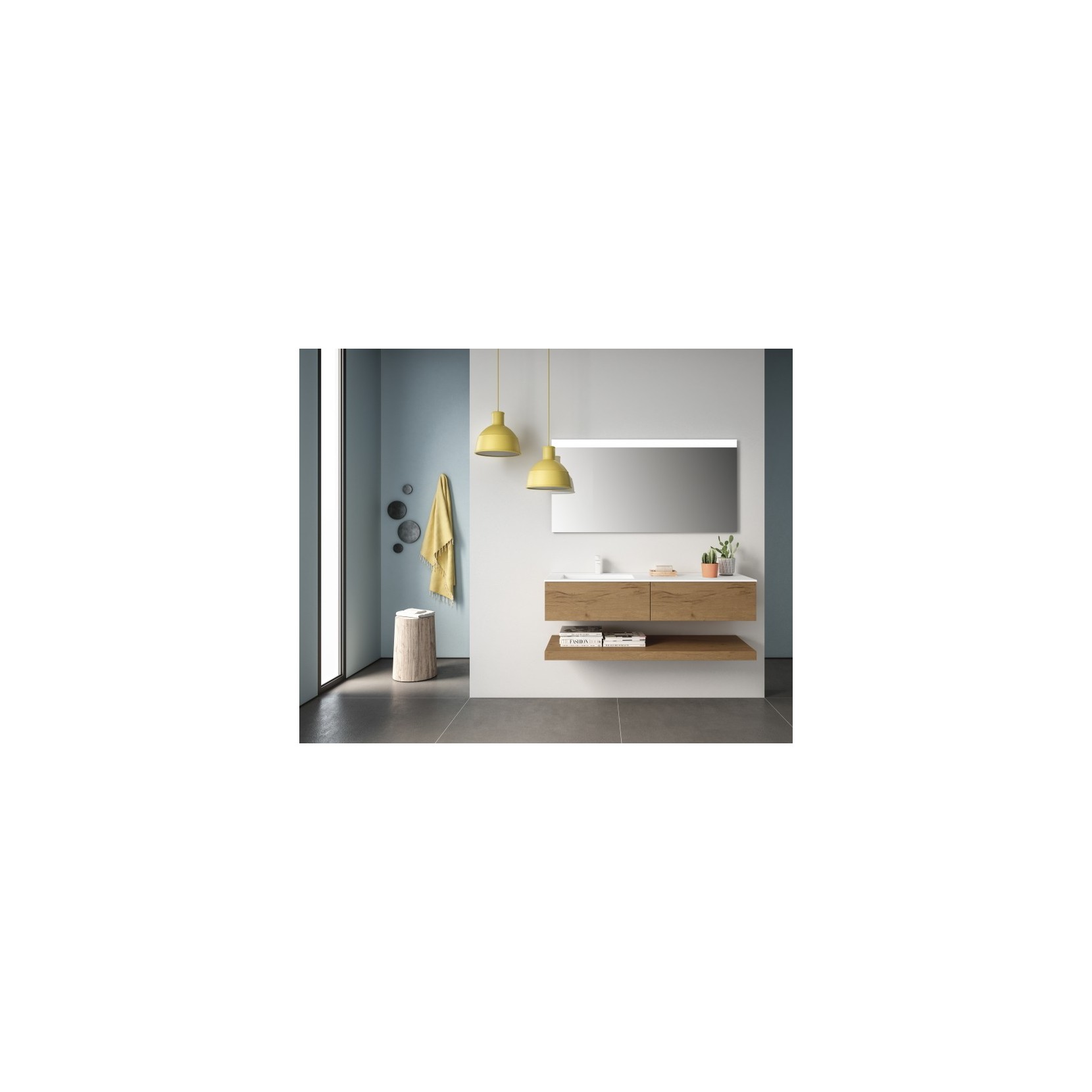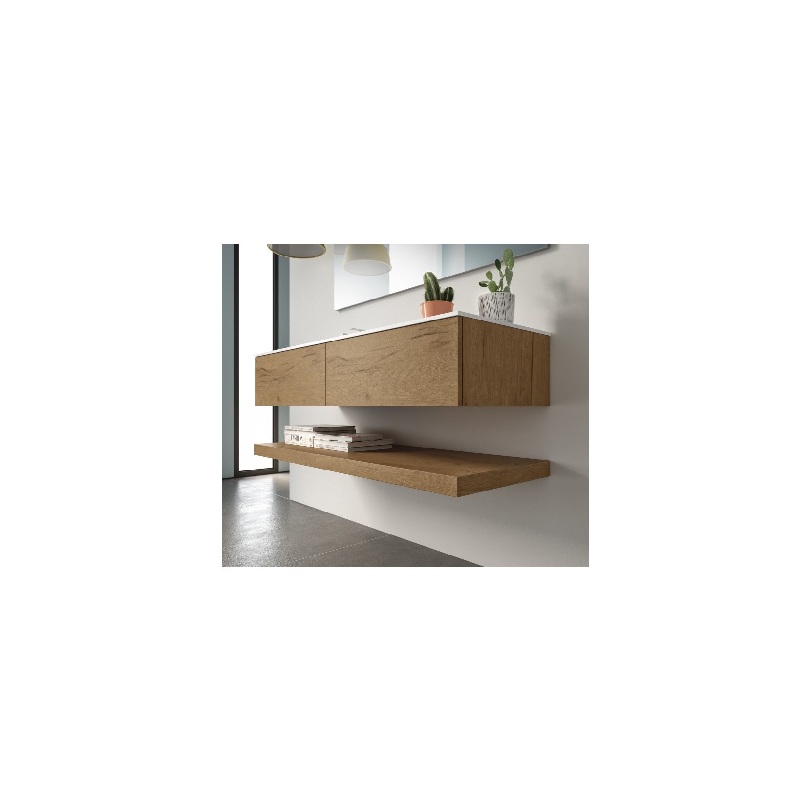 Portalavabo e base in essenza 961 Nativo Cotto, top in Tecnolite bianco. Top H5,8 cm in essenza 961 Nativo Cotto; specchio Flash L140 cm.