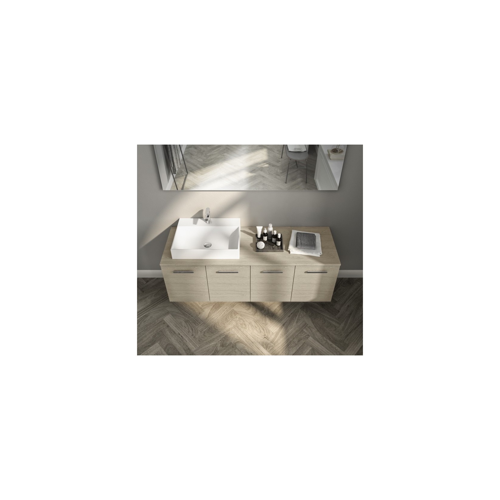 Top in essenza 944 Primitivo Naturale con lavabo soprapiano in resina; specchio filo lucido con lampada Sura 500.
