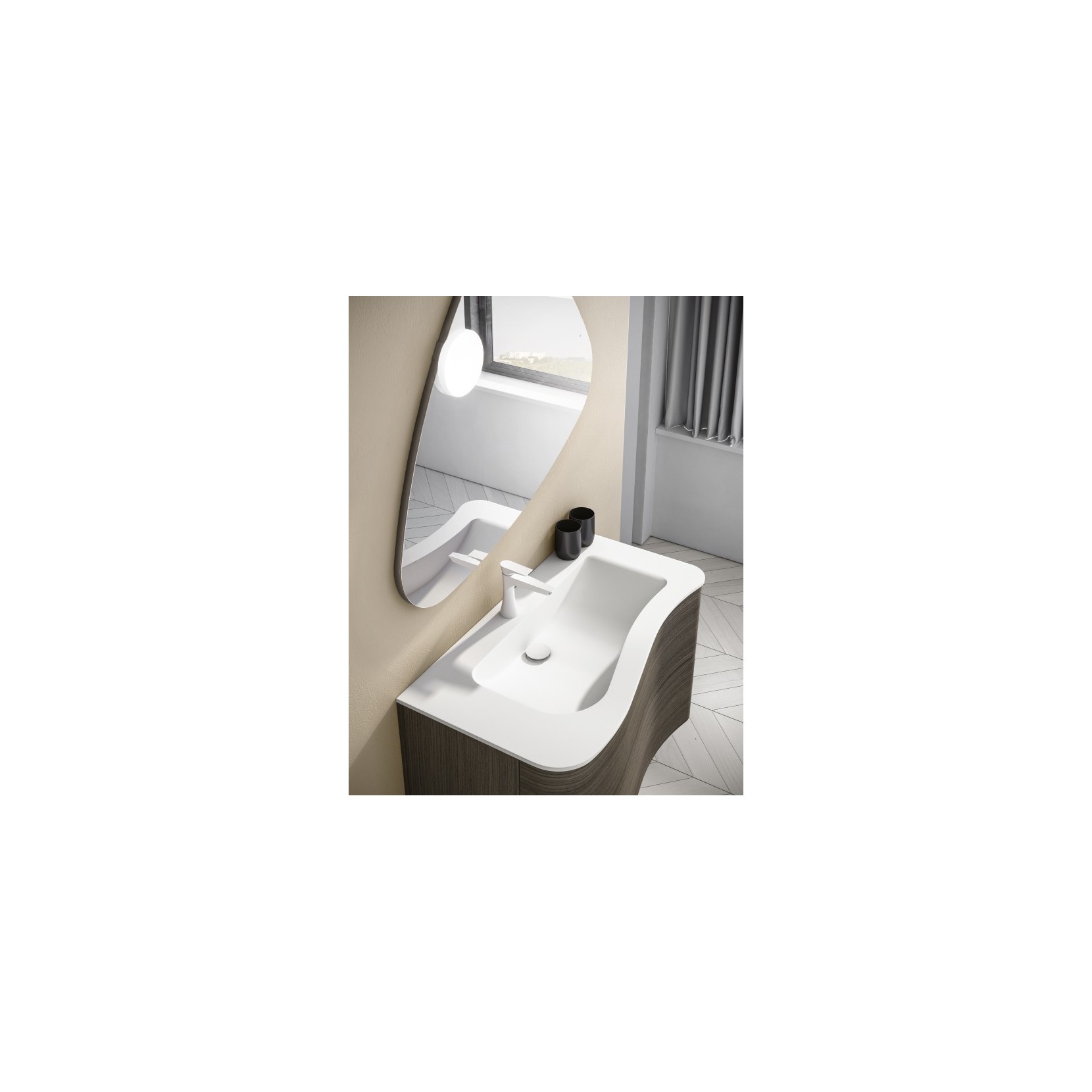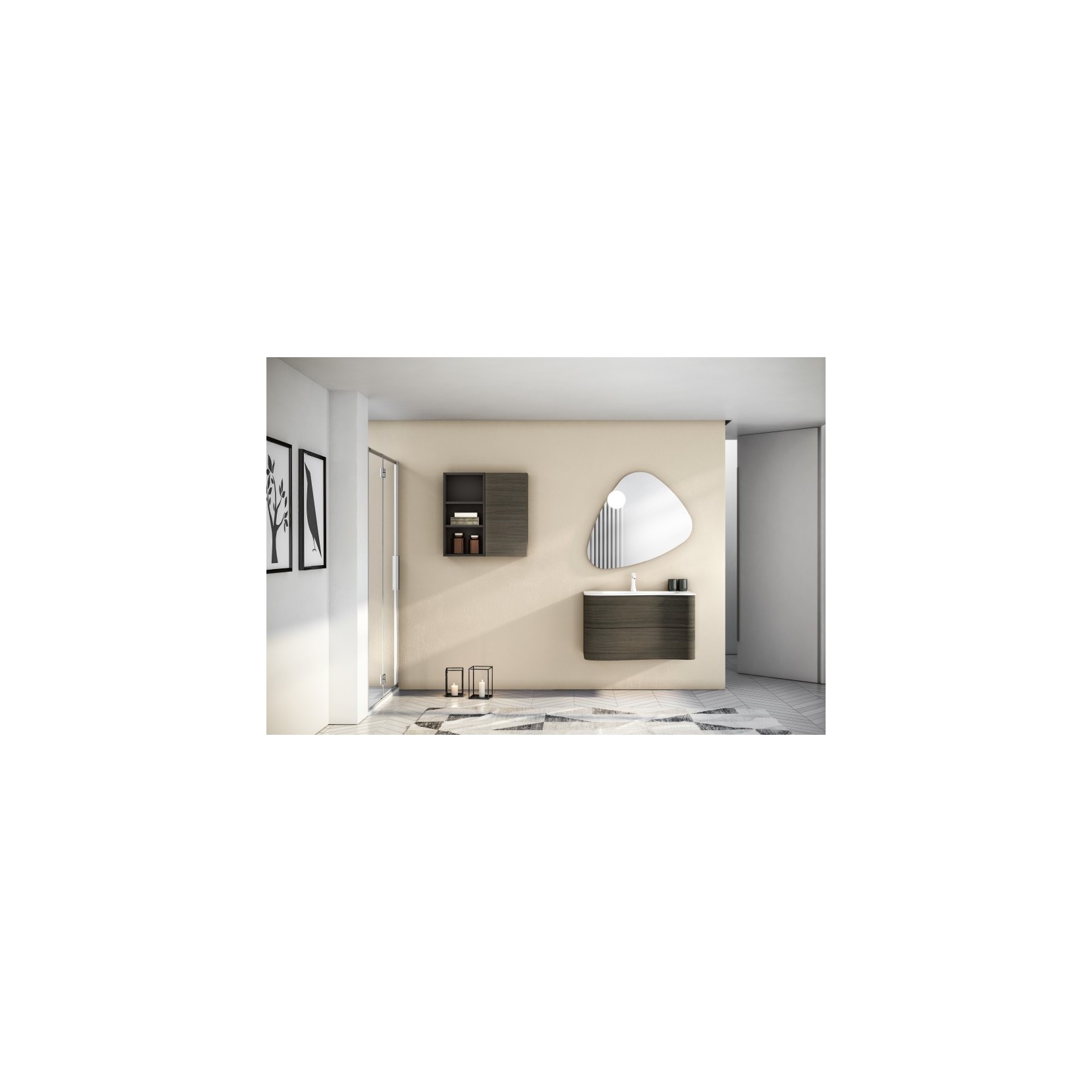 Portalavabo in essenza 967 Rovere Caffè con apertura push pull; top in Tecnolite bianco; specchio Renè con lampada Focus.