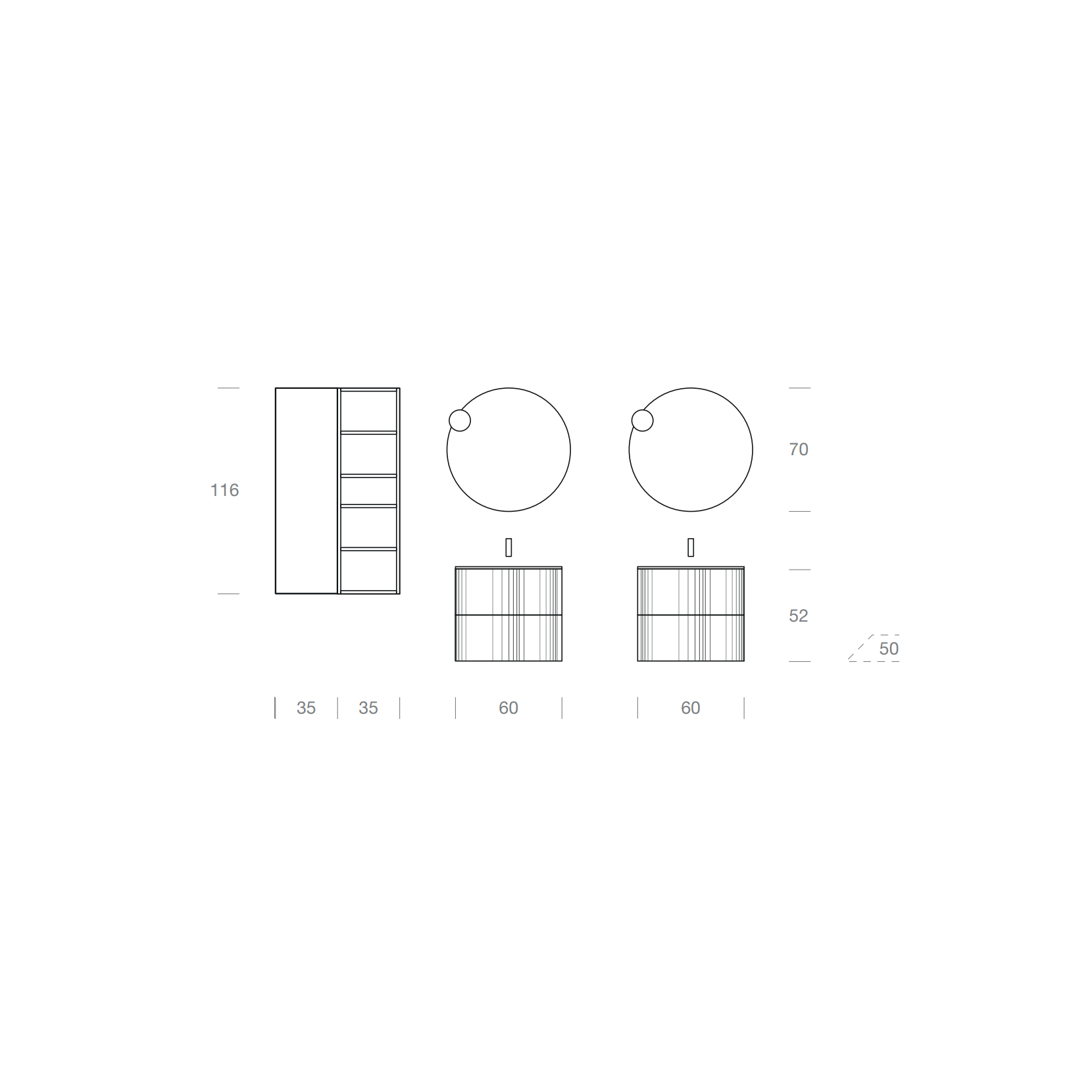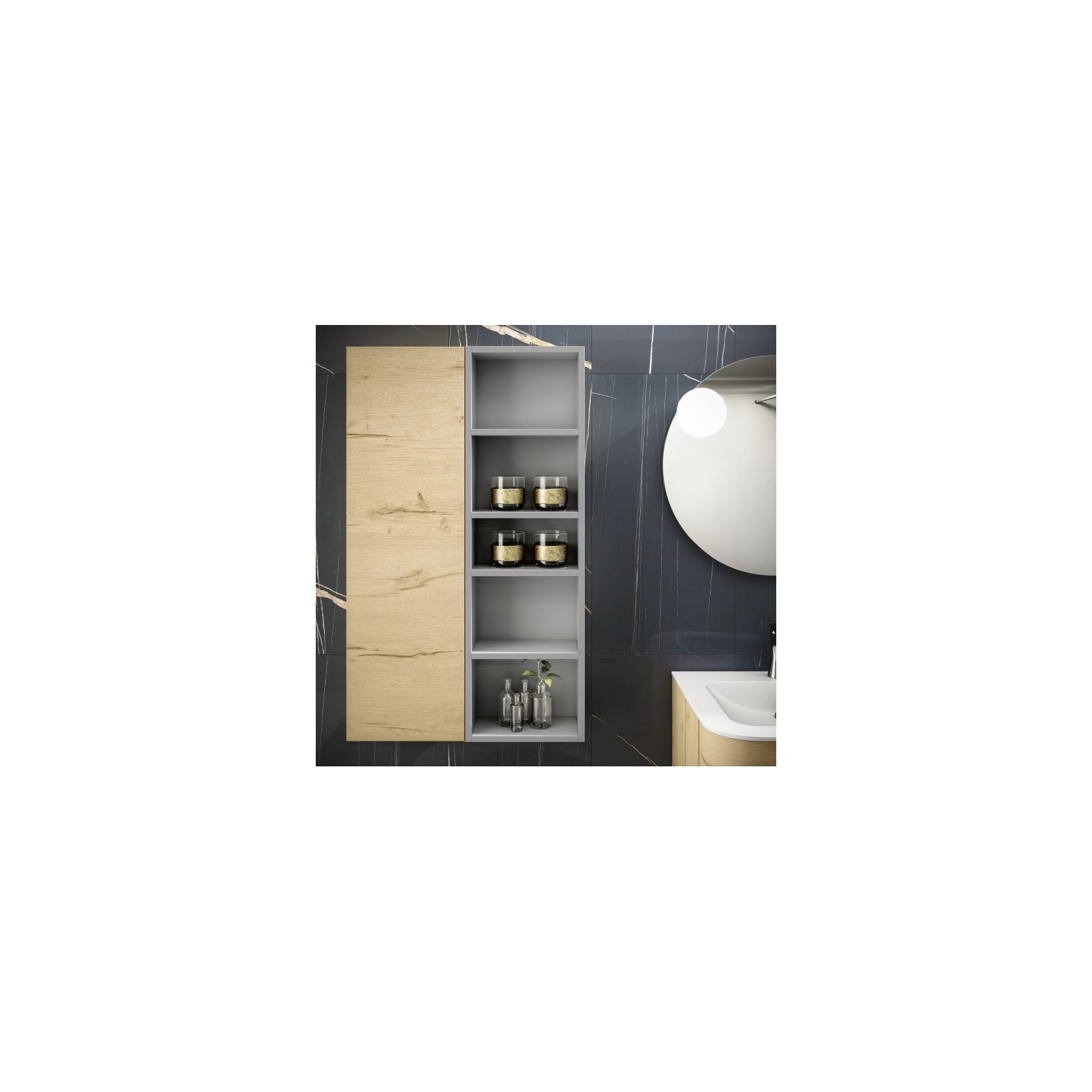 Specchio Circle con lampada Focus. Pensile in essenza 960 Nativo Naturale, pensile a giorno laccato opaco 048 Cenere.