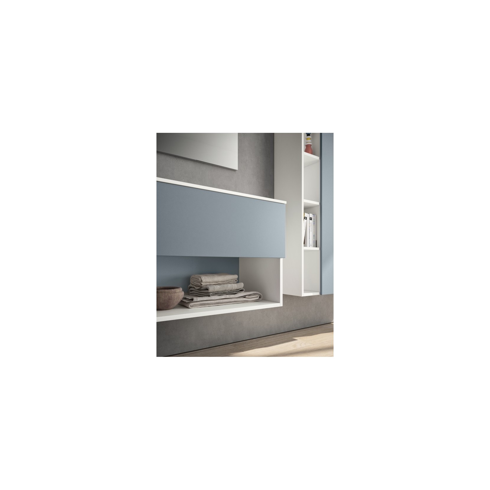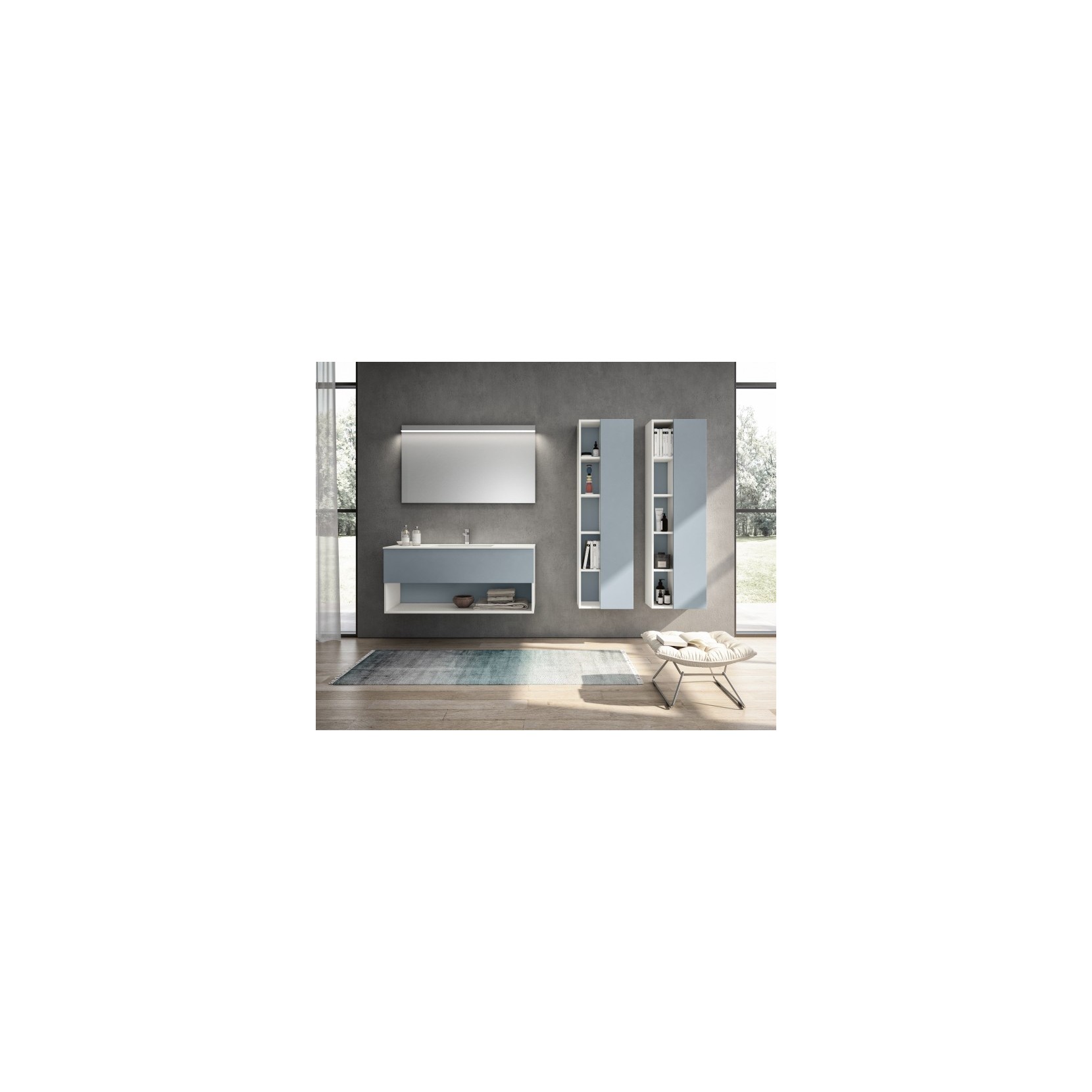 Specchio Up con illuminazione LED; colonne con anta e schienale laccati opaco 086 Ponente