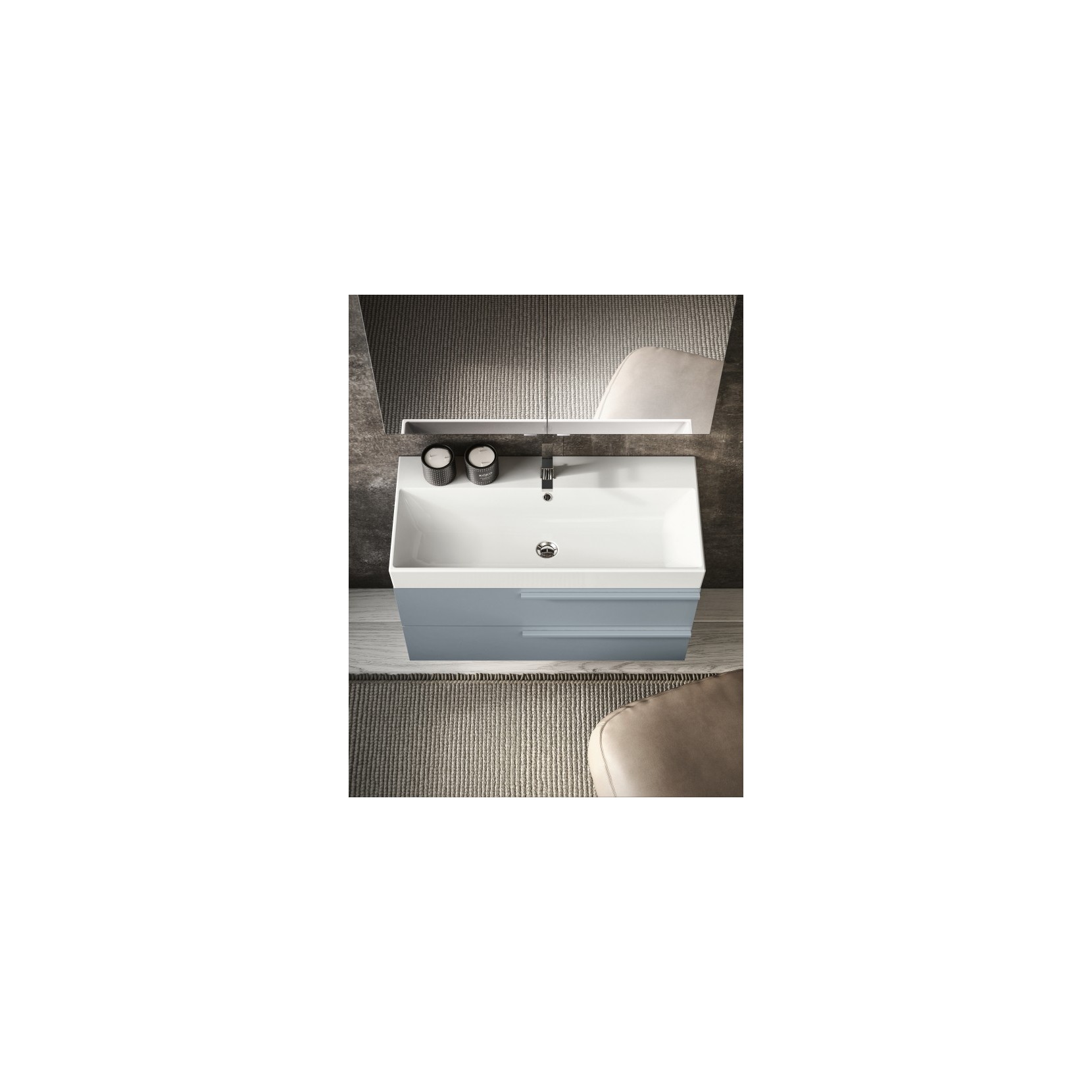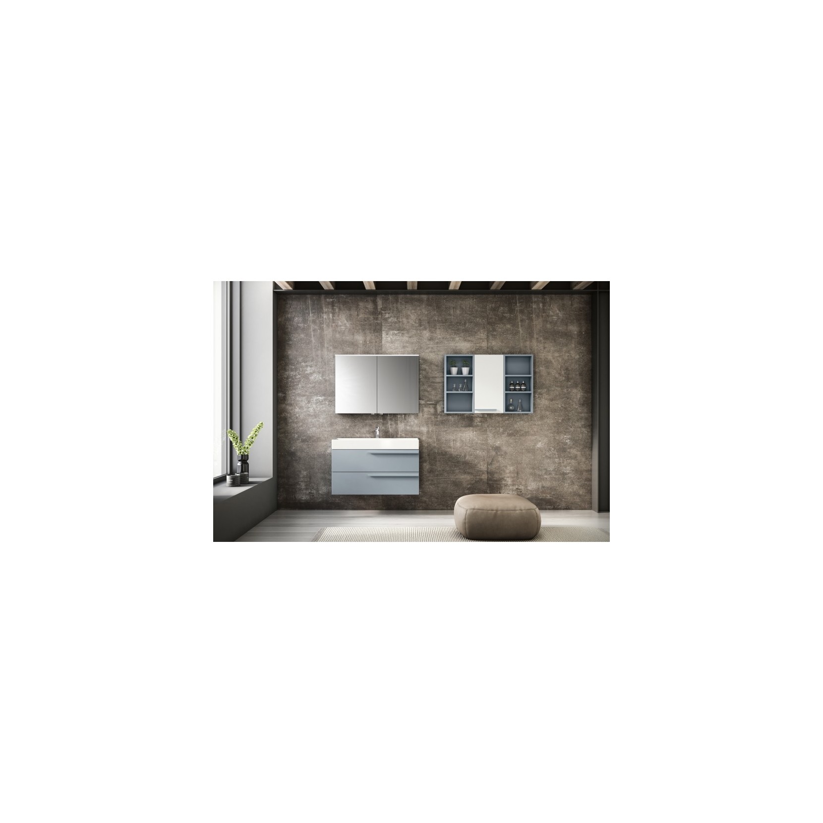 Portalavabo laccato opaco 086 Ponente con lavabo in ceramica e specchio contenitore. Pensile laccato opaco 017 Latte e pensili a giorno laccati opachi 086 Ponente.