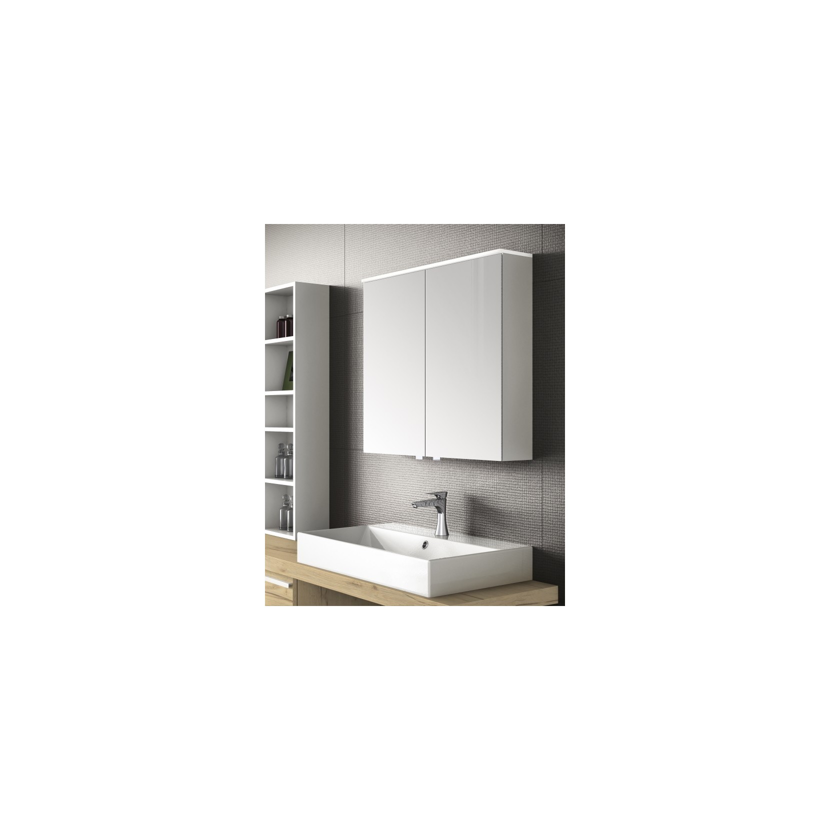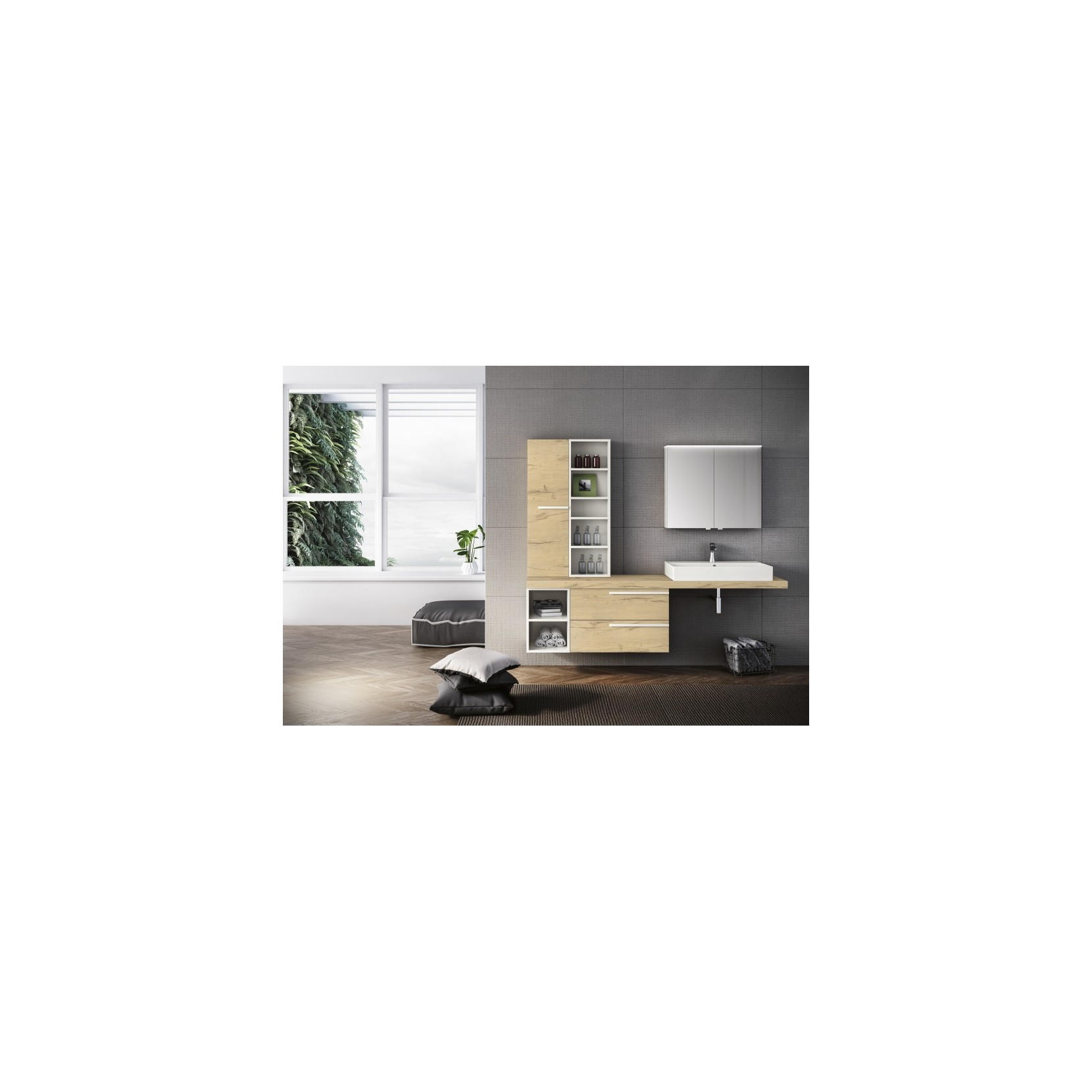 Specchio contenitore con pensile in essenza 960 Nativo Naturale e pensile a giorno laccato opaco 017 Latte.