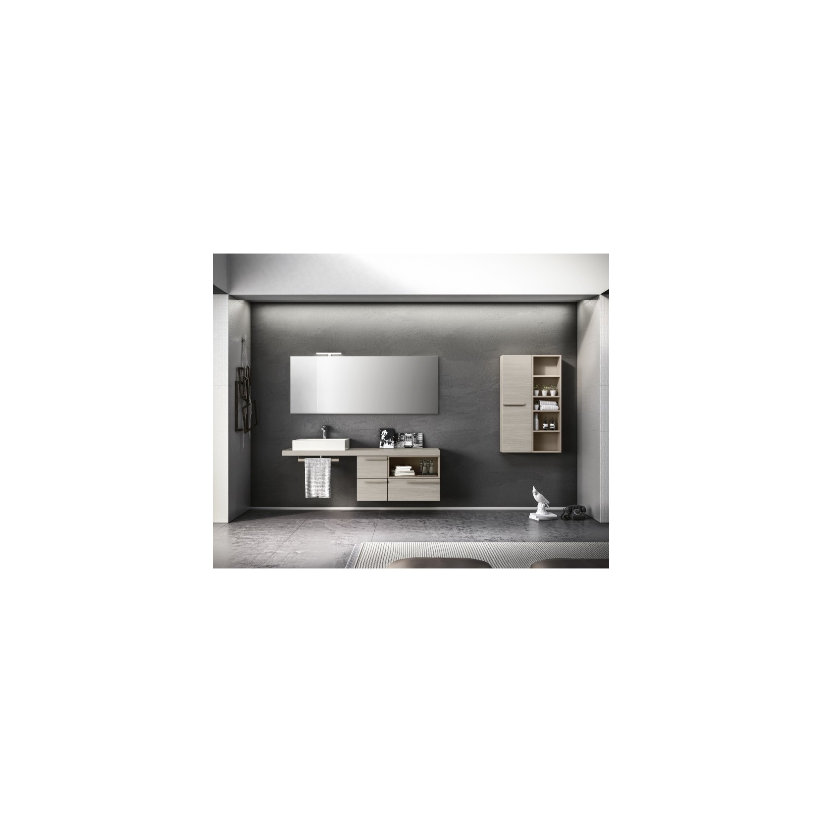 Specchio filo lucido con pensile in essenza 969 Rovere Silver e pensile a giorno laccato opaco 045 Tortora; lampada Fold con illuminazione LED.