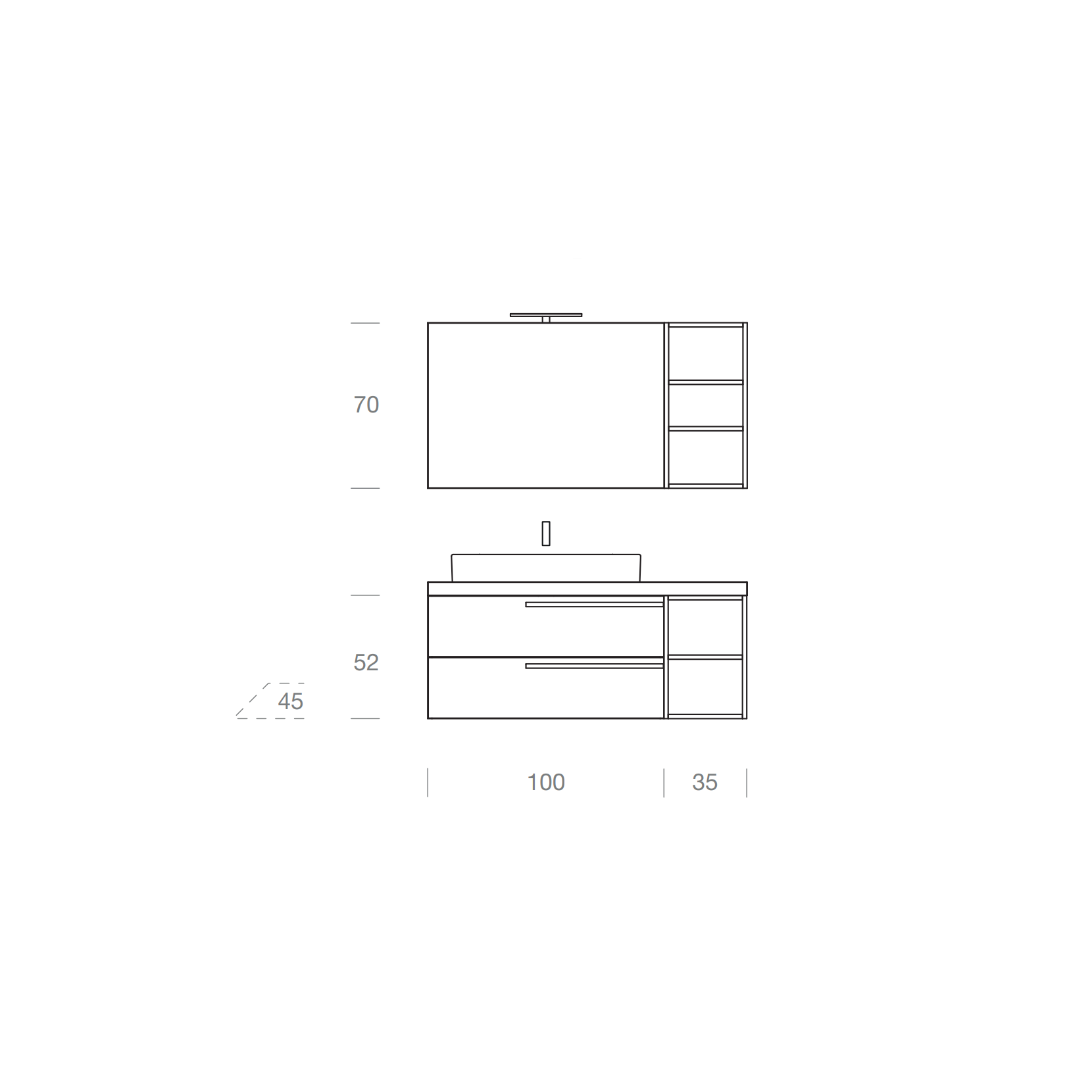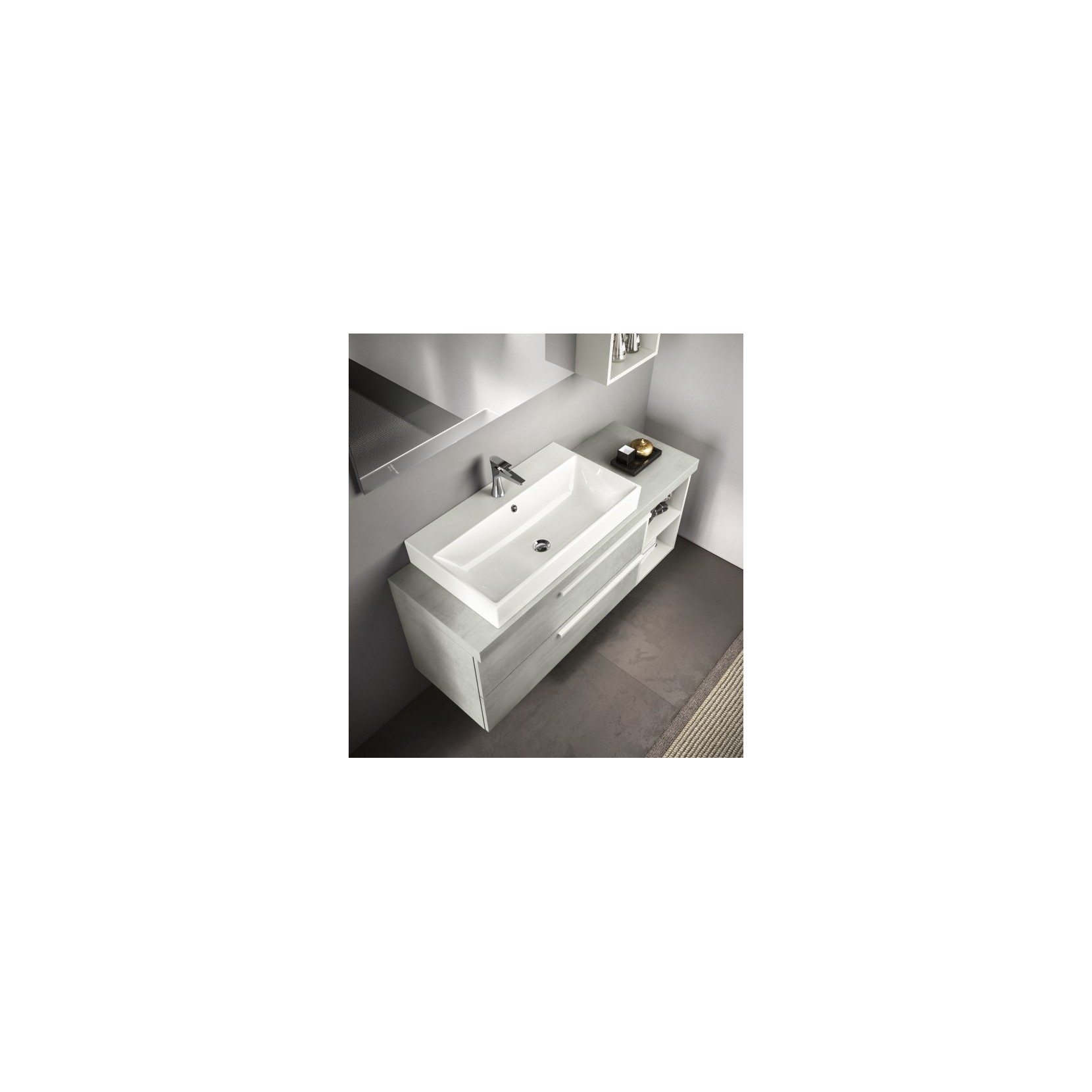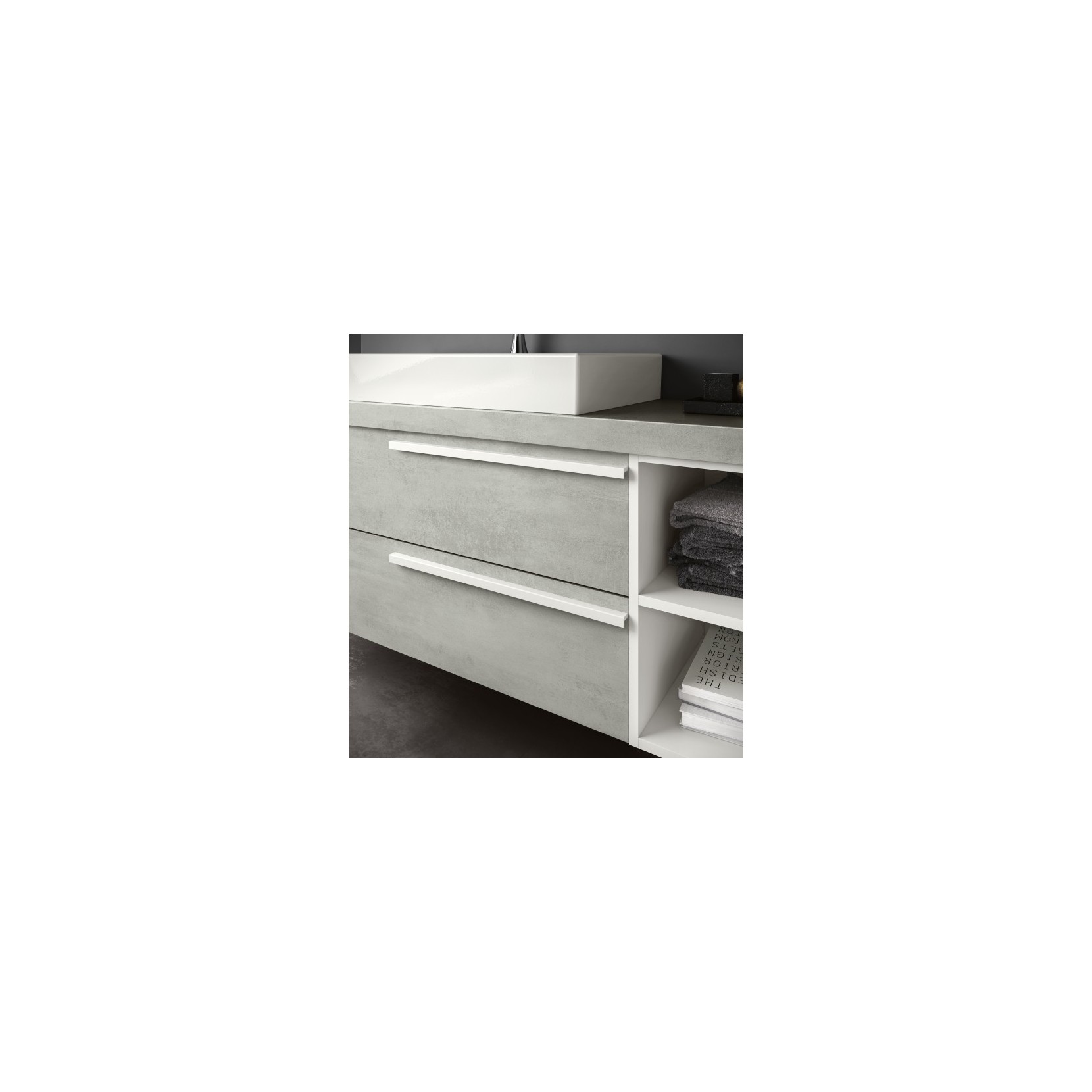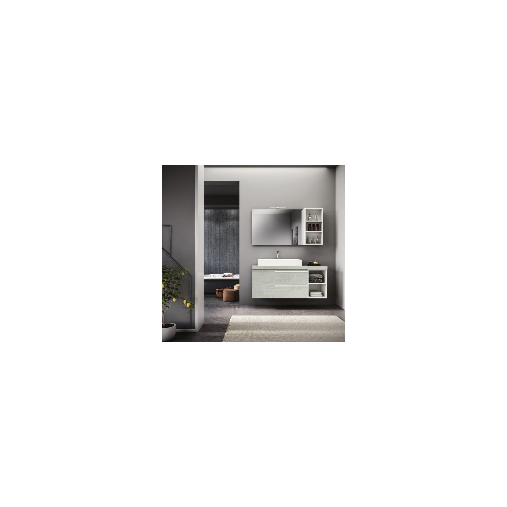 Portalavabo in finitura 959 Beton e base a giorno laccate opaco 017 Latte; top in finitura 959 Beton con lavabo in appoggio in ceramica.