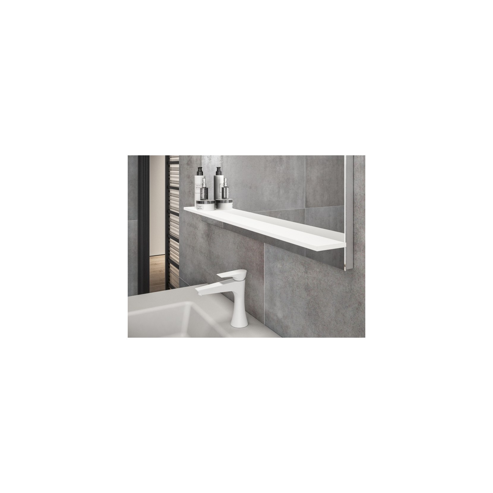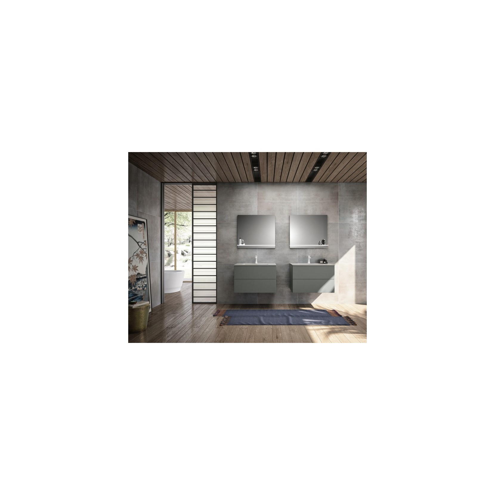 N. 01 Portalavabo laccato opaco 070 Mirto con presa maniglia laterale in metallo laccato opaco bianco; top in Solid Glass. Specchio Line con illuminazione a LED.