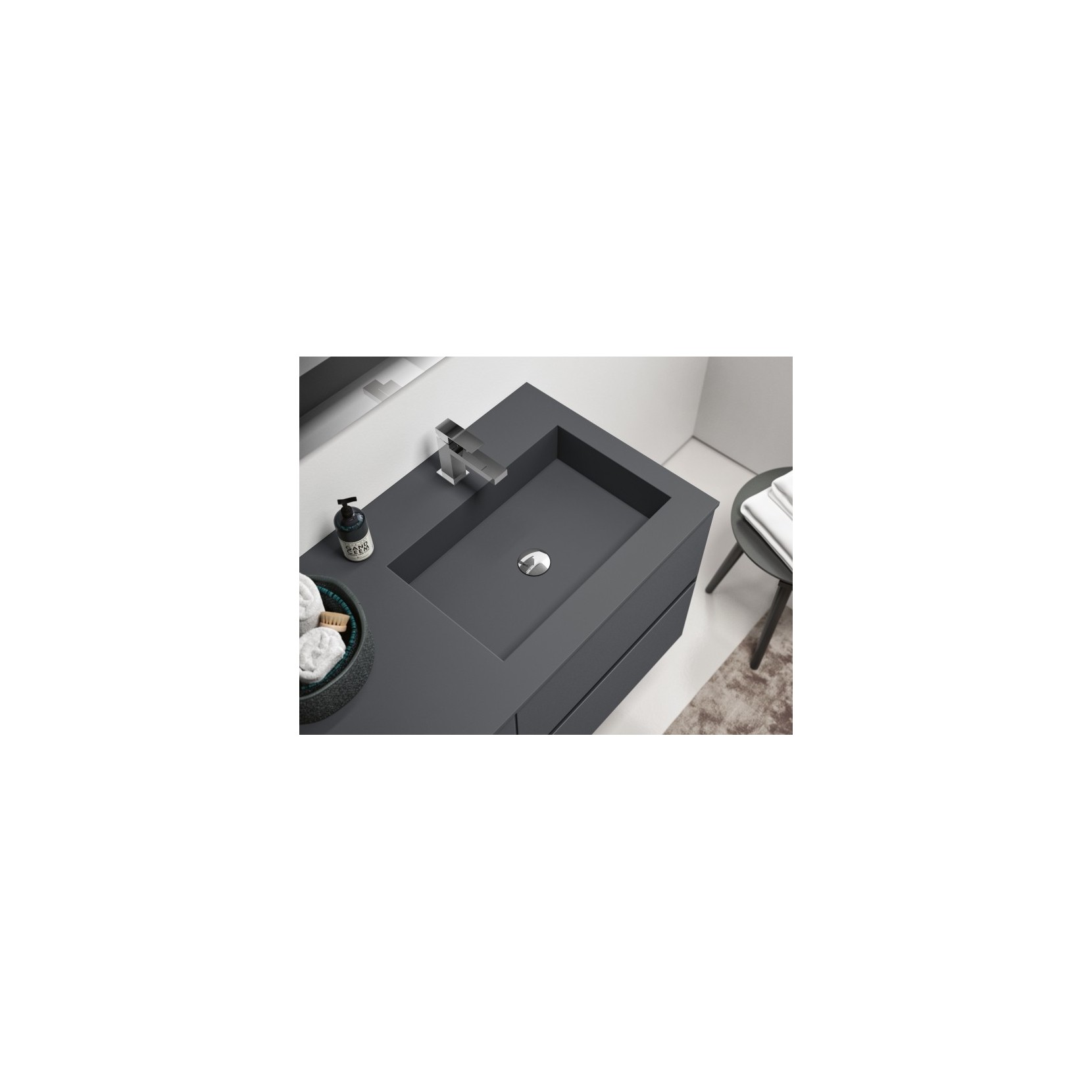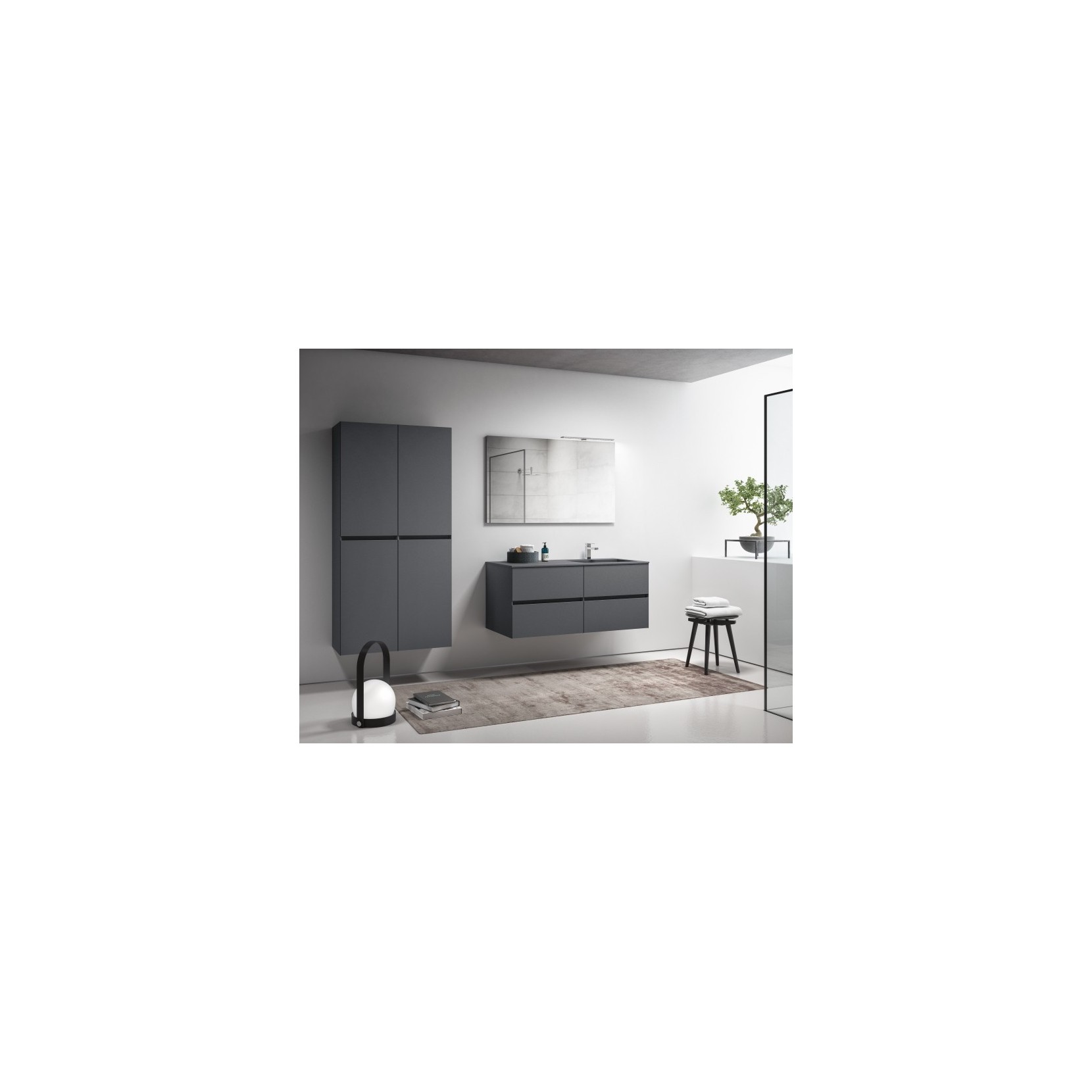 Portalavabo, base e top in Tecnolam 253 Grigio Bromo. Specchio filo lucido con lampada Flat 500; colonne in Tecnolam 253 Grigio Bromo