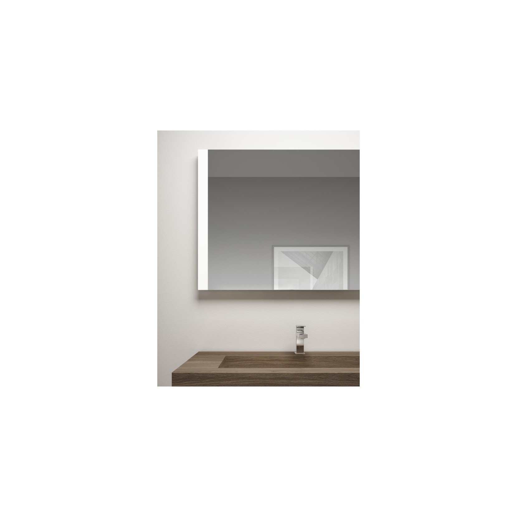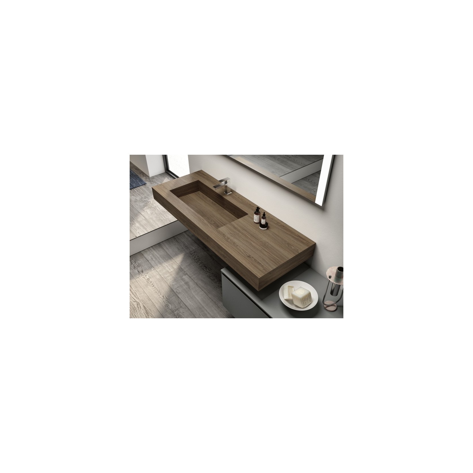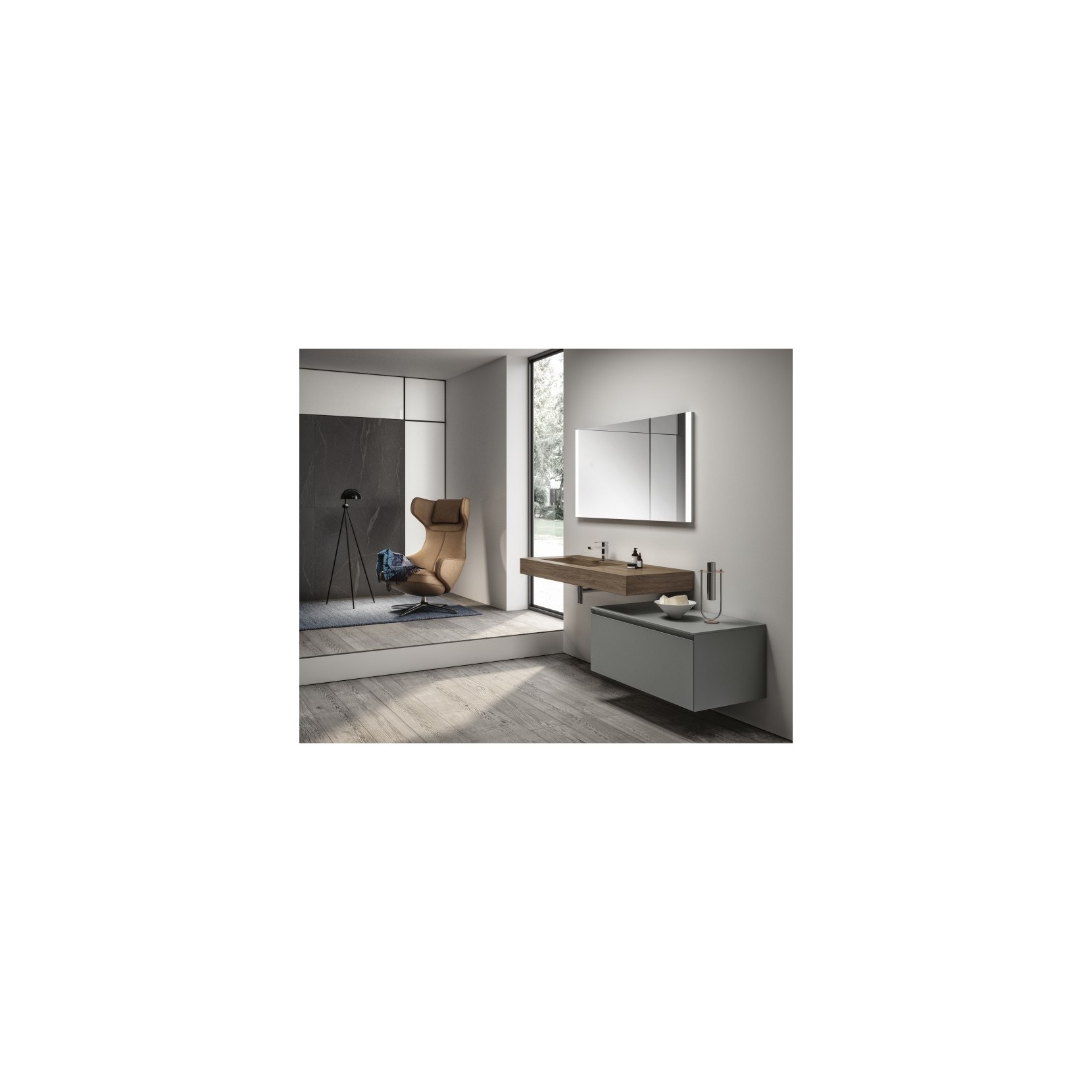 Top scatolato in Tecnolam 256 Noce Savoia, base in finitura Tecnolam 252 Grigio London. Specchio Vanity con illuminazione laterale a LED.
