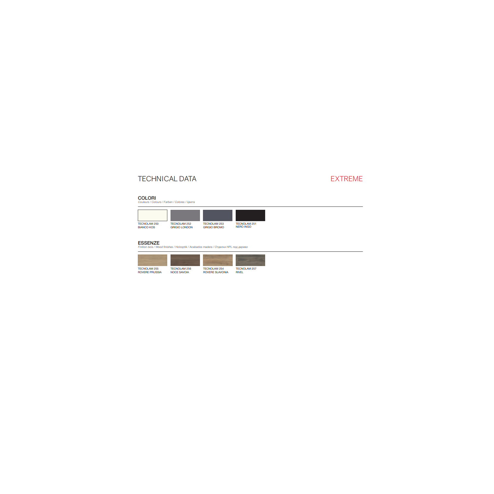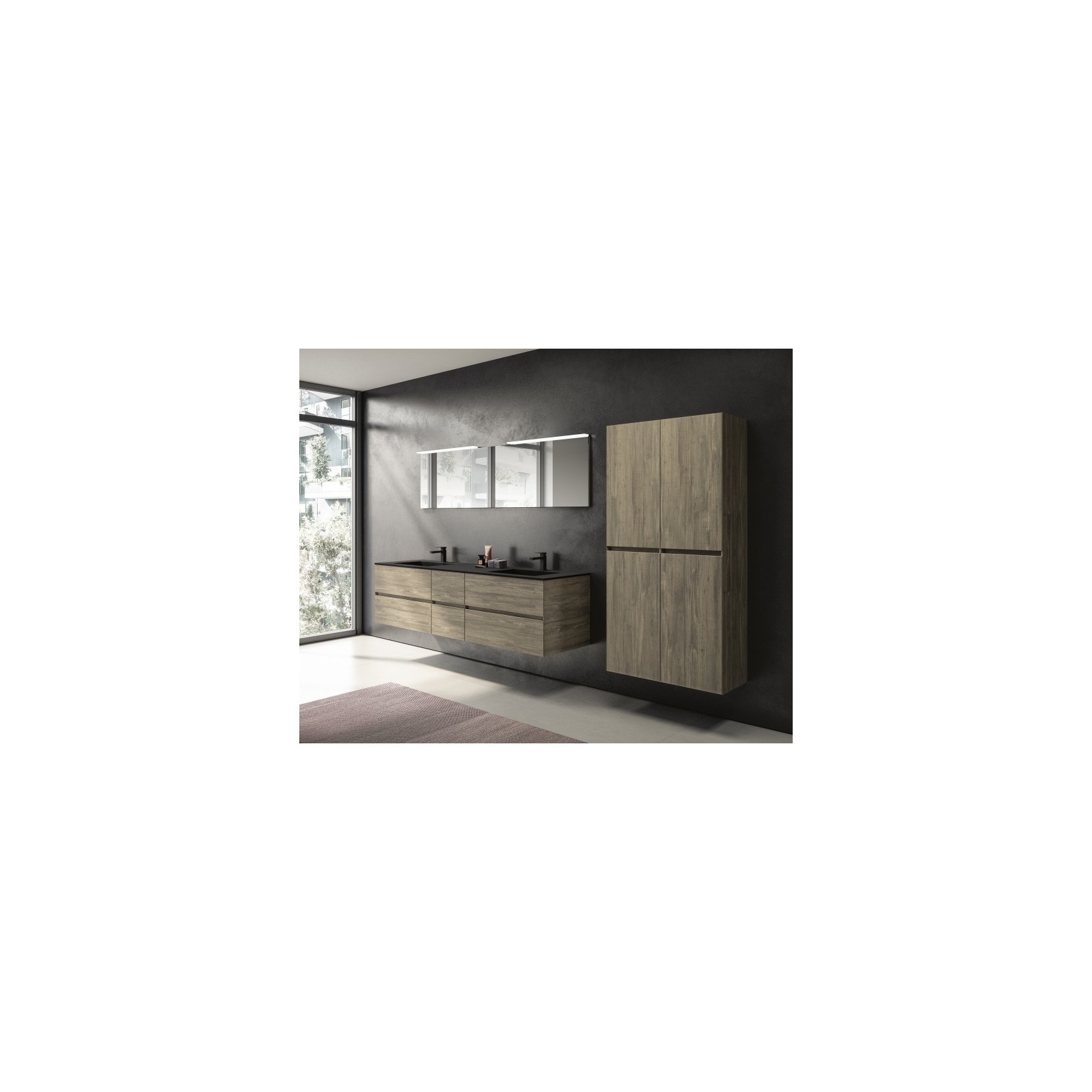 Portalavabi e base in Tecnolam 257 Rivel; top in Tecnolam 251 Nero Ingo. Specchio filo lucido con lampade Slim L80 cm. Colonne in Tecnolam 257 Rivel.