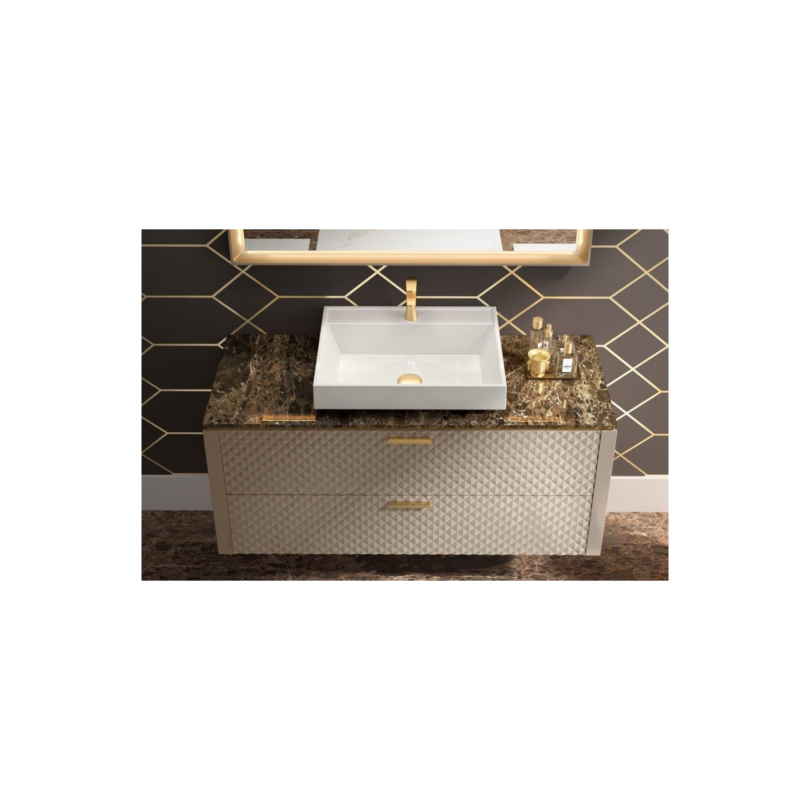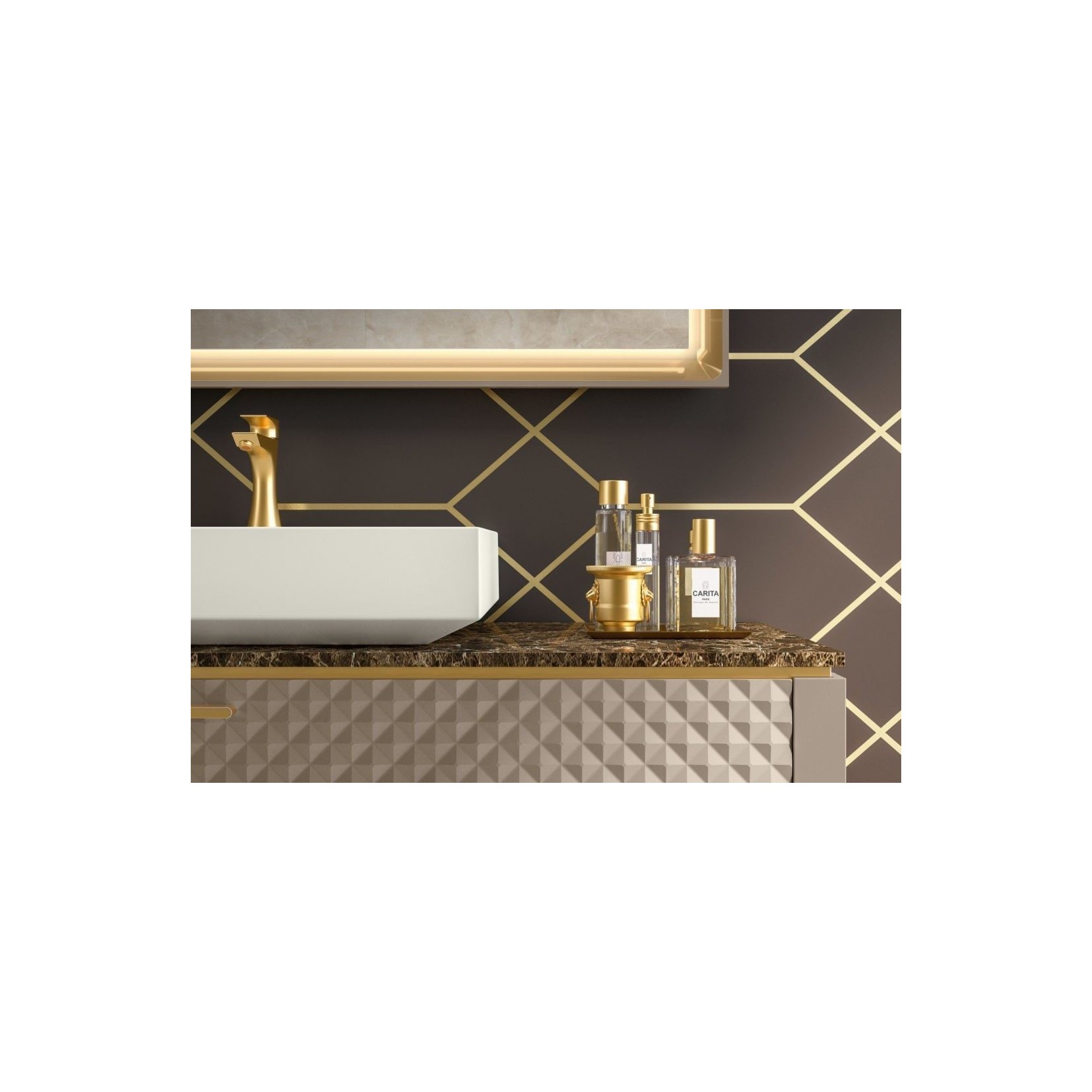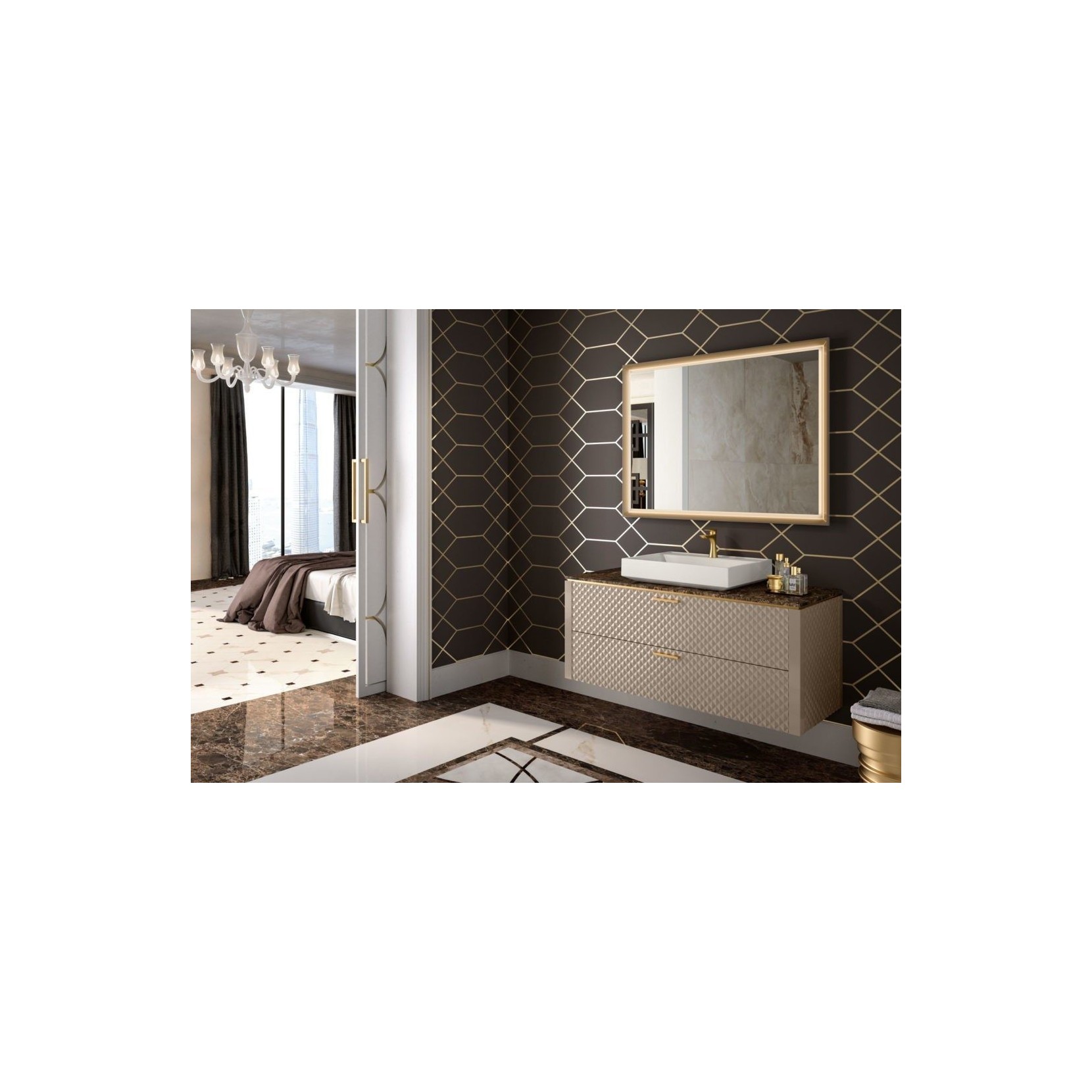 Top in marmo Emperador Dark, sotto top e maniglie oro. Cornice specchio retroilluminato Tortora 045 lucido.